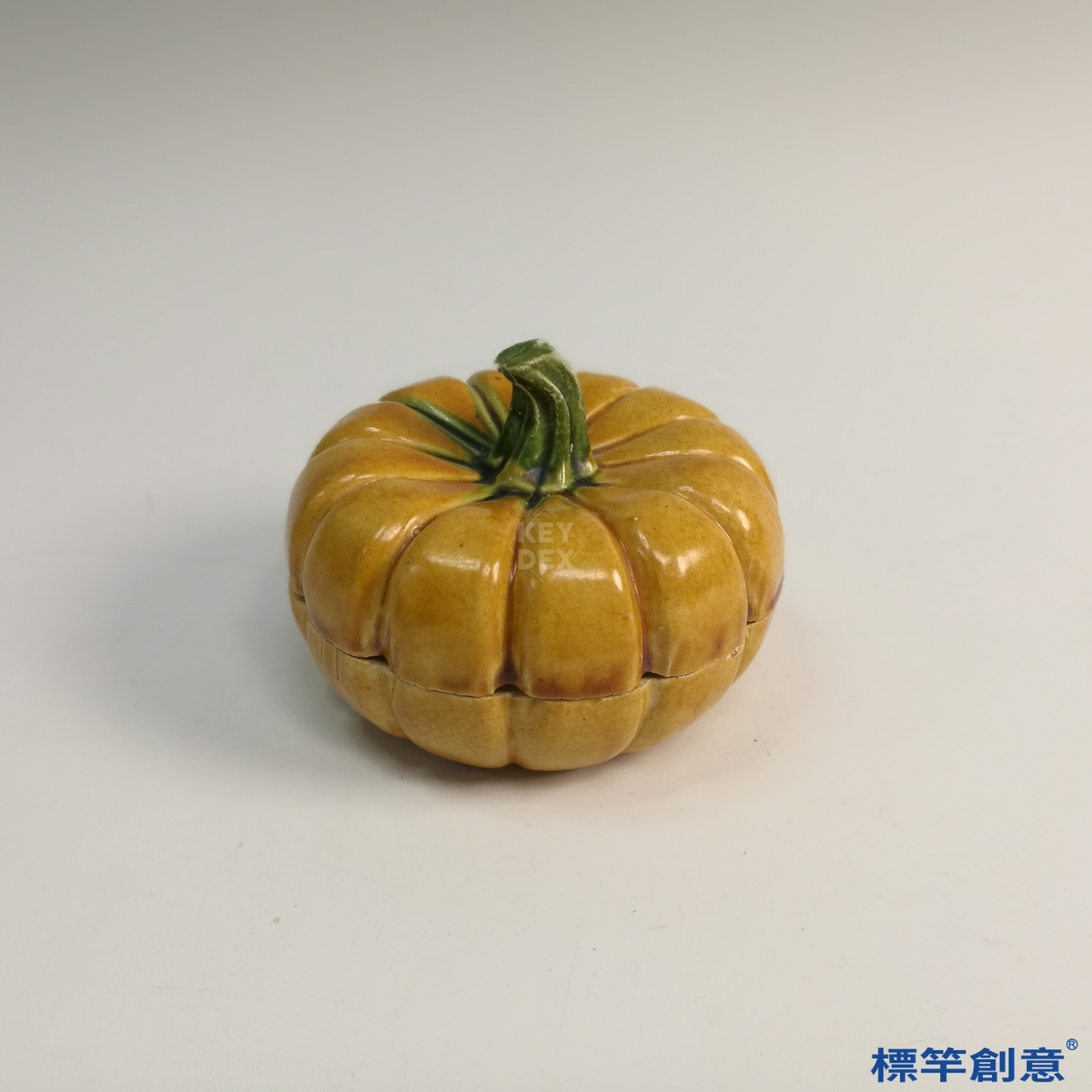 本器通高約 6.5 公分,口徑 9 公分。整體以南瓜為造型,瓜瓣分明,蓋身對接嚴密,器形渾圓飽滿。蓋頂飾以綠釉瓜蒂,具擬真裝飾效果。