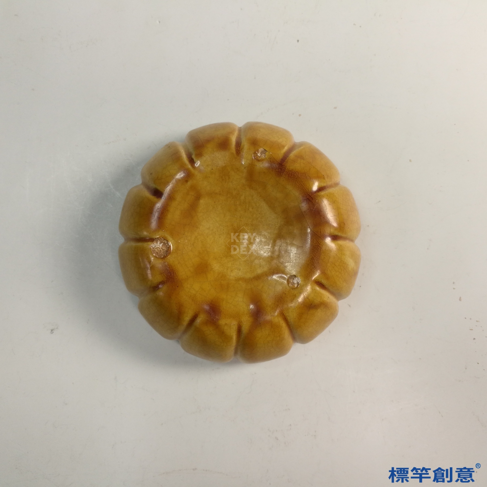 器表施黃釉,局部瓜蒂部位施綠釉裝飾,屬典型唐代鞏義窯黃釉綠彩工藝。釉面光澤溫潤,具玻璃質感。胎質堅致,內壁及盒底皆施釉,屬高溫釉瓷器。