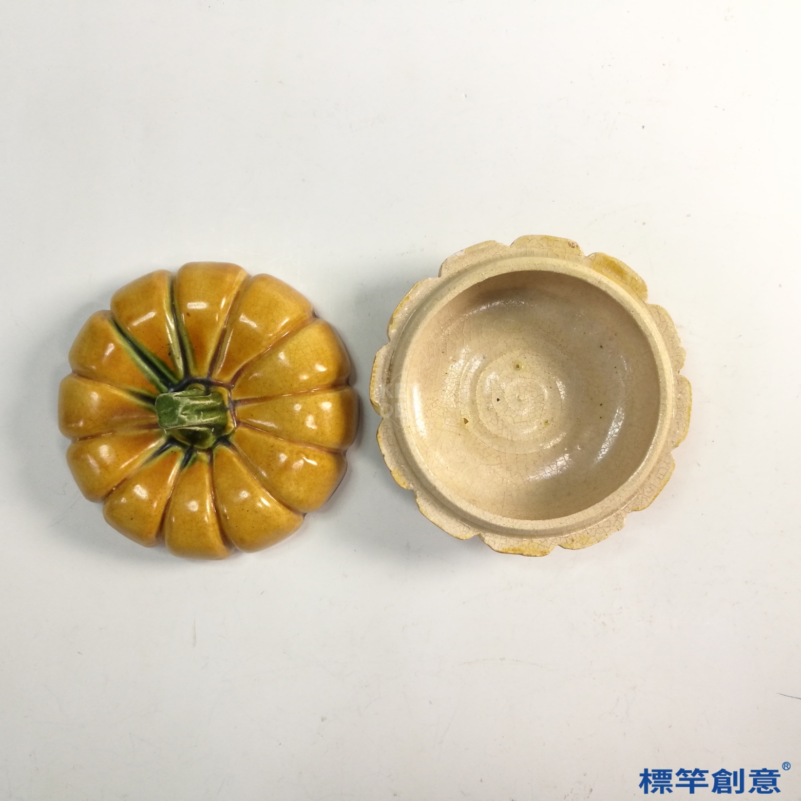 FB090 唐代鞏義窯黃釉綠彩南瓜形蓋盒
