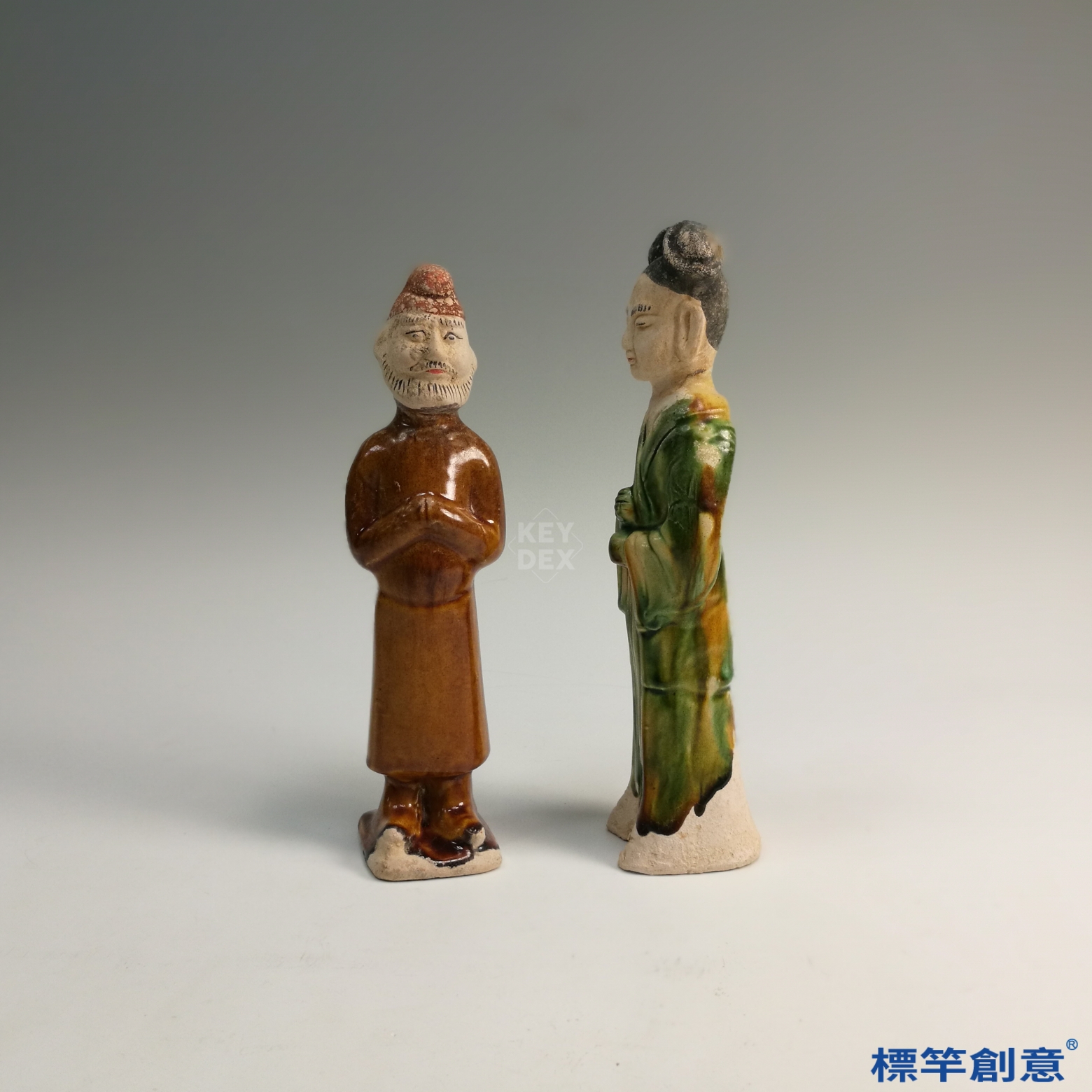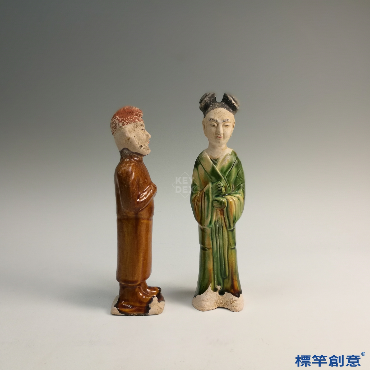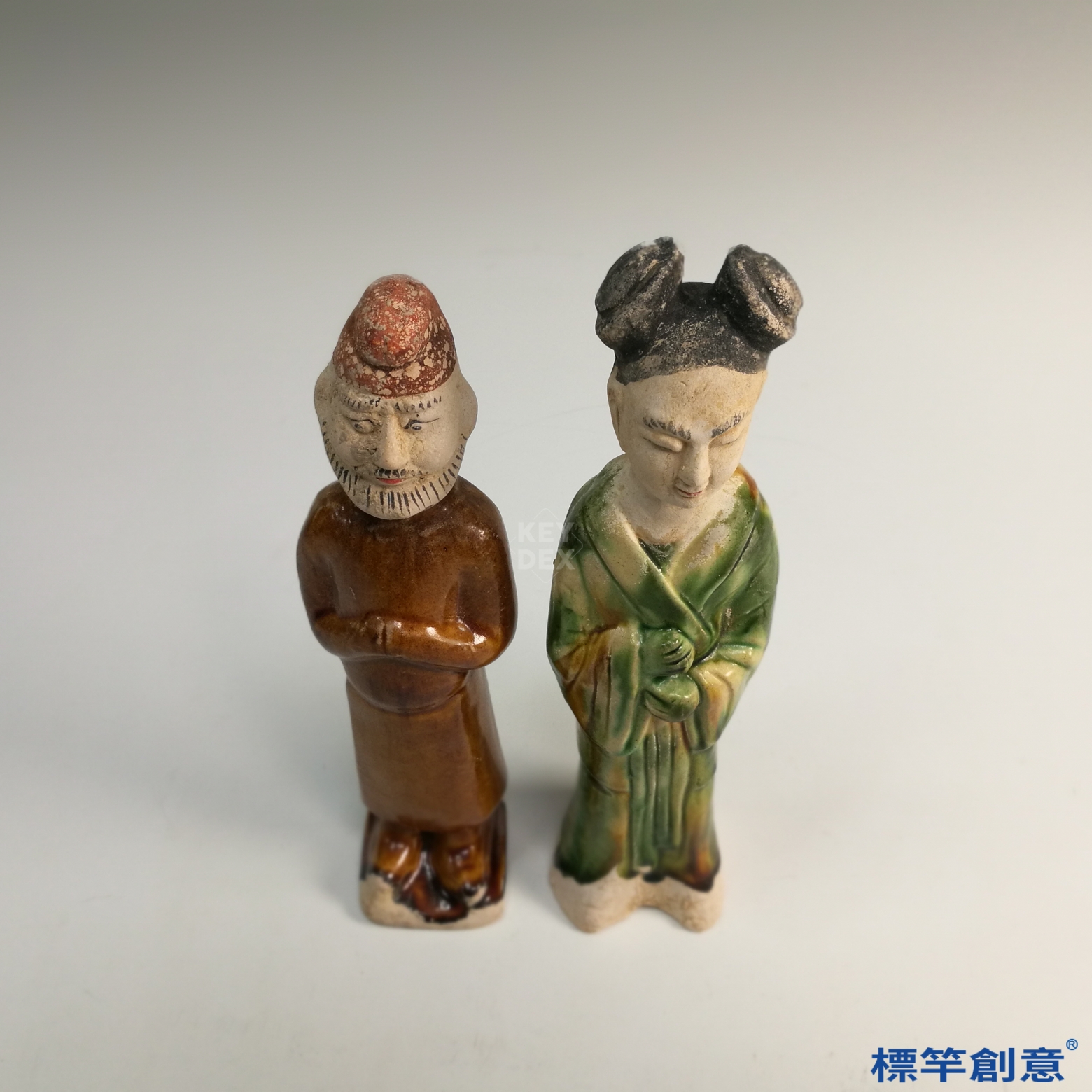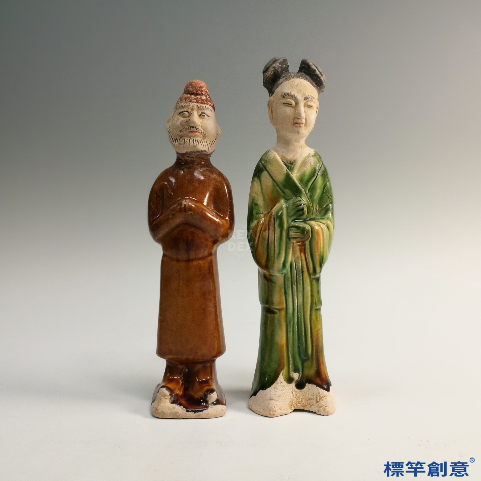 本件屬低溫鉛釉三彩工藝,男俑施以褐釉為主,女俑則以綠釉為主,並配白釉與局部露胎,釉彩流暢自然。整體塑形先以模印製作後加以細部修飾,表面施釉後經低溫燒成,色彩穩定且保存良好。