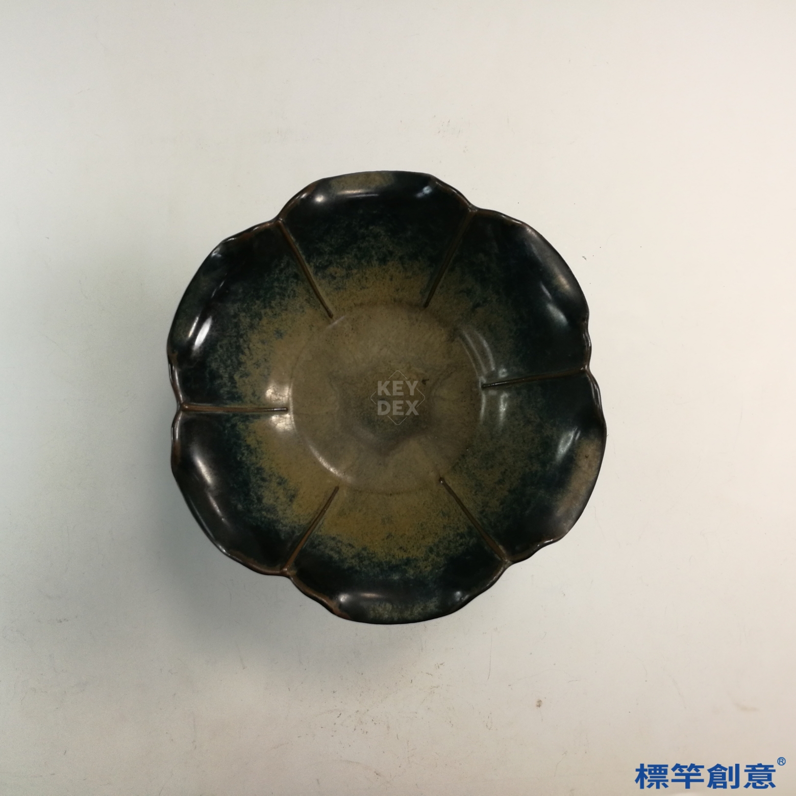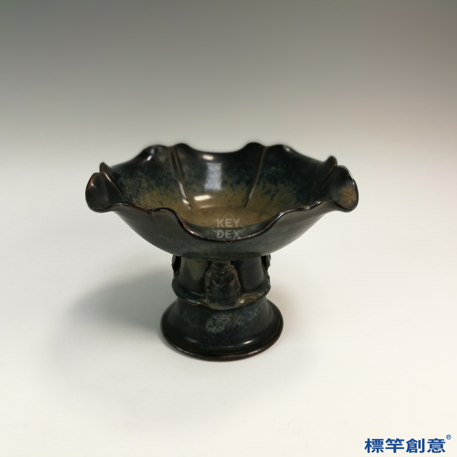 FB092 唐代晚期魯山窯黑釉藍斑荷葉形高足盤