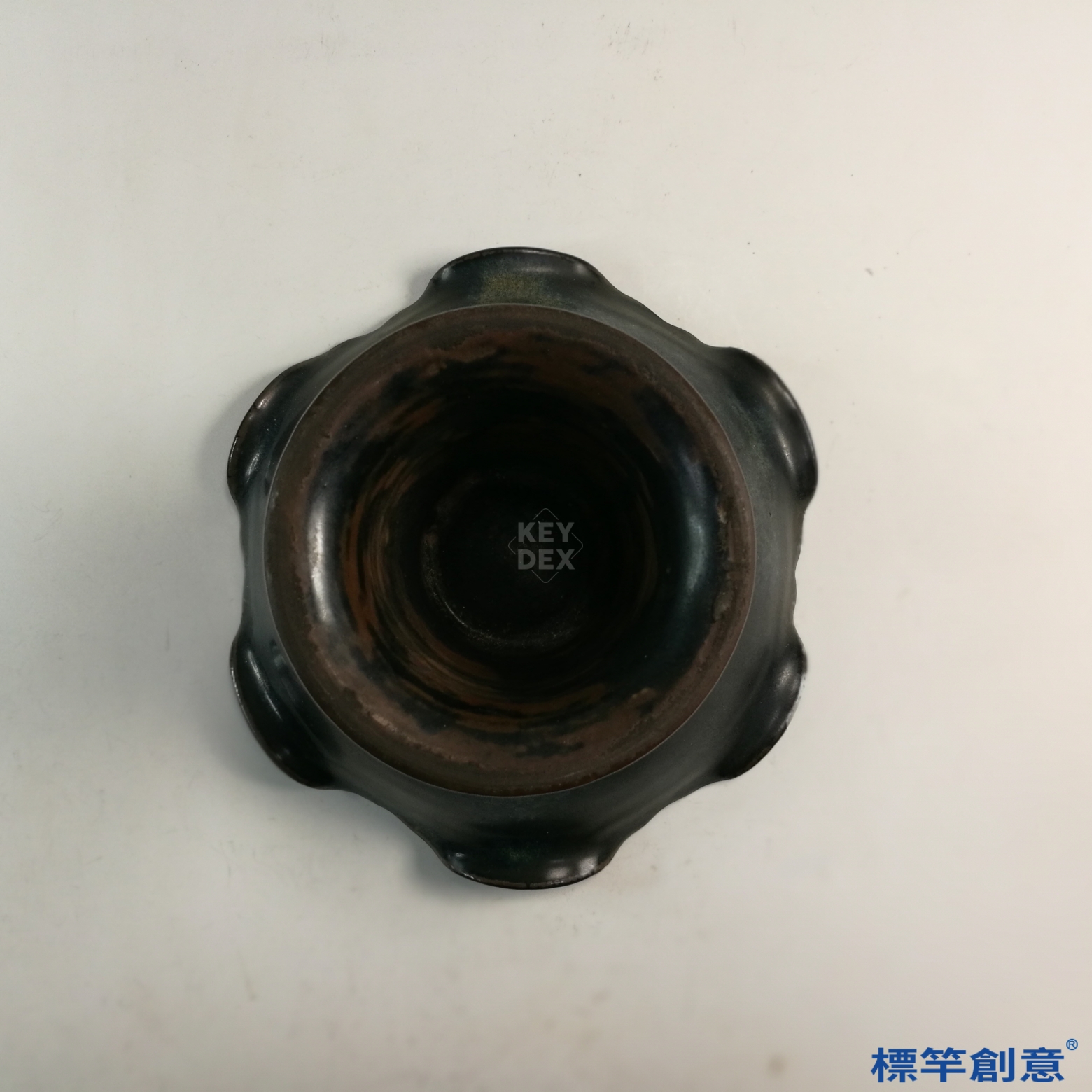 本器施黑釉為主,器表佈滿自然形成的藍斑釉變,為還原氣氛中鐵釉局部氧化所致。釉面光亮潤澤,局部流釉與釉斑交融生動。器型模仿荷葉造型,強調自然曲線之美,表現唐代花器寫意風格。胎質為灰黑細密陶胎,具高溫耐燒特性。