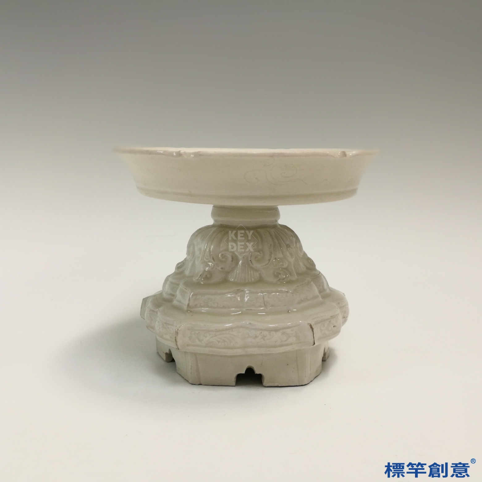 通體施白釉,釉色潔白微泛乳黃,呈現細膩開片紋,為典型邢窯釉面特色。盤面與臺座飾有淺刻花紋,紋樣細密清晰,刀法流暢,蓮瓣層層堆疊,部分區域另以淺線模印蓮花筋脈,富立體感。高足仿蓮臺結構,兼具佛教供具與裝飾器的雙重功能。