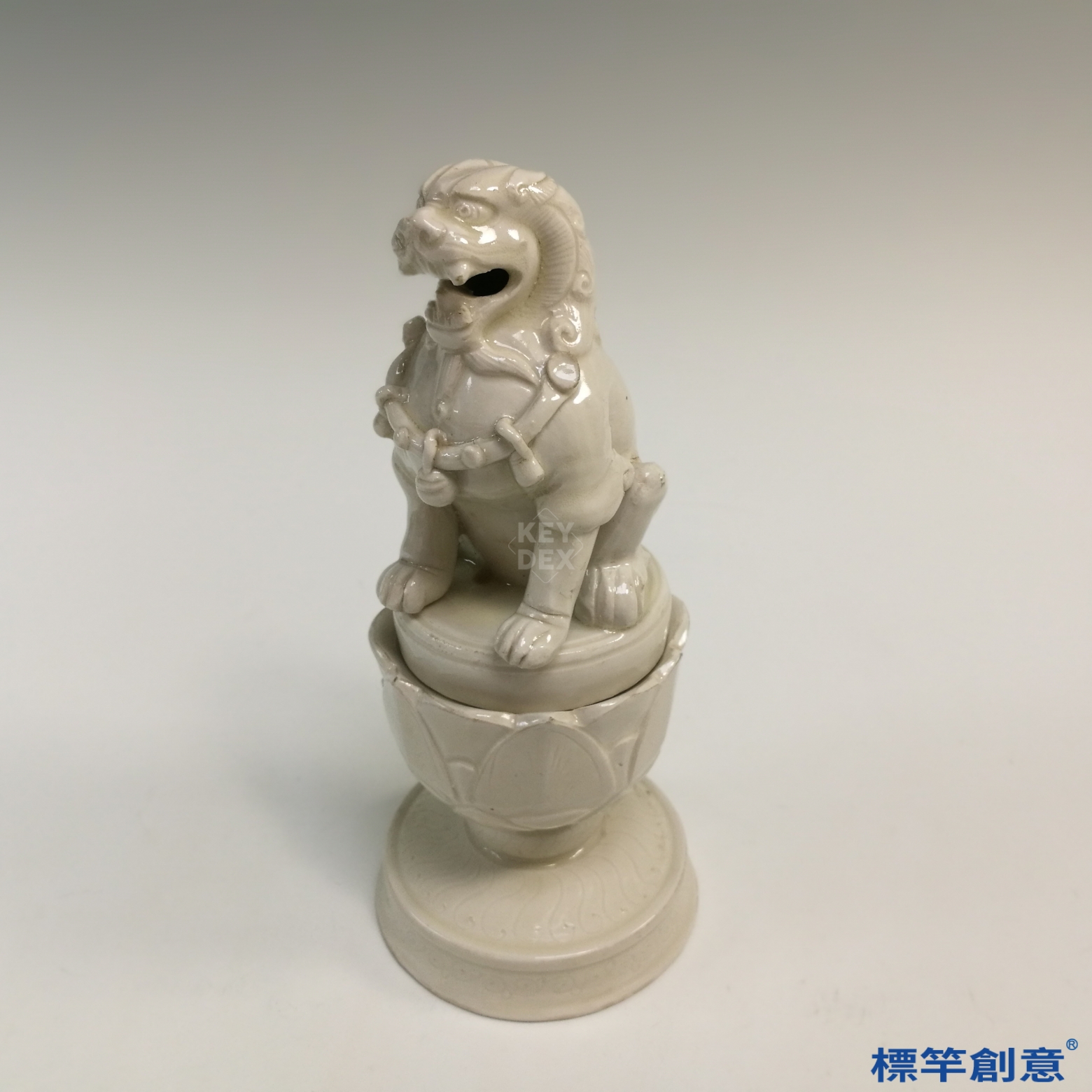 通體施白釉,釉面瑩潤溫雅,釉色泛乳白,局部自然開片。獅子以模印後再修塑而成,鬃毛、面部與四肢細節均表現細緻。蓮臺以貼塑方式製作瓣形,底座略帶陽刻紋飾,工藝層次豐富。獅身中空,內部貫通,口鼻與台座邊緣設有通氣孔,可供香煙散出。