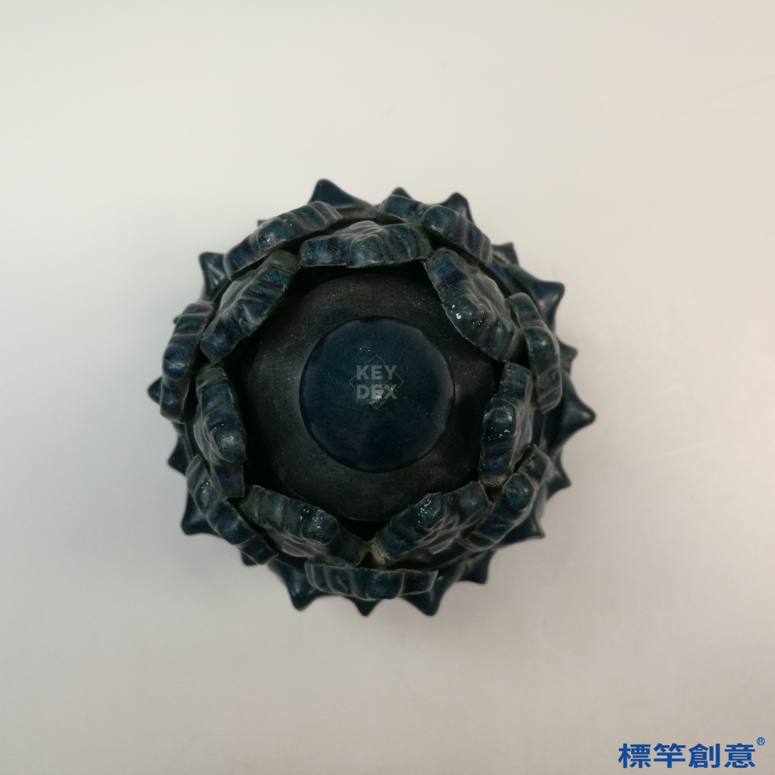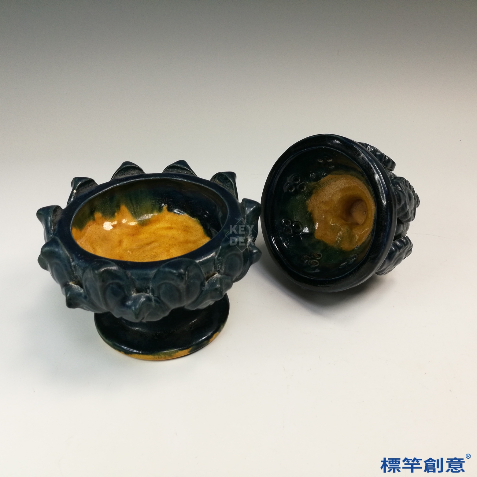 全器施深藍釉,色澤沉靜濃郁,釉面光滑潤澤。蓋體以貼塑技法堆疊蓮瓣與連珠紋,富有浮雕感,並穿鑿出通風小孔,供薰煙升騰使用。底座圓形,中段設有蓮花形承托座,線條勻稱穩重,展現極高的模製與裝飾工藝水準。