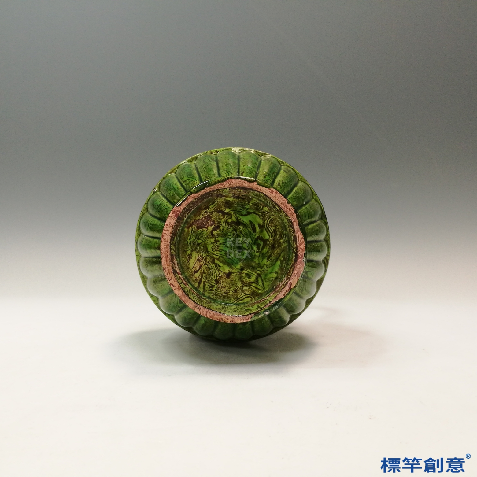 胎體經絞胎技法混合兩色泥料製成,並以模製與刻劃技法完成器形與紋飾。施以高鉛質綠釉後,入窯高溫燒成。此類綠釉需準確控制釉層厚度與還原燒成條件,方能展現明亮通透質感。