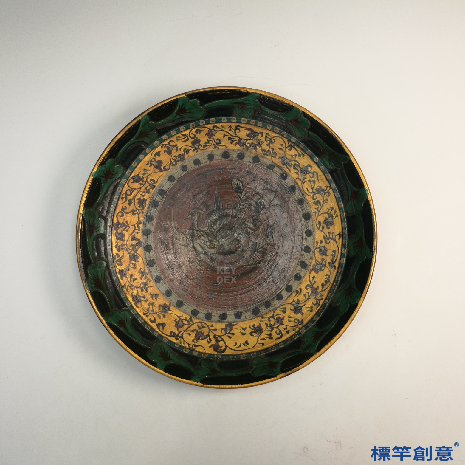 FB125 唐代黑陶金彩繪鳳紋花卉盤
