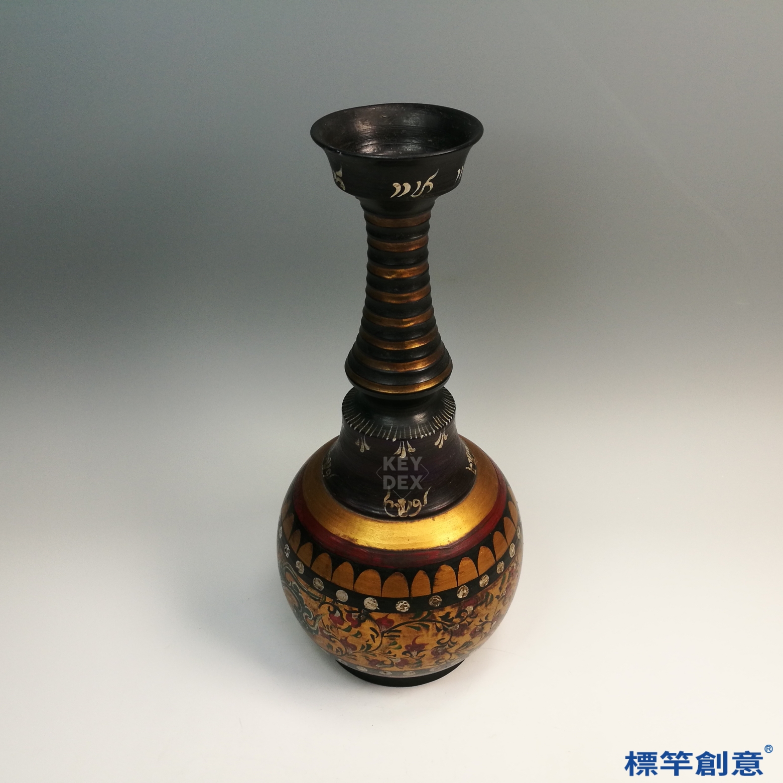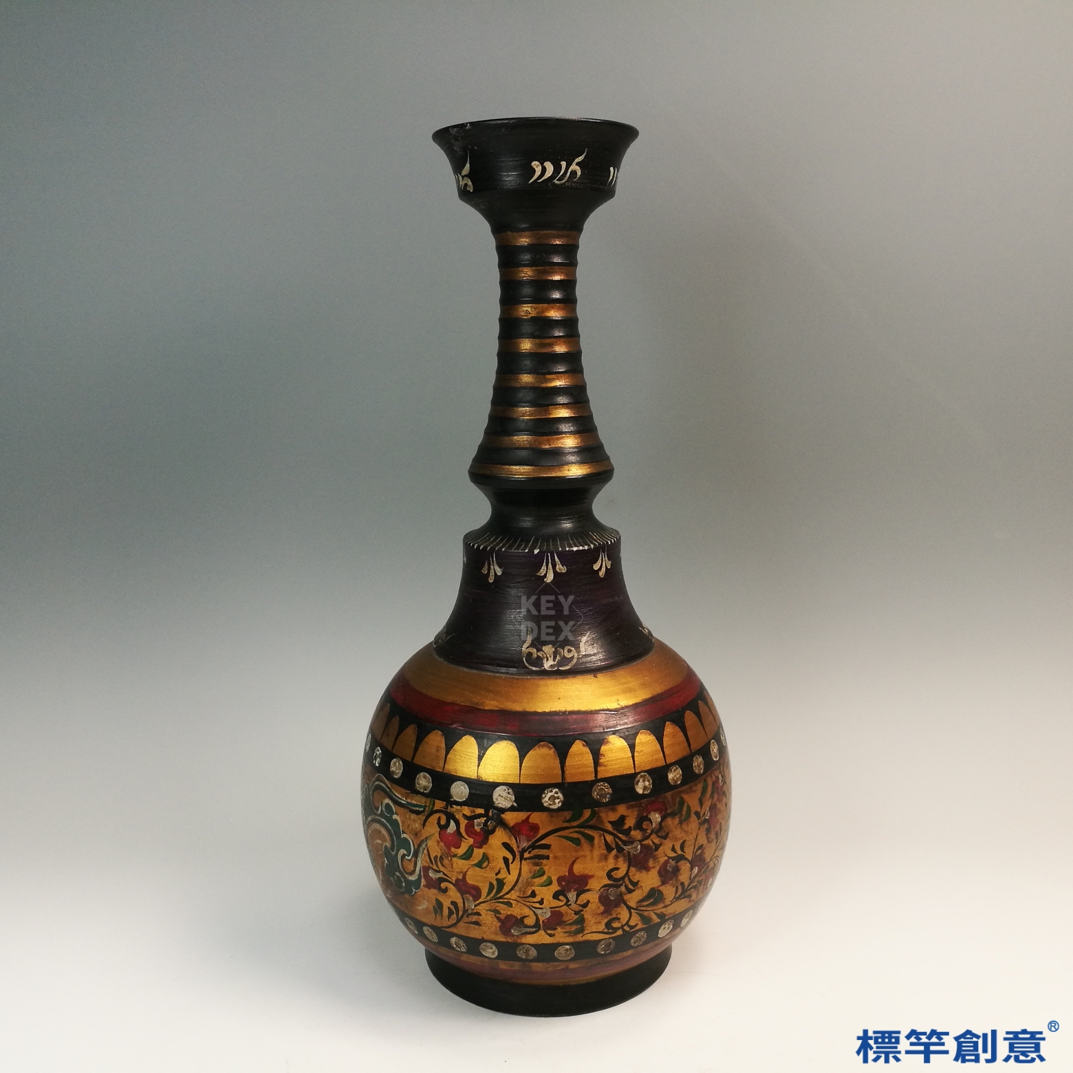 FB127 唐代黑陶金彩繪纏枝花卉紋盤口長頸瓶