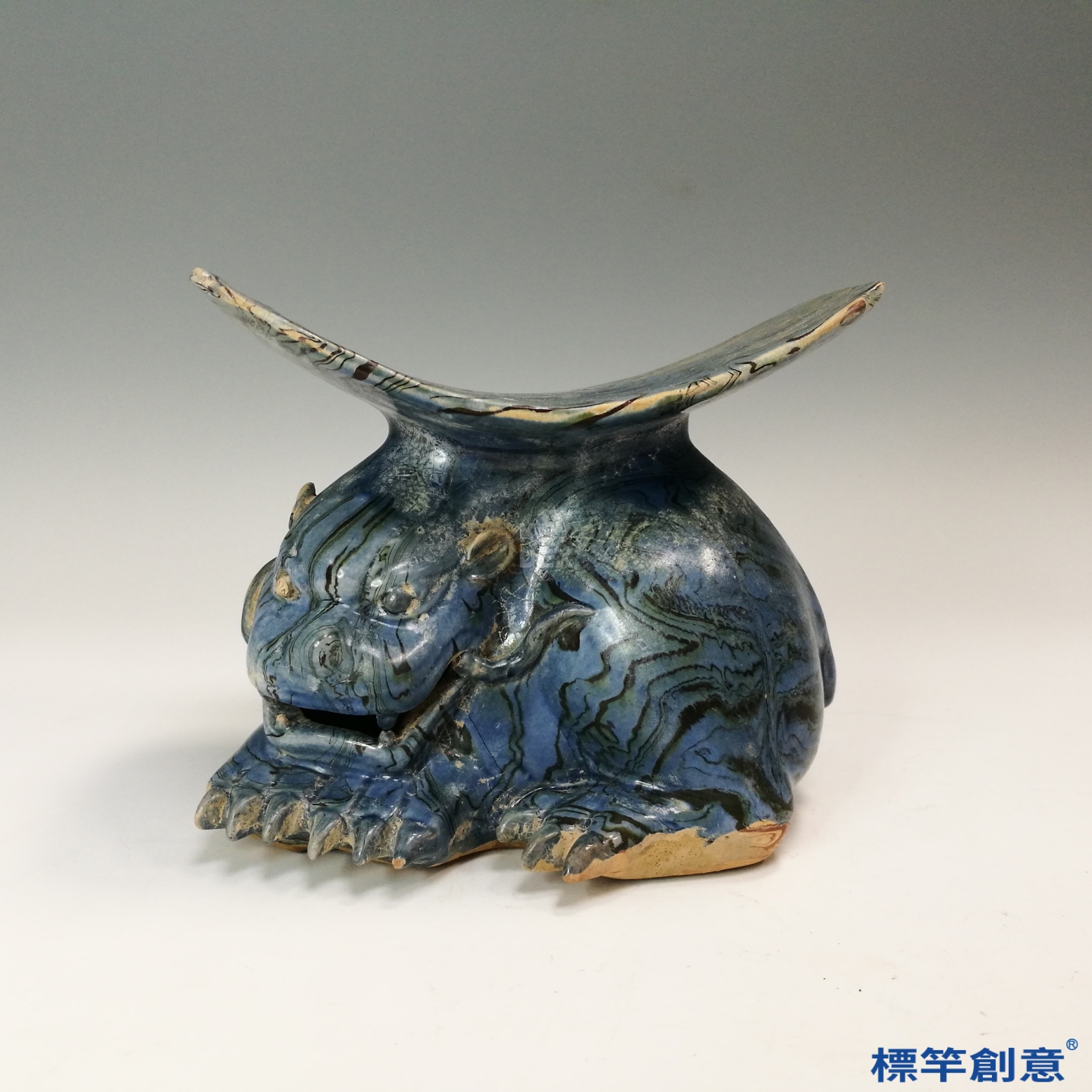 FB128 唐代鞏義窯淺藍釉絞胎瑞獸驅魔瓷枕