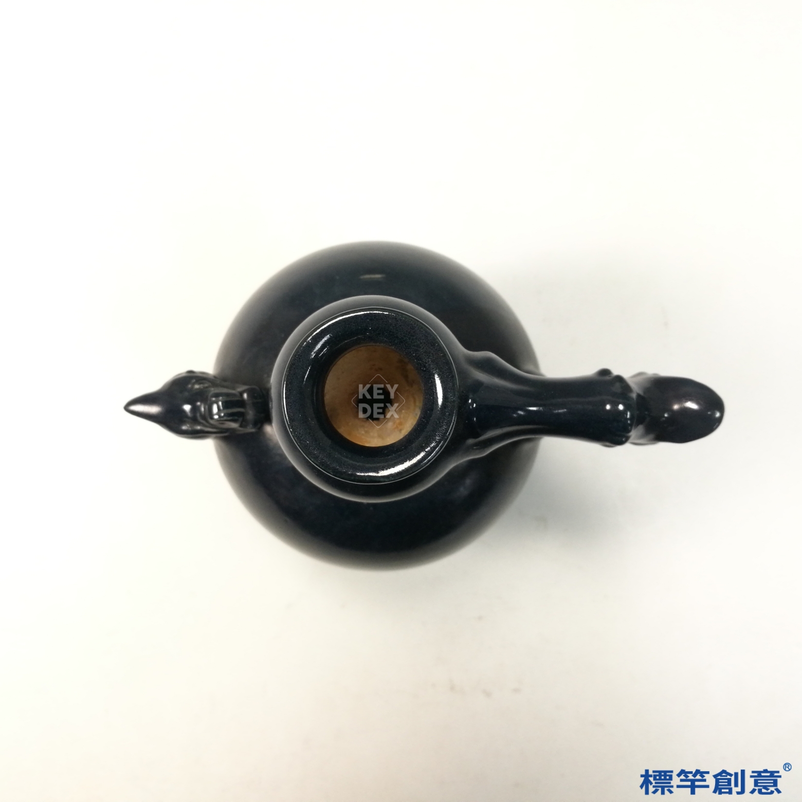 通體施覆藍黑釉,釉色深邃渾厚,黑中透藍,在光照下可見釉層中微微泛出青藍光澤。釉面均勻且光亮,無明顯開片,技術成熟。鳳首與龍柄皆為貼塑成形,細節繁複,反映唐代對瑞禽神獸的崇拜與高超雕塑技藝。腹部與足部一體成型,結構穩定。