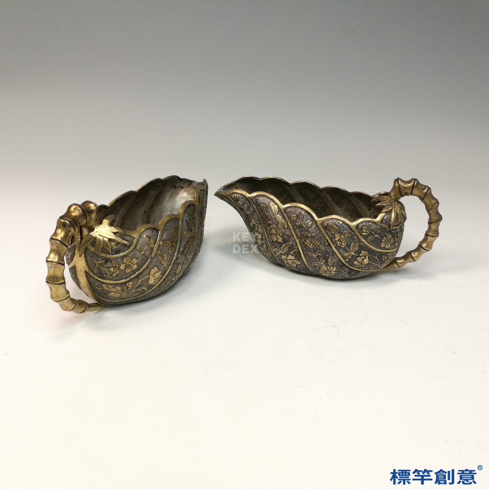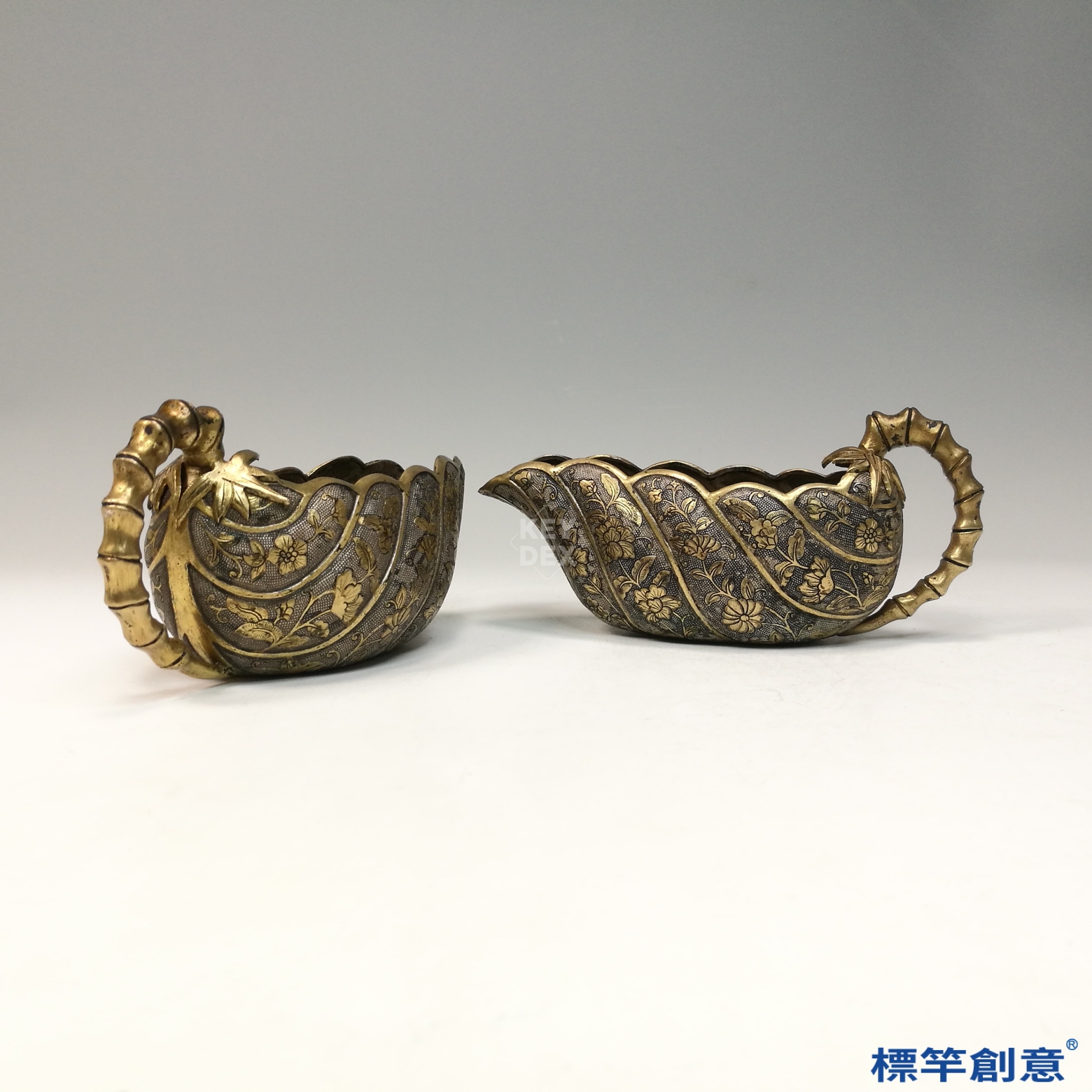 FB141 唐代鎏金銅鏨刻花卉紋葉形匜式杯一對