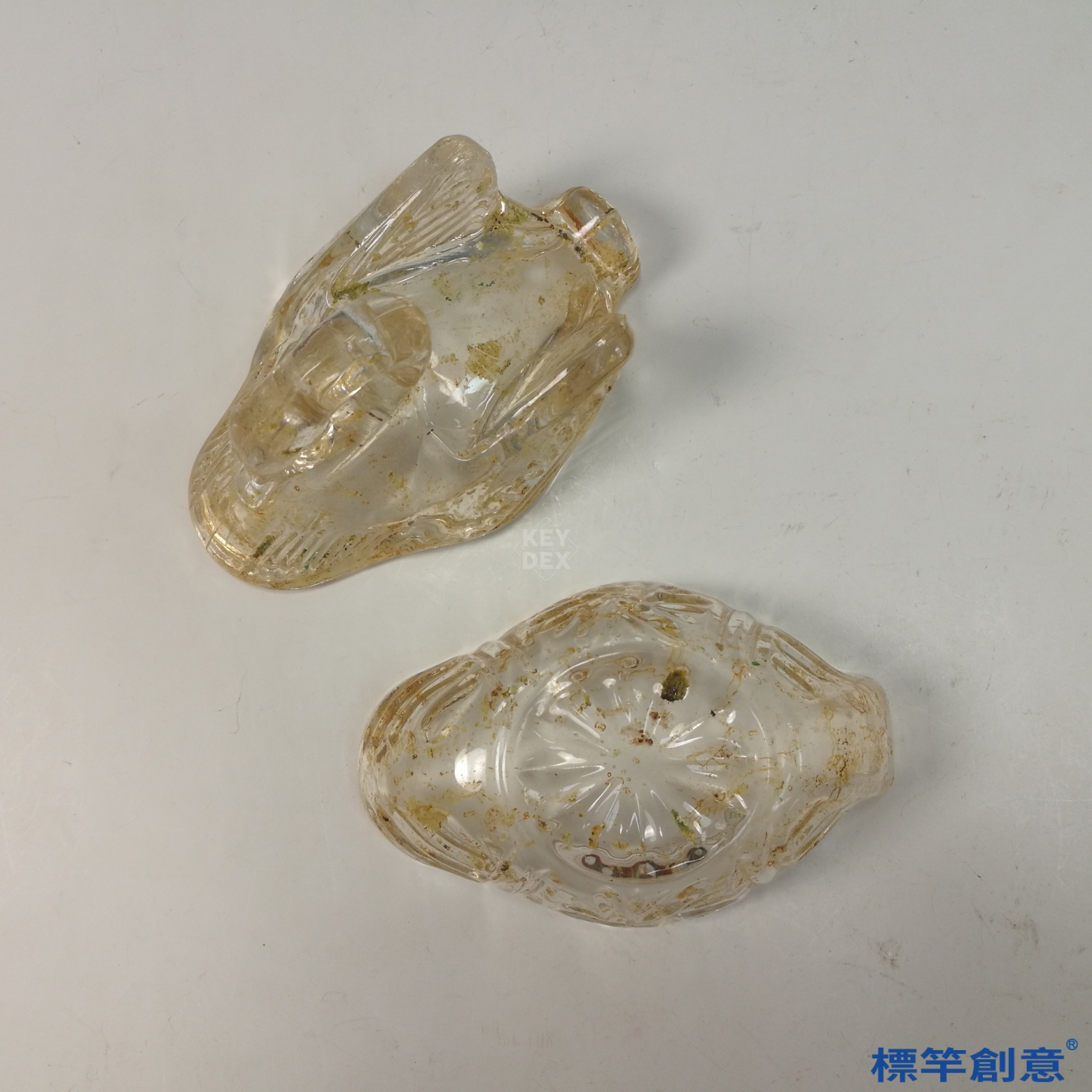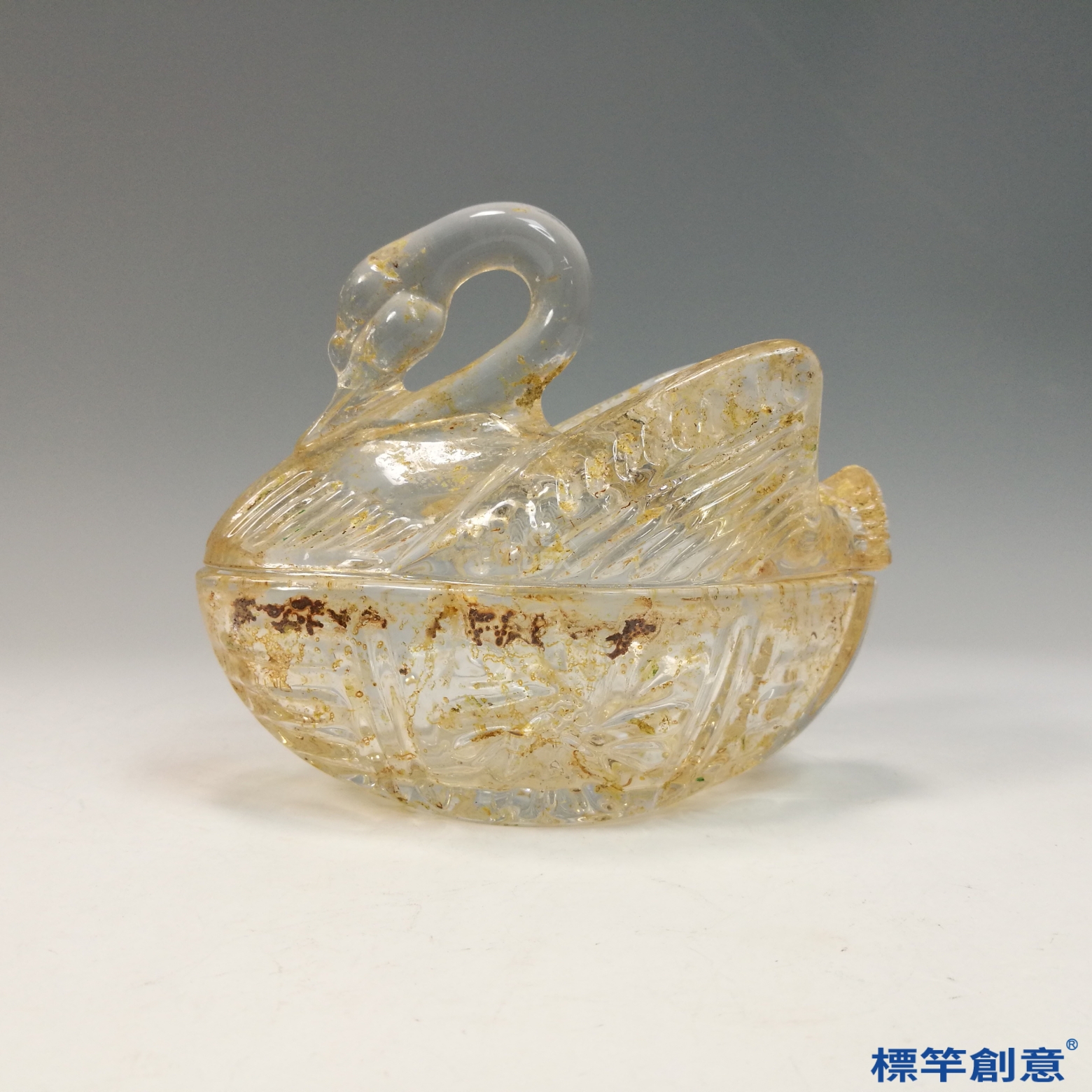 可應用於現代玻璃藝術、文創禮品設計或高端收納盒開發。鵝形構造可轉化為香盒、珠寶盒或紀念品包裝,其圓潤線條與光澤效果具高度裝飾性。亦可作為模壓成型技術教材之典型範例。