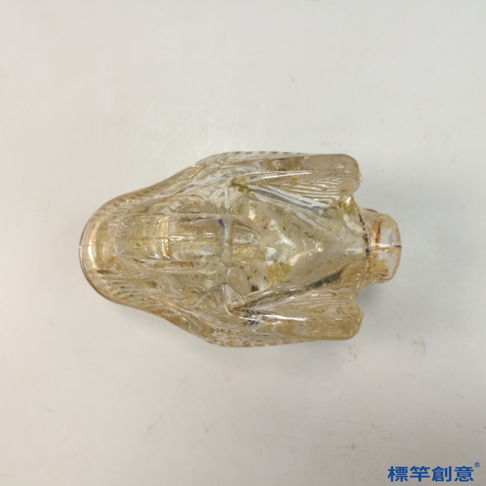 本器採用雕模成形工藝,由透明或半透明無色琉璃製成,表面略有黃褐色風化痕跡,為埋藏年代久遠所致。器表可見手工雕刻羽翼與頭頸細節,造型生動自然。內外磨光處理,使表面光澤柔潤,展現唐代琉璃工藝的成熟技術。上下兩部分結構嚴密,屬盒蓋嵌合式設計。