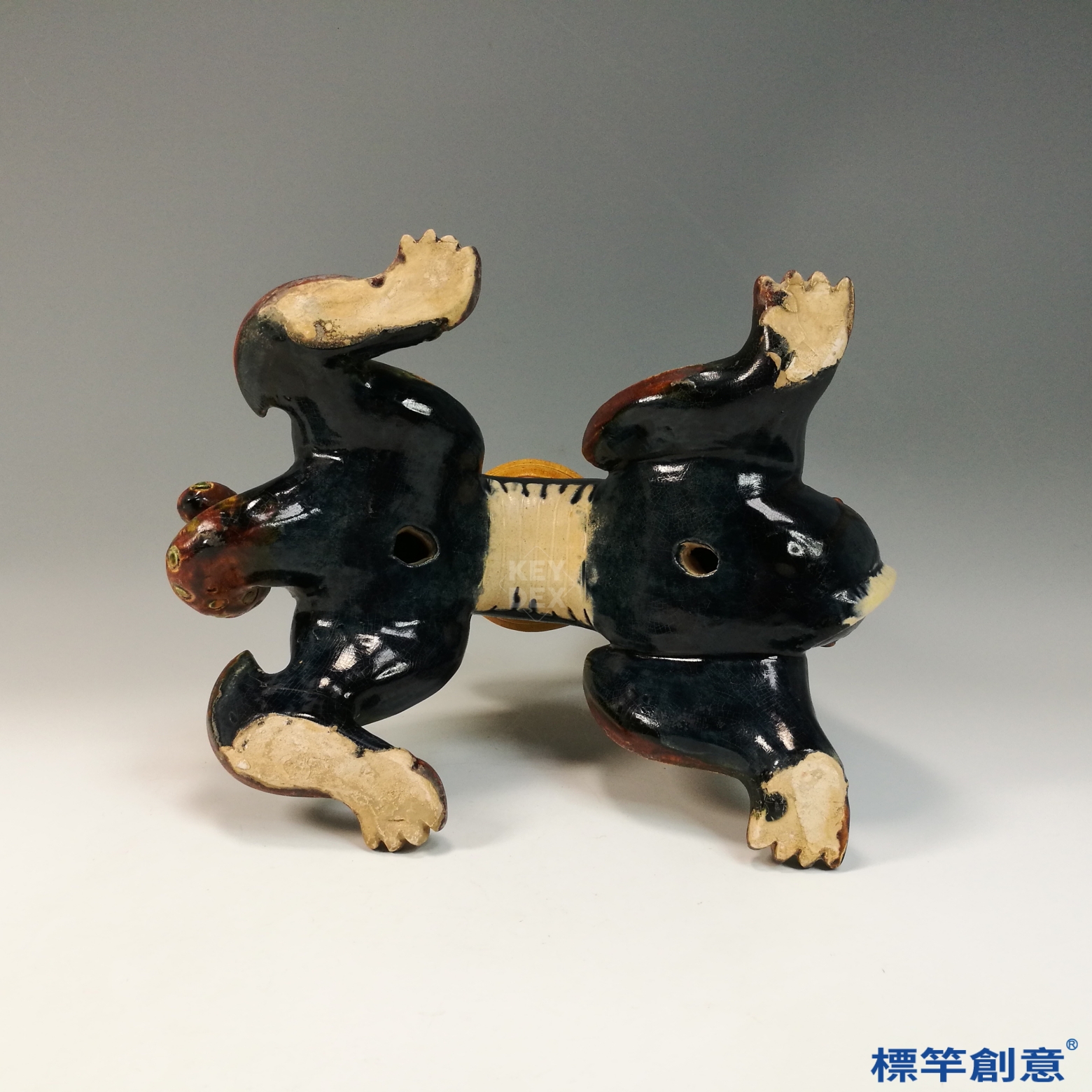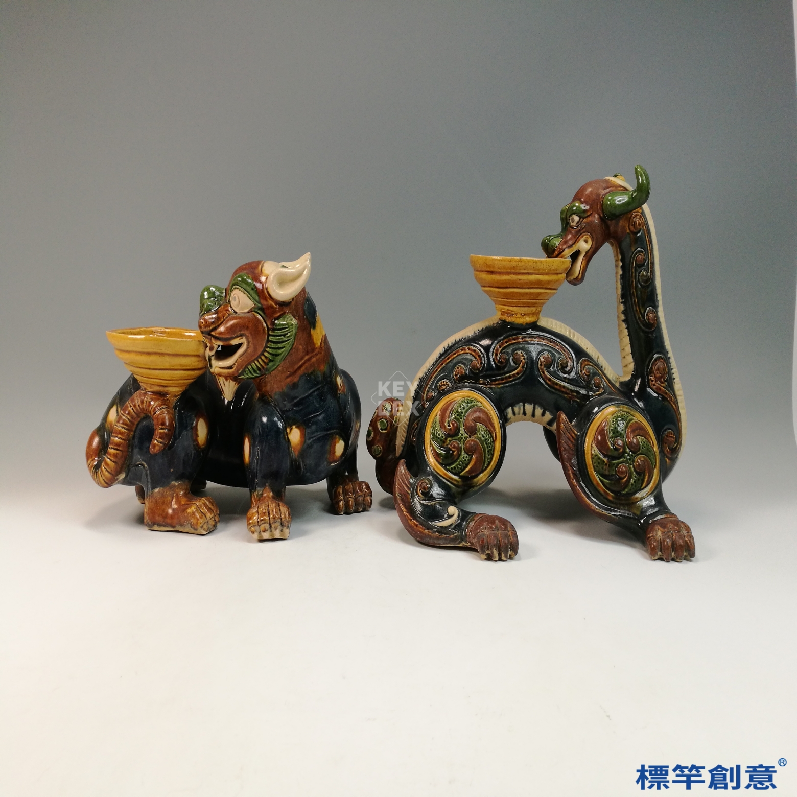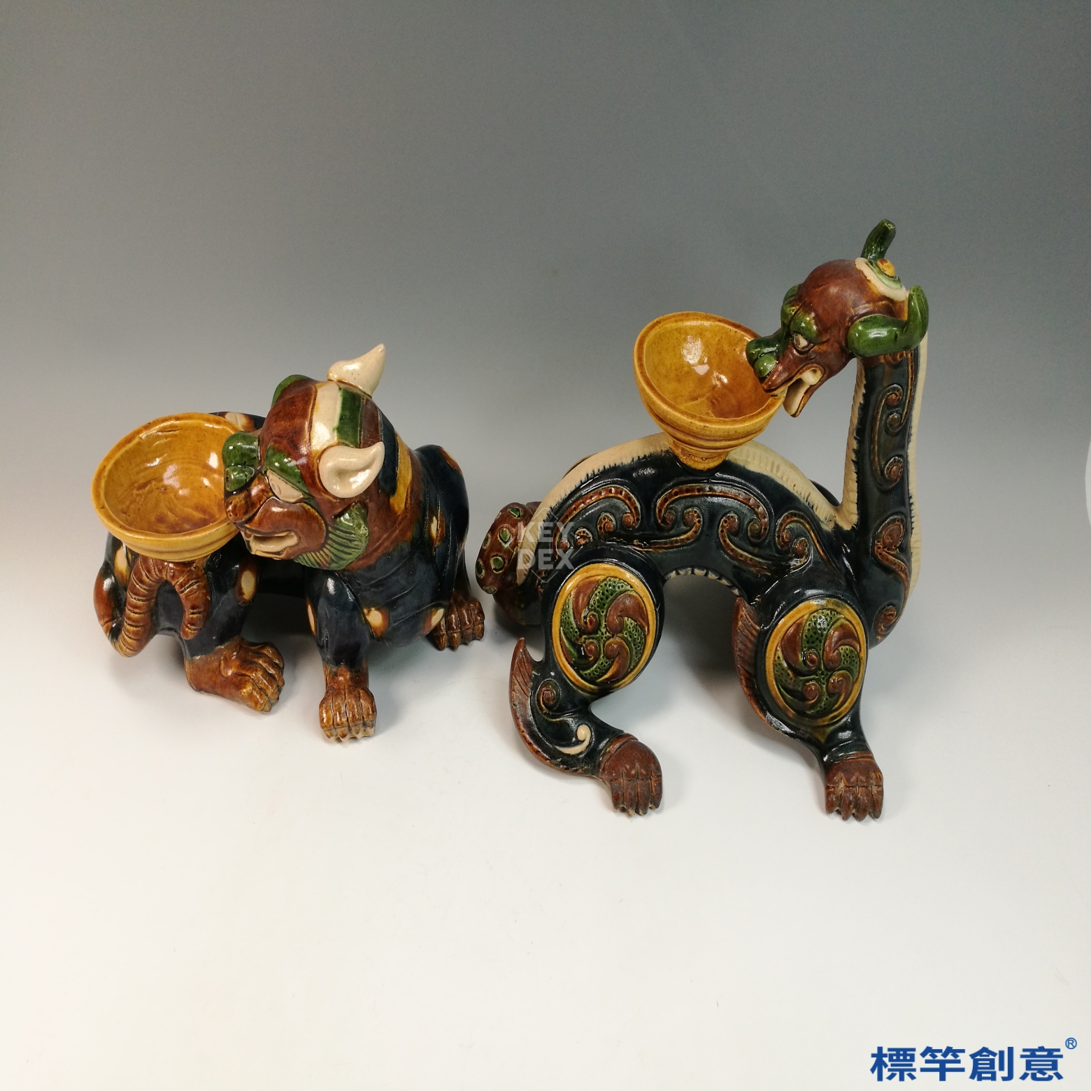 青龍與白虎之身以黃、赭、綠、藍釉交錯裝飾,呈現出唐三彩特有的釉彩流動與斑斕效果。獸身以模製與手工結合塑形,紋飾細膩:青龍雙角彎曲、龍鱗精細;白虎則耳尖高立、肌肉飽滿。背部承盞部分獨立燒成後結合於主體,器座邊緣具梯狀層次,利於置香燈或油盞使用。