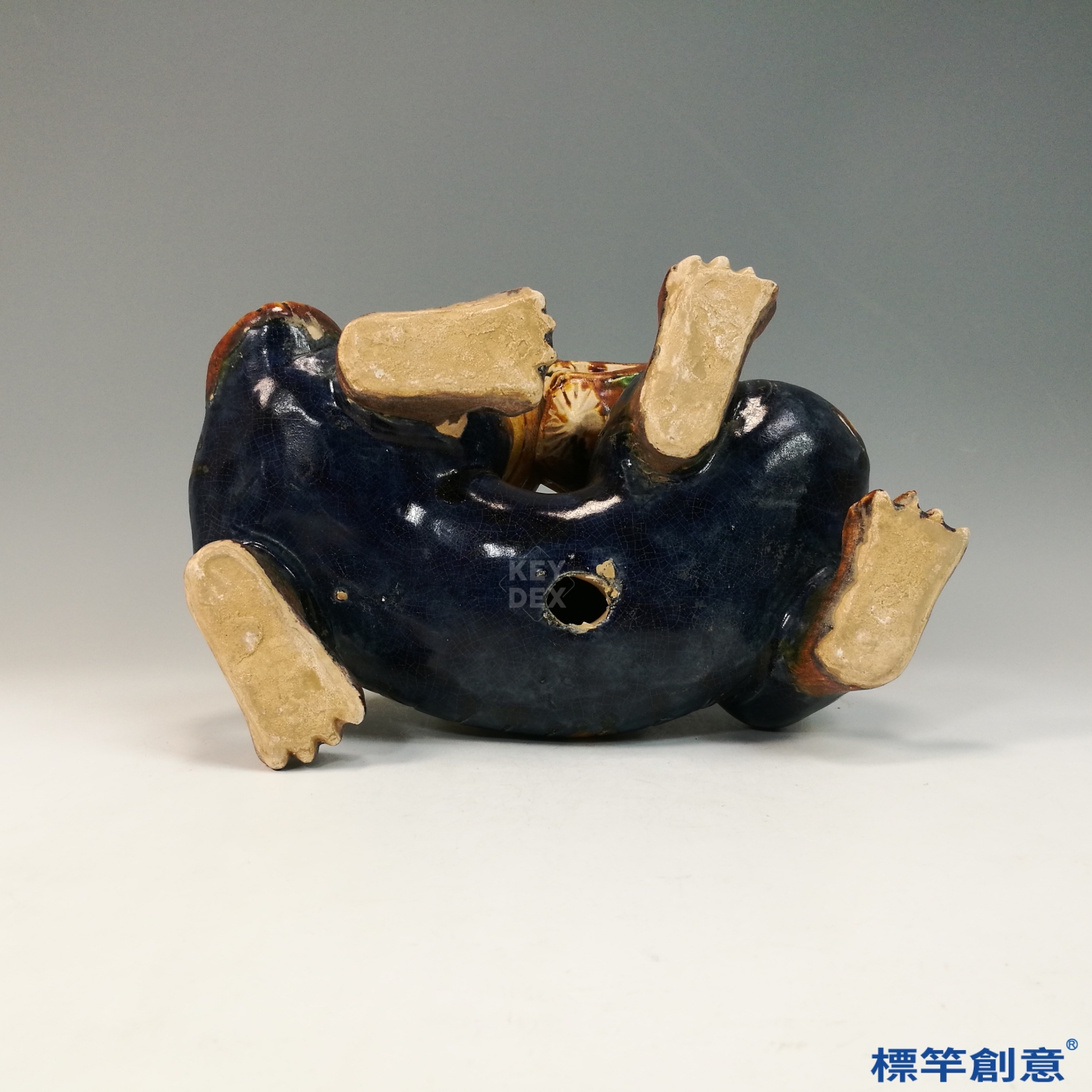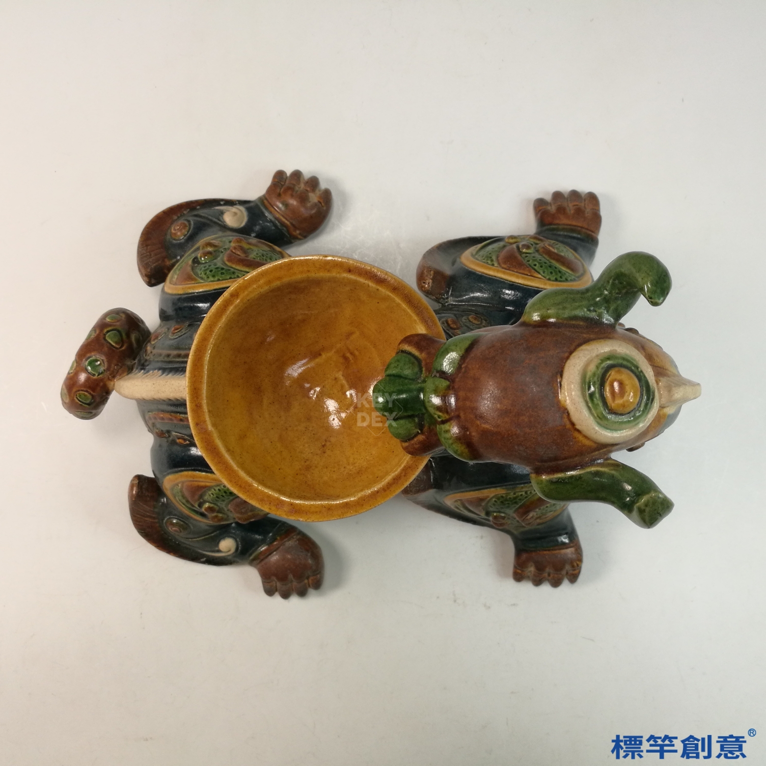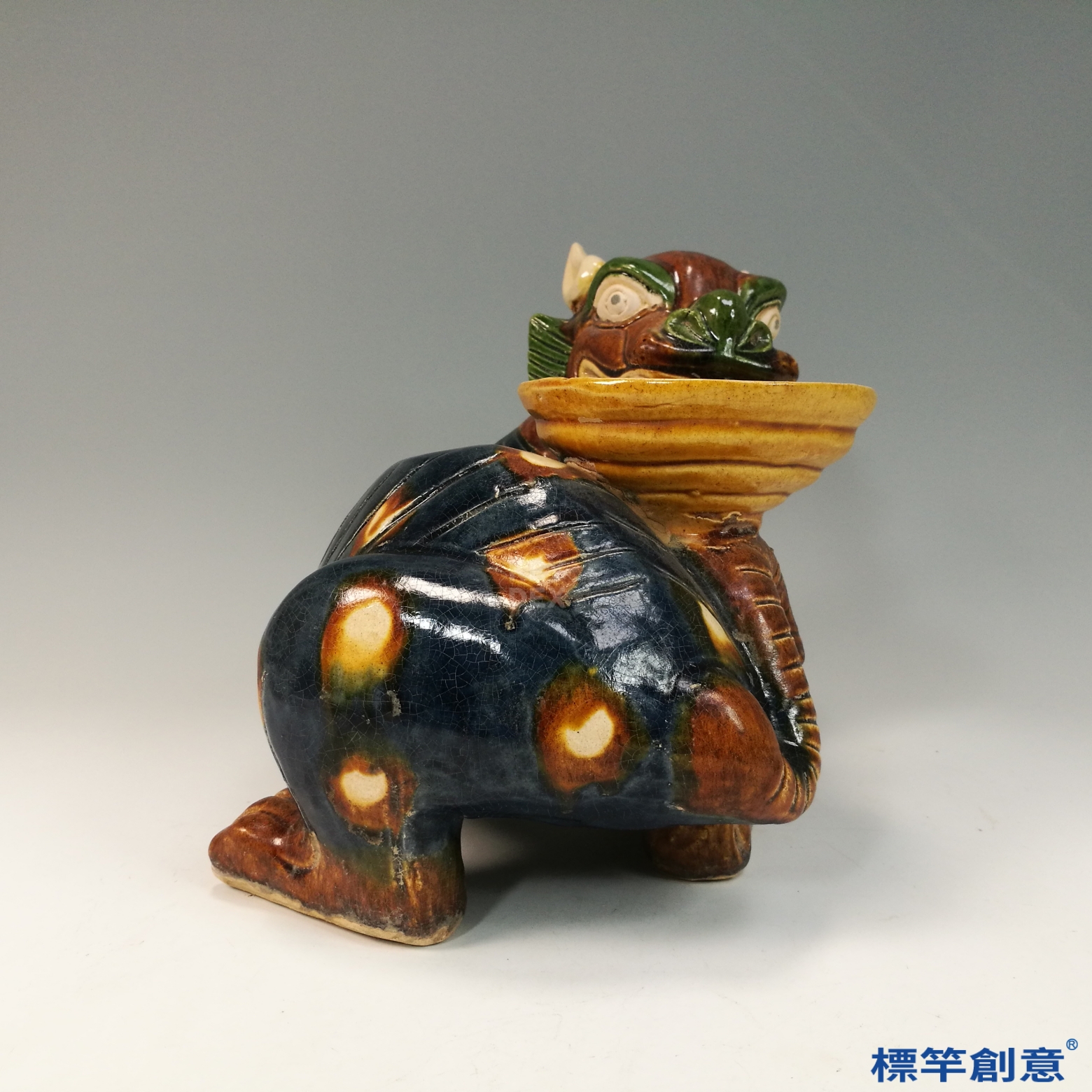 青龍與白虎之身以黃、赭、綠、藍釉交錯裝飾,呈現出唐三彩特有的釉彩流動與斑斕效果。獸身以模製與手工結合塑形,紋飾細膩:青龍雙角彎曲、龍鱗精細;白虎則耳尖高立、肌肉飽滿。背部承盞部分獨立燒成後結合於主體,器座邊緣具梯狀層次,利於置香燈或油盞使用。