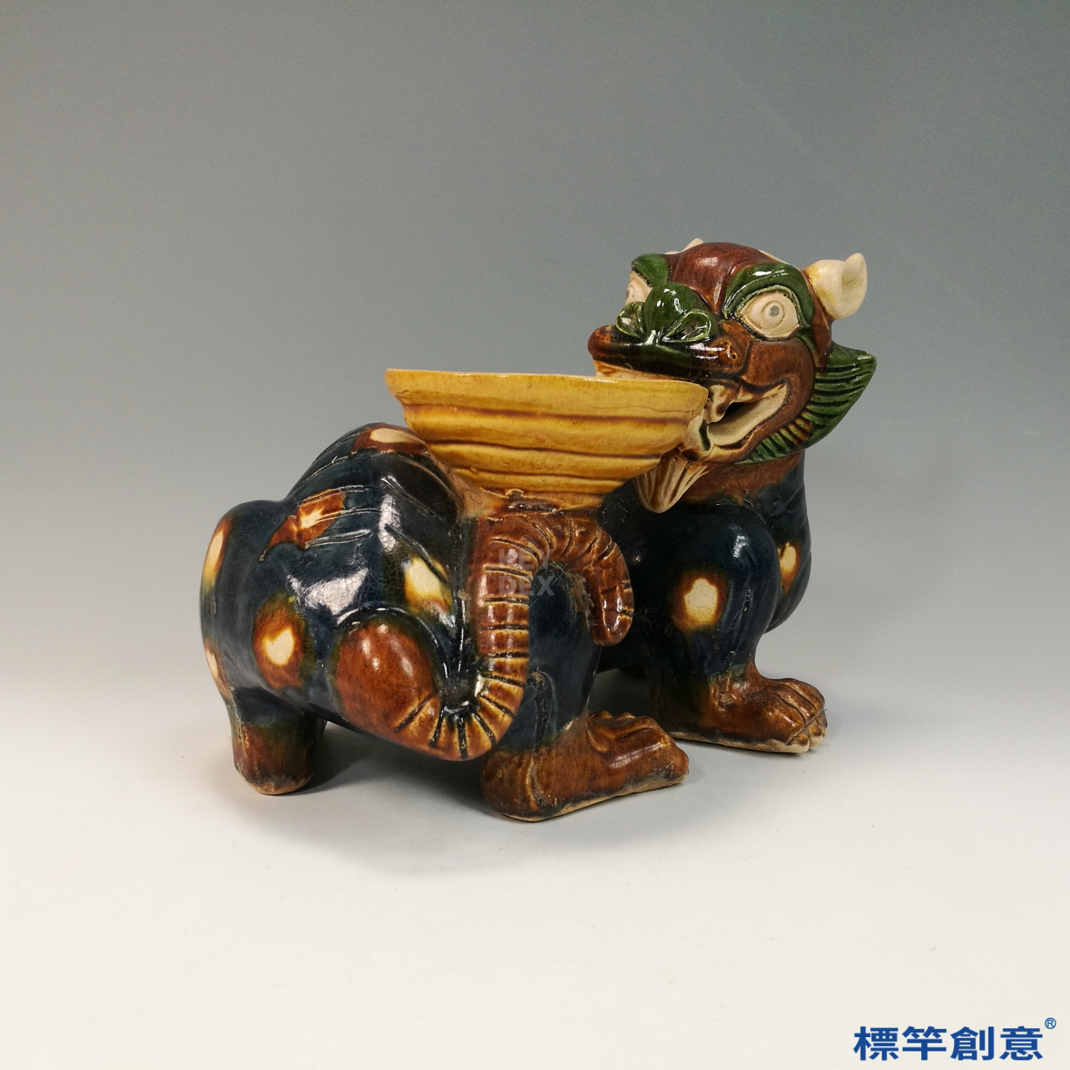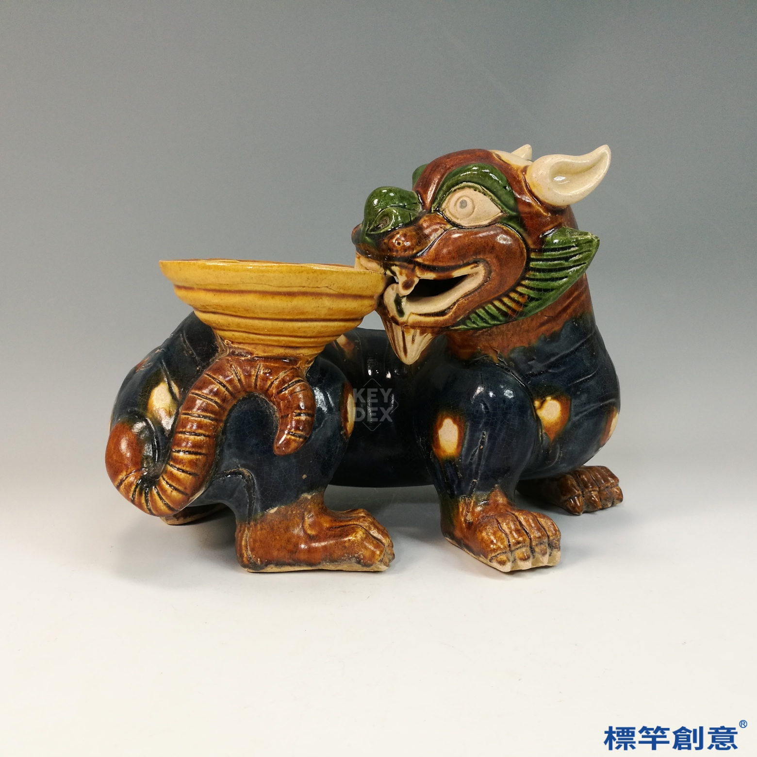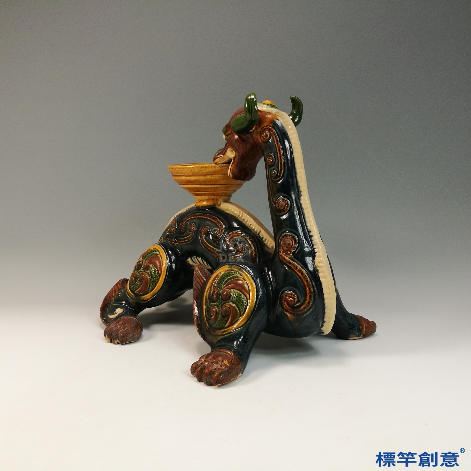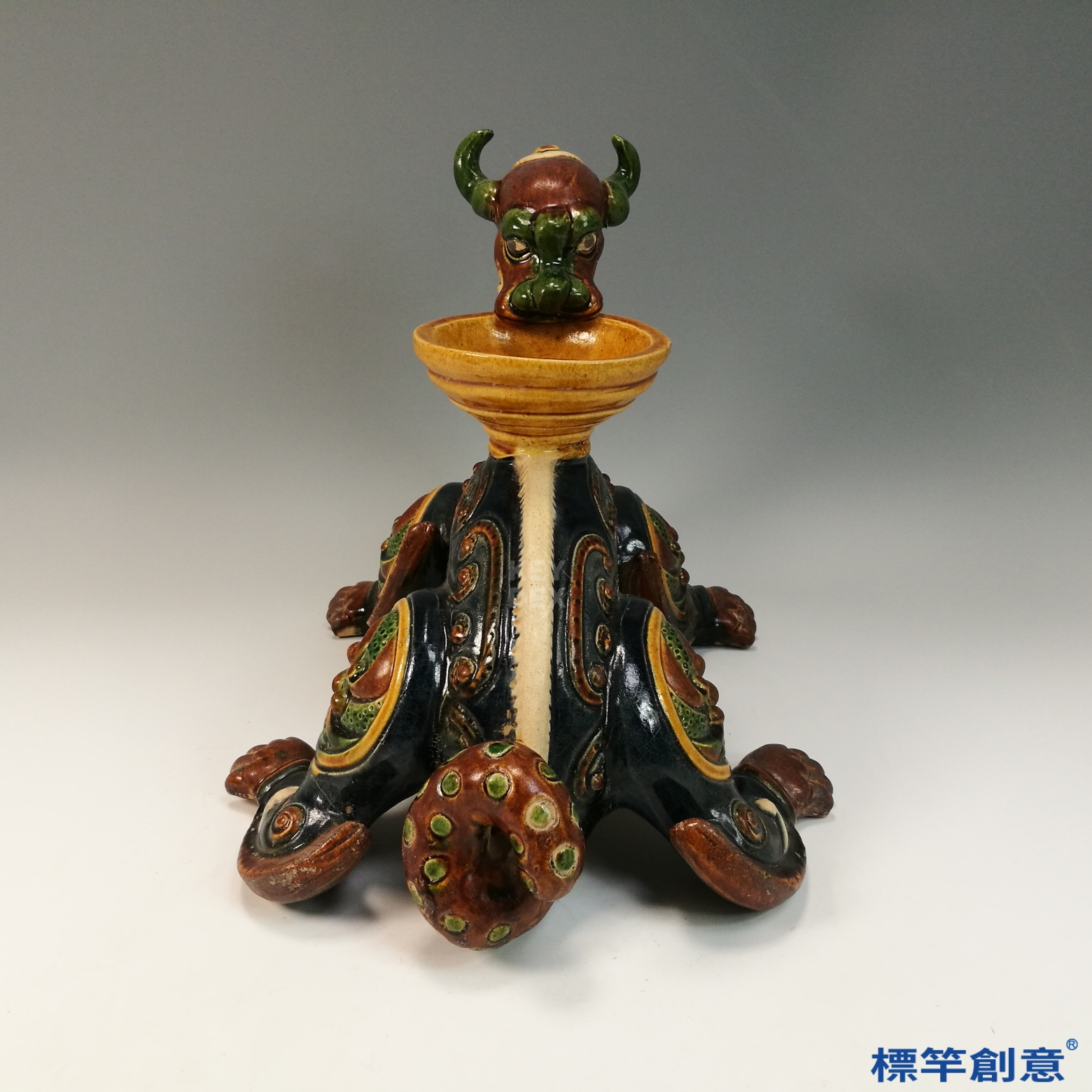 器體以粗陶胎為基礎,經模印與手工雕塑成形,陰乾後素燒,再施以多色鉛釉填彩。最終以約900°C低溫燒製成器,釉料於燒成中自然流動、滲合,形成豐富的視覺層次與唐三彩特色。燈盞與主體多為分體燒製後組合。