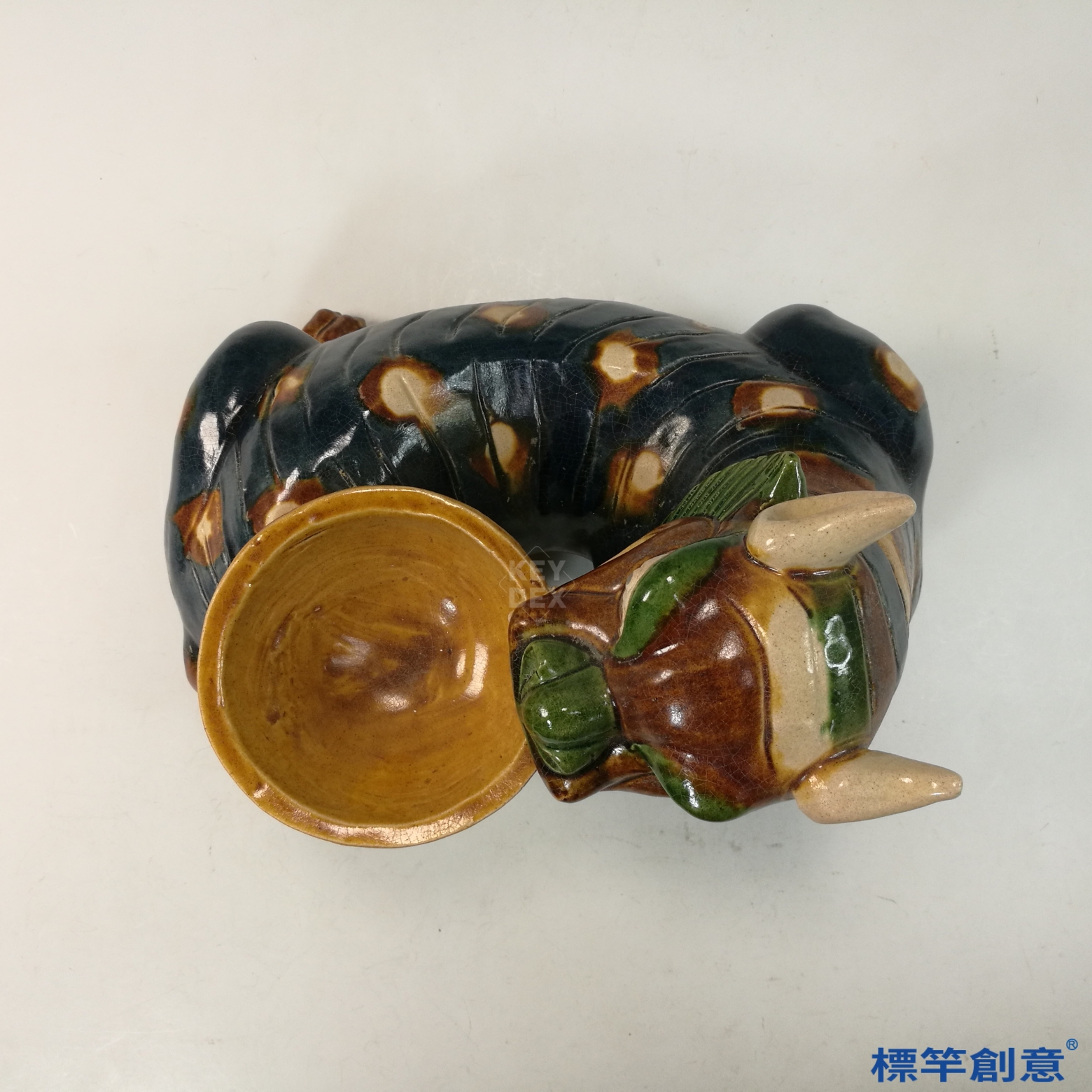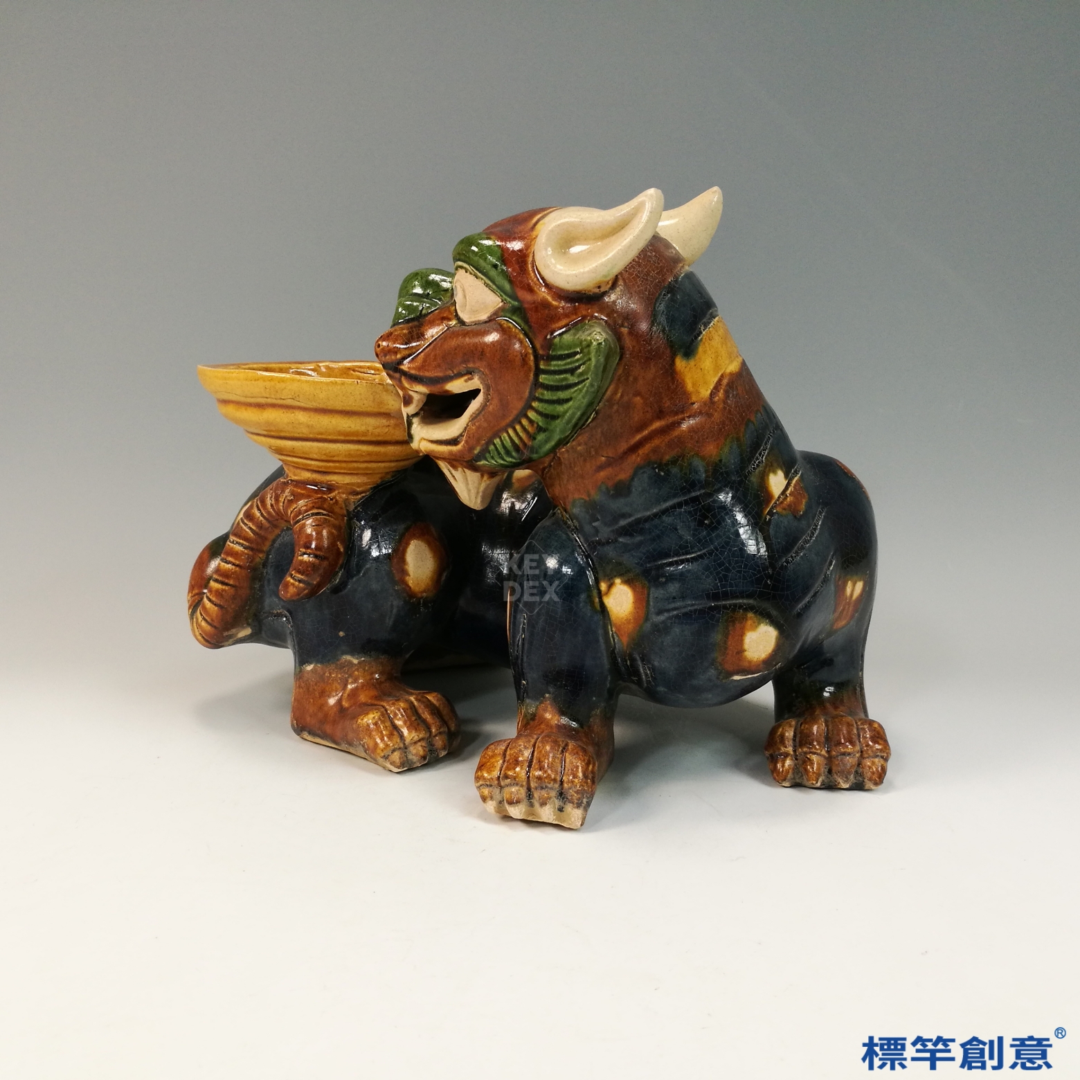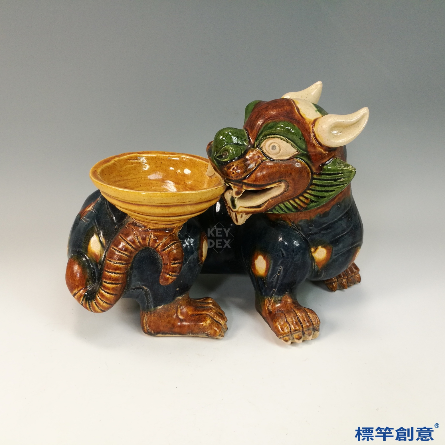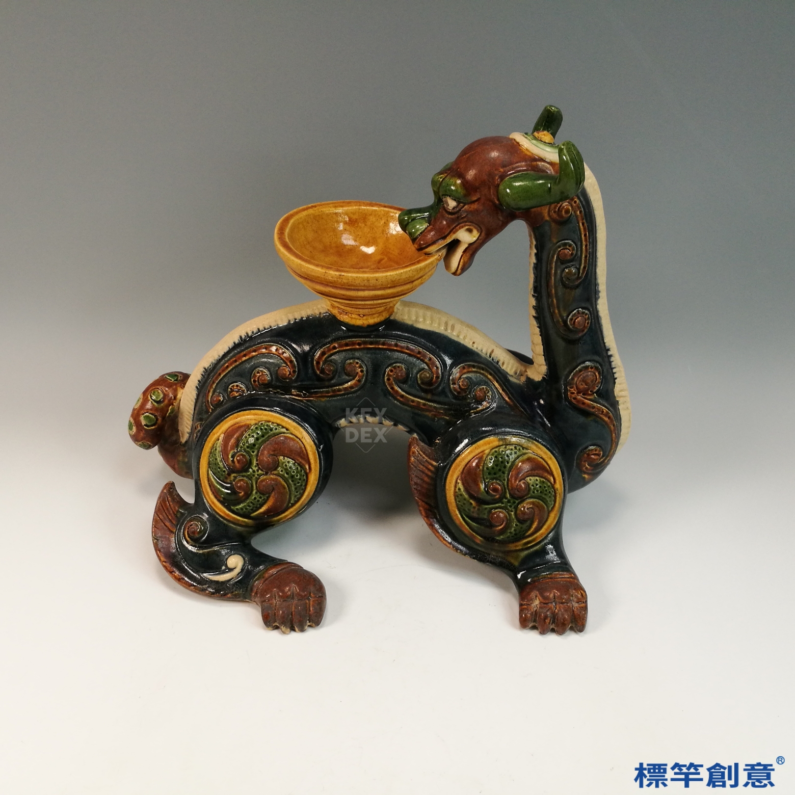 器體以粗陶胎為基礎,經模印與手工雕塑成形,陰乾後素燒,再施以多色鉛釉填彩。最終以約900°C低溫燒製成器,釉料於燒成中自然流動、滲合,形成豐富的視覺層次與唐三彩特色。燈盞與主體多為分體燒製後組合。