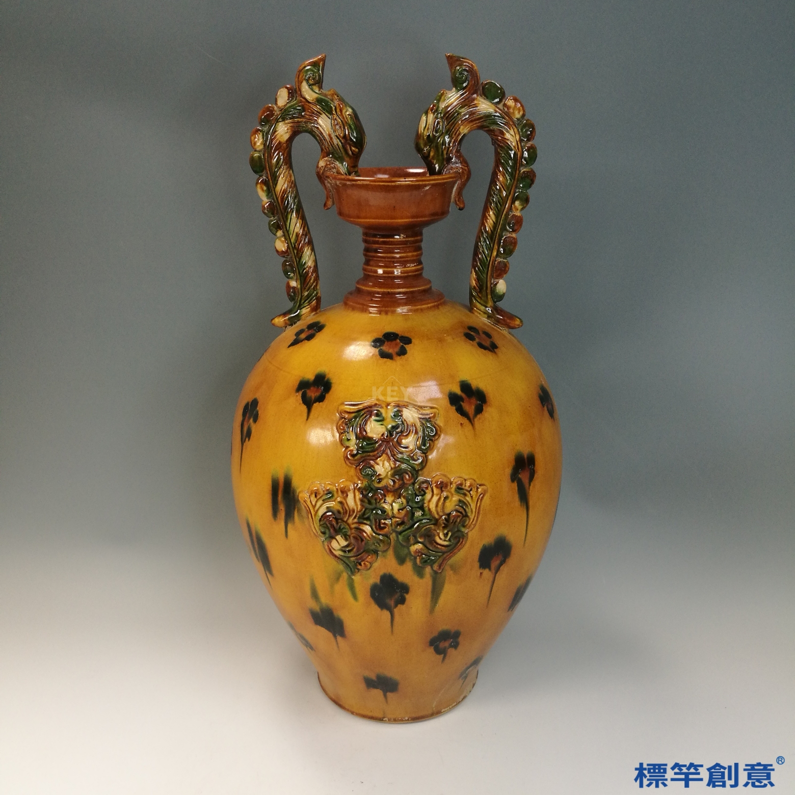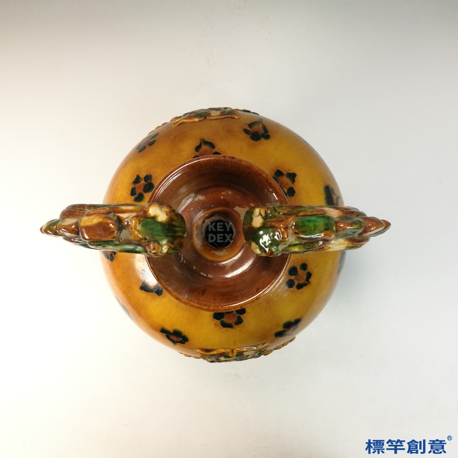 FB151 唐代鞏義窯黃釉綠褐彩貼塑獅面紋雙龍耳大瓶