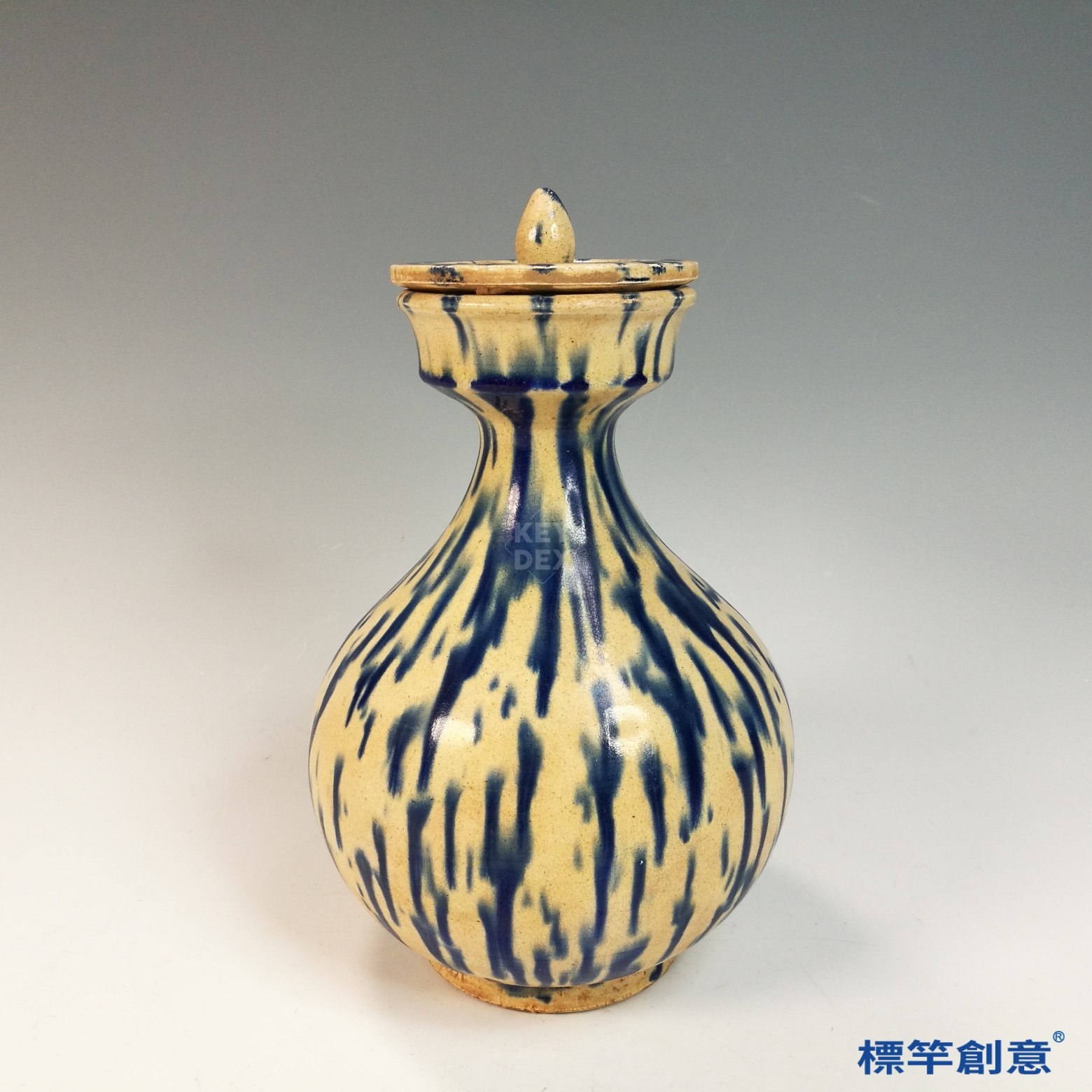 通體施淡黃釉為地,釉面溫潤光亮,並隨機灑施藍釉斑點,形成潑墨般的裝飾效果,藍斑深邃而不規則,具有視覺動感。器表施釉均勻,盤口與蓋面同樣施釉,蓋鈕尖挺有力,呼應整體造形。