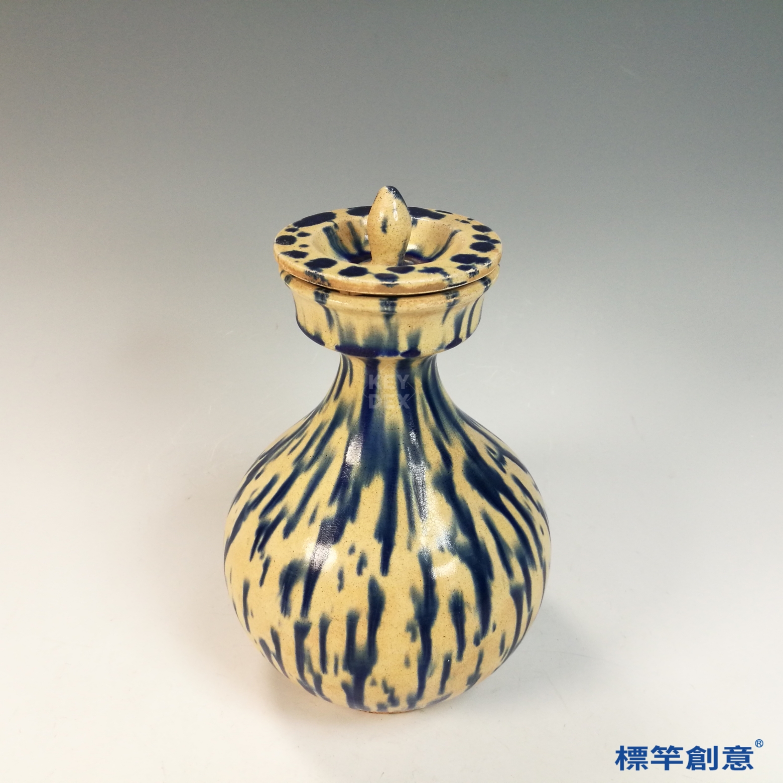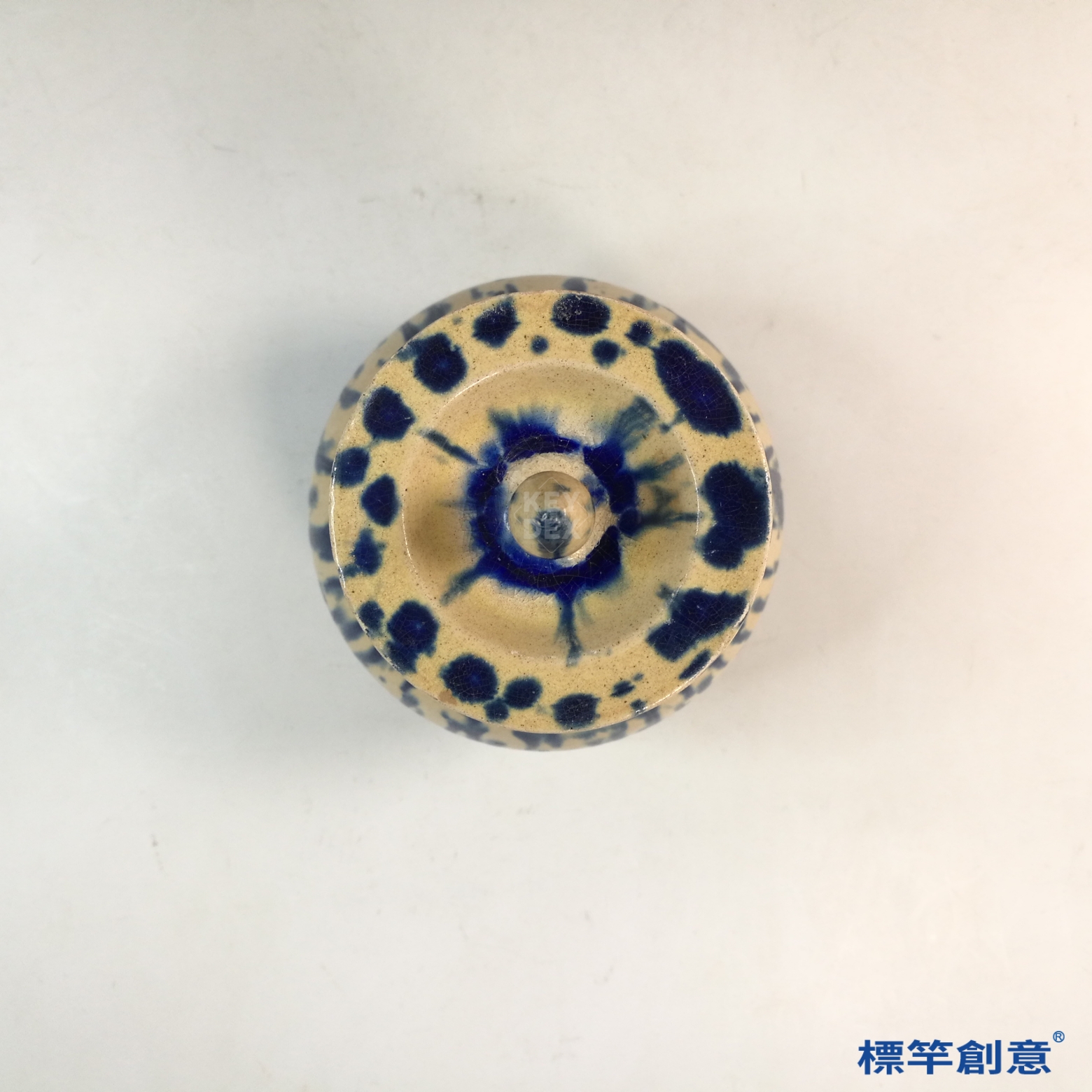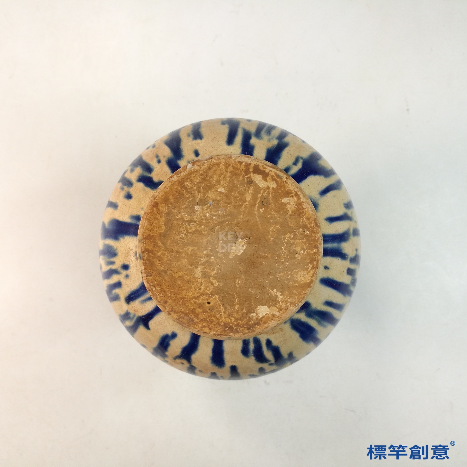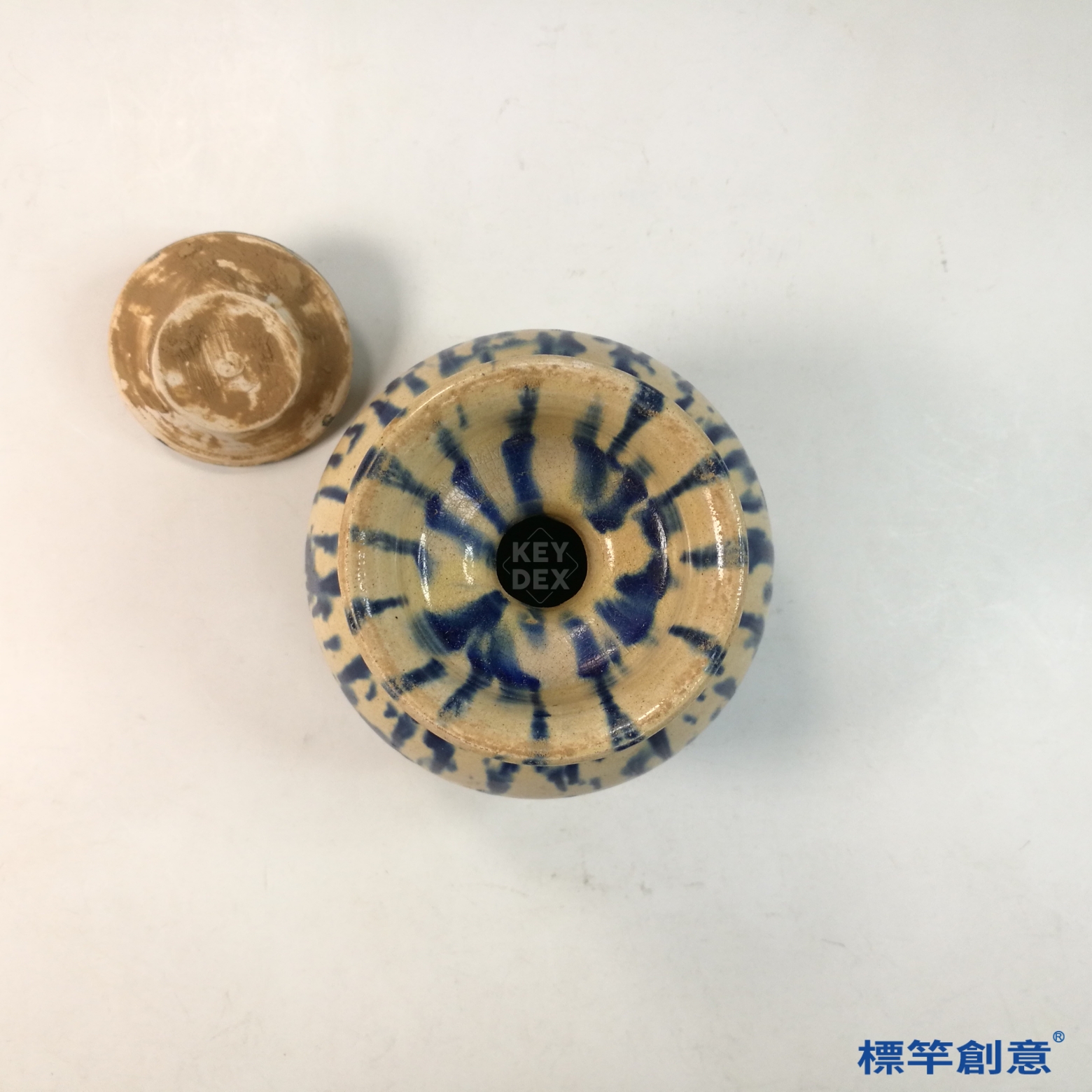本器造形簡潔大方,蓋鈕與盤口設計富層次感,適合作為現代日用陶器或文創器皿設計靈感,亦可運用藍斑與淡黃釉對比手法,應用於家飾或茶具創作之中,喚起東方古典美學風格。