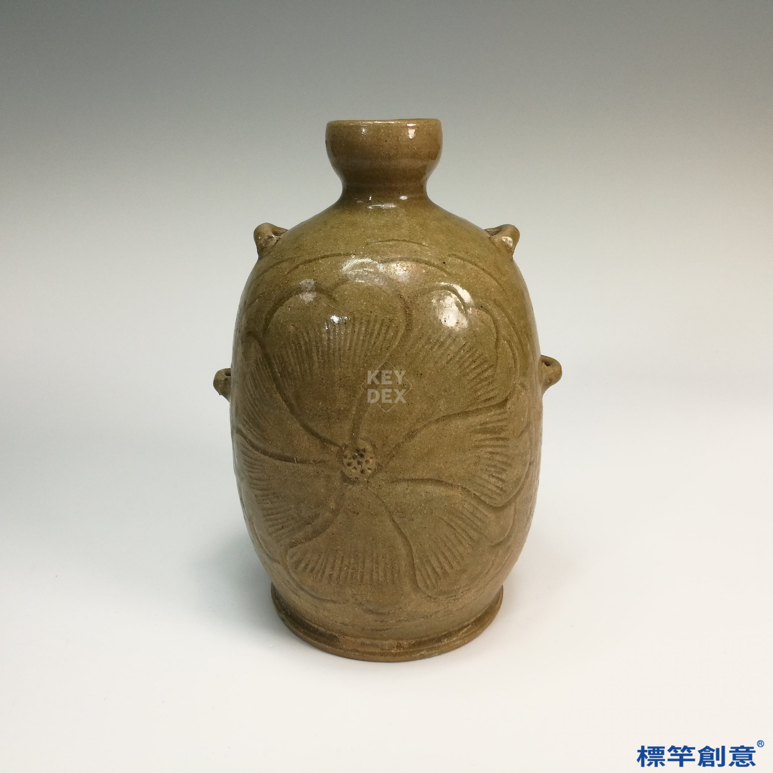 通體施青釉,釉層透明而緊貼胎體,色澤為典型的灰青色或橄欖綠色,釉面光潤。瓶身兩面以刻劃技法裝飾大型花卉紋樣,構圖完整、花瓣舒展,刀工流暢,具強烈裝飾感。肩部貼附一對穿帶耳,塑形勻稱,貼接牢固,為越窯常見實用結構設計。