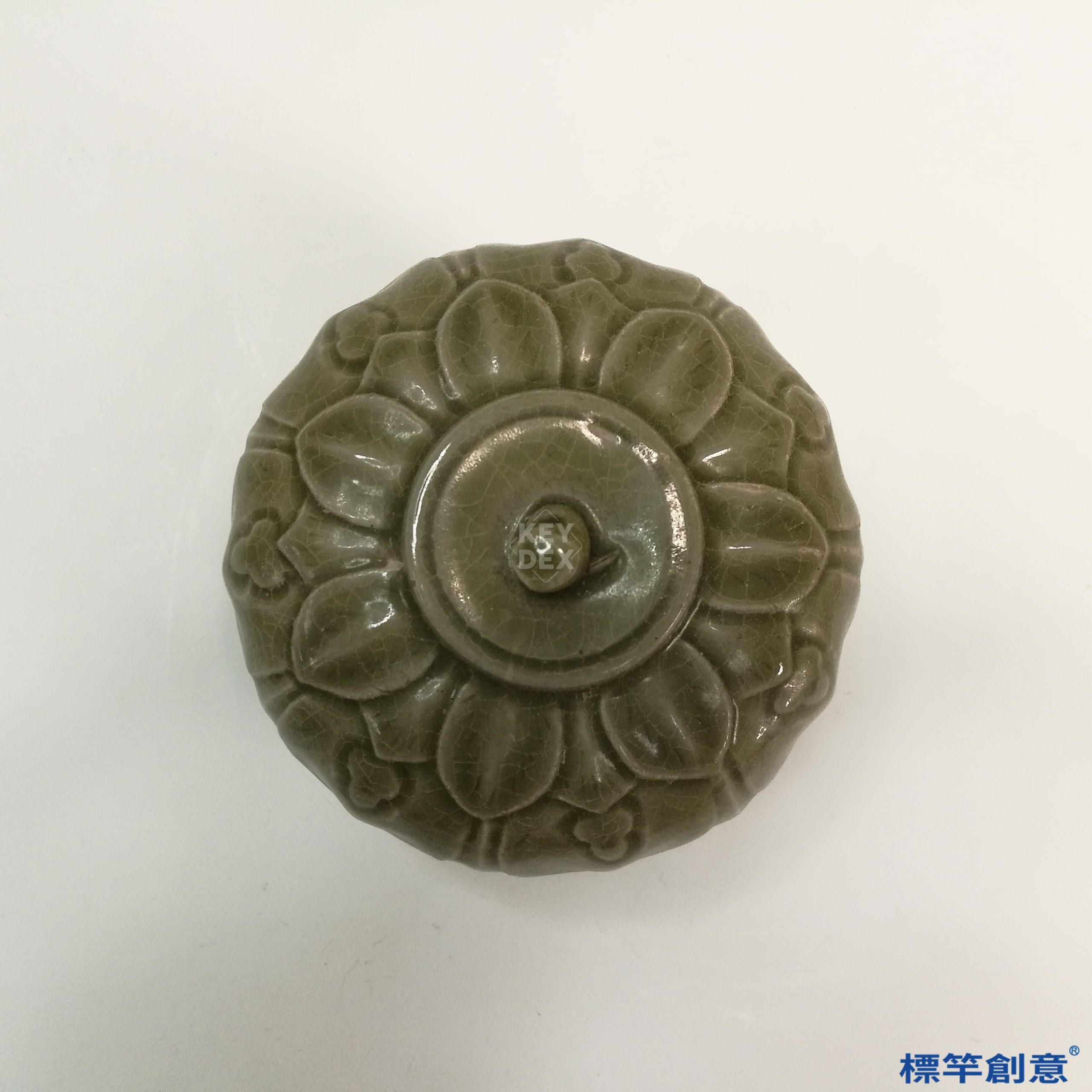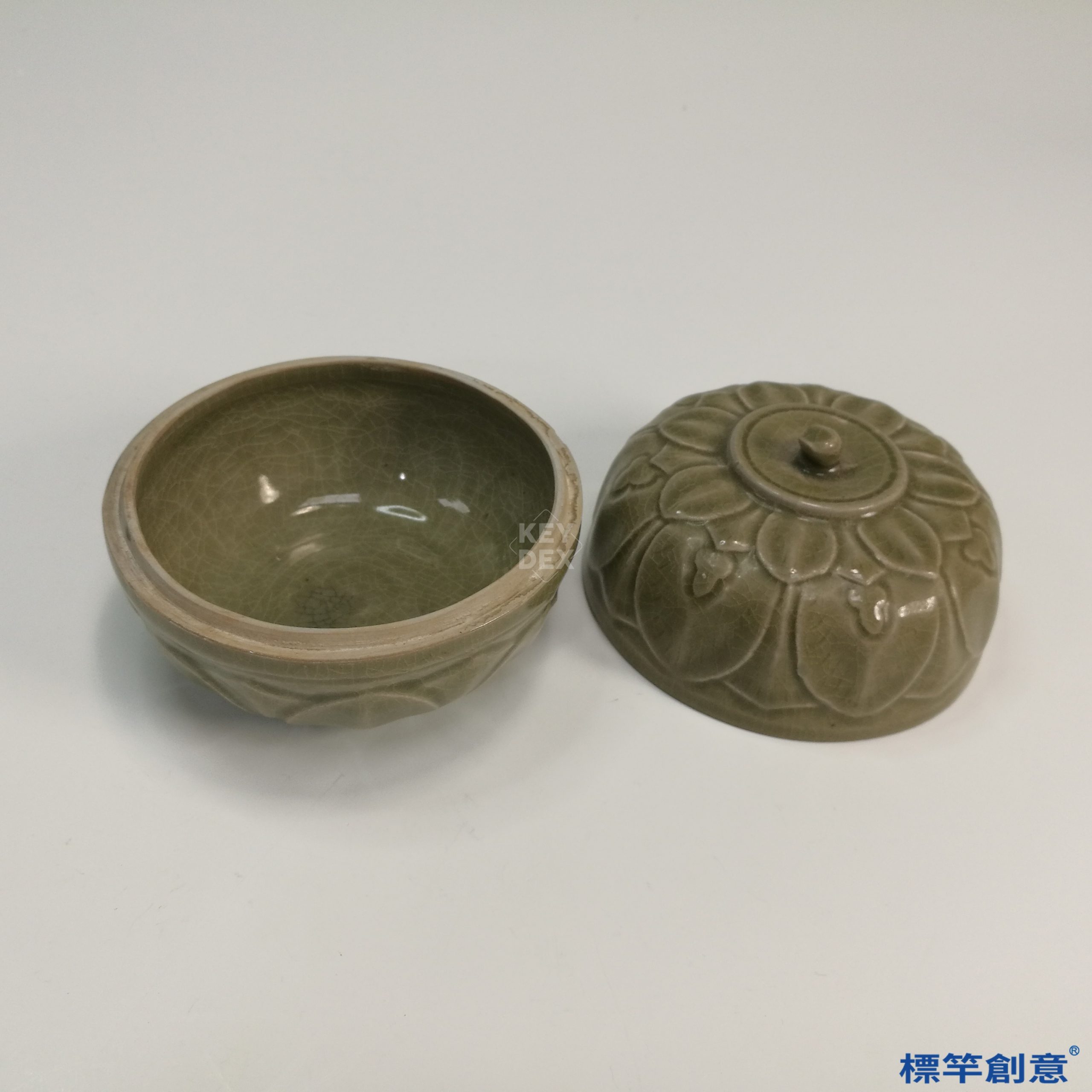 器身施淡土青色釉,色澤溫潤沉靜,釉層中可見開片細裂紋。全器通體刻劃蓮瓣紋飾,花瓣層層疊加,構圖對稱。蓮瓣紋由蓋面延伸至器腹,構成一體連貫裝飾。