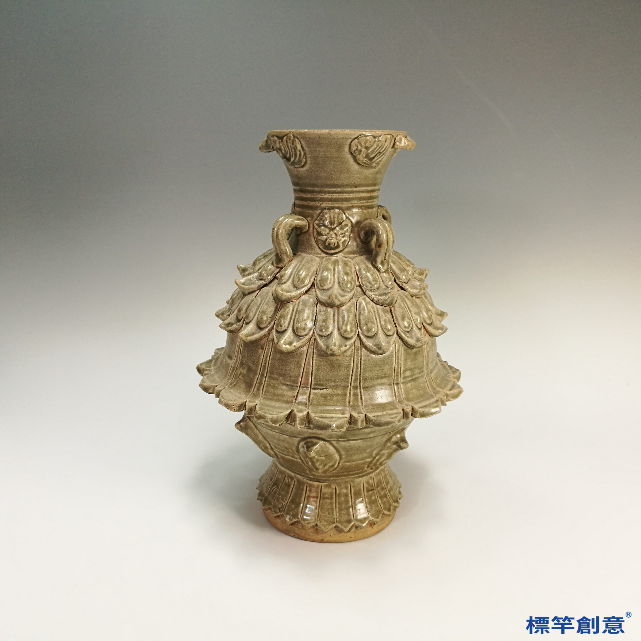 通體施青釉,釉色呈土青帶灰,釉面光潤穩重。器身以貼塑工藝重複堆疊蓮瓣紋飾,立體感極強,刻畫細緻。肩部附雙龍耳,頸與肩飾以雲紋與蓮花為飾,頗具宗教美學意涵。