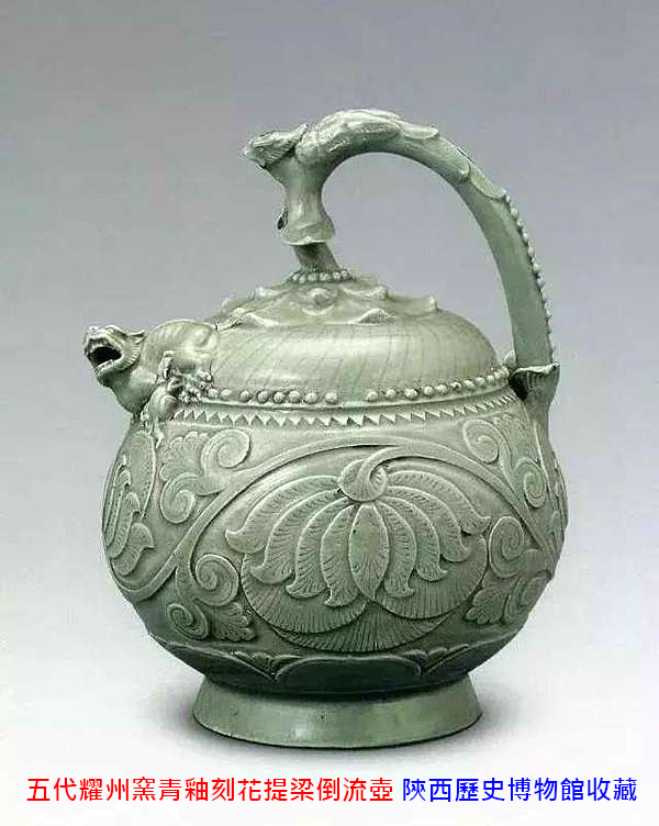 FC026 五代耀州窯淡青瓷刻纏枝蓮紋獸首提梁倒流壺