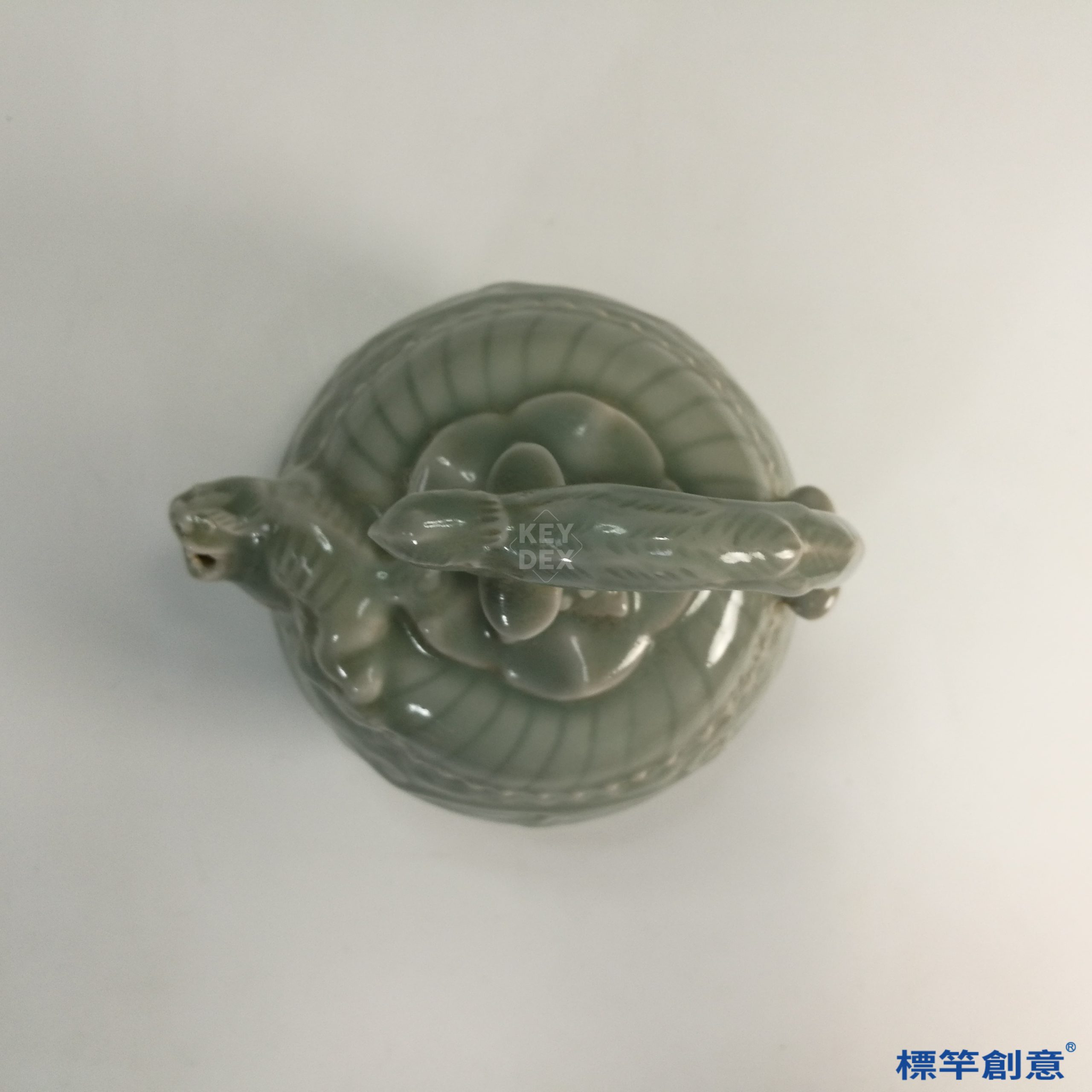 本器由陶輪拉坯成形,再行刻花、貼塑獸首與提梁,待乾燥修整後整體施釉,入窯高溫還原氣氛燒成。耀州窯於五代時期已能準確控制釉色與構件黏合,技術成熟穩定,特別在提梁與蓋飾部分尤見工藝匠心。