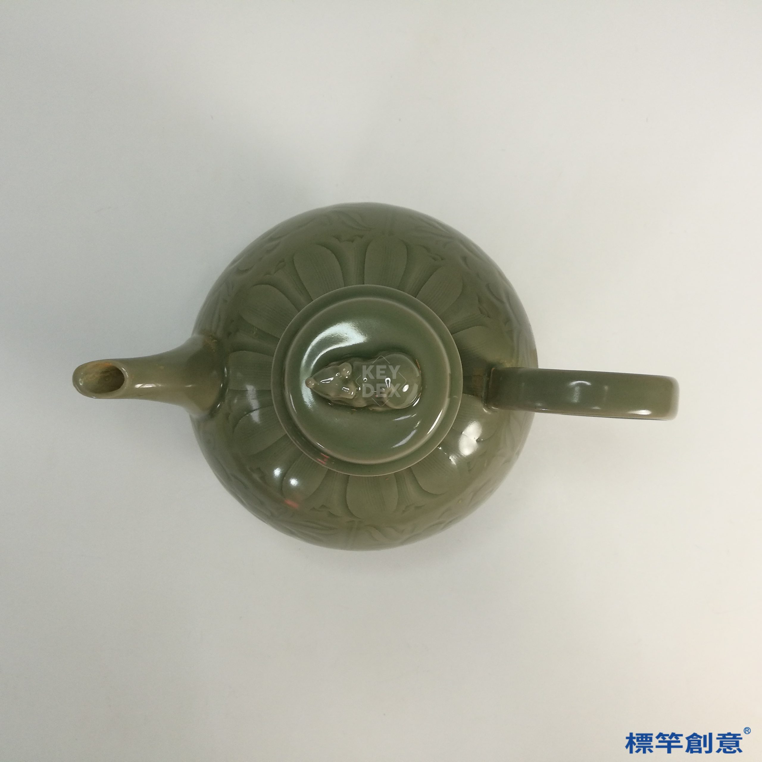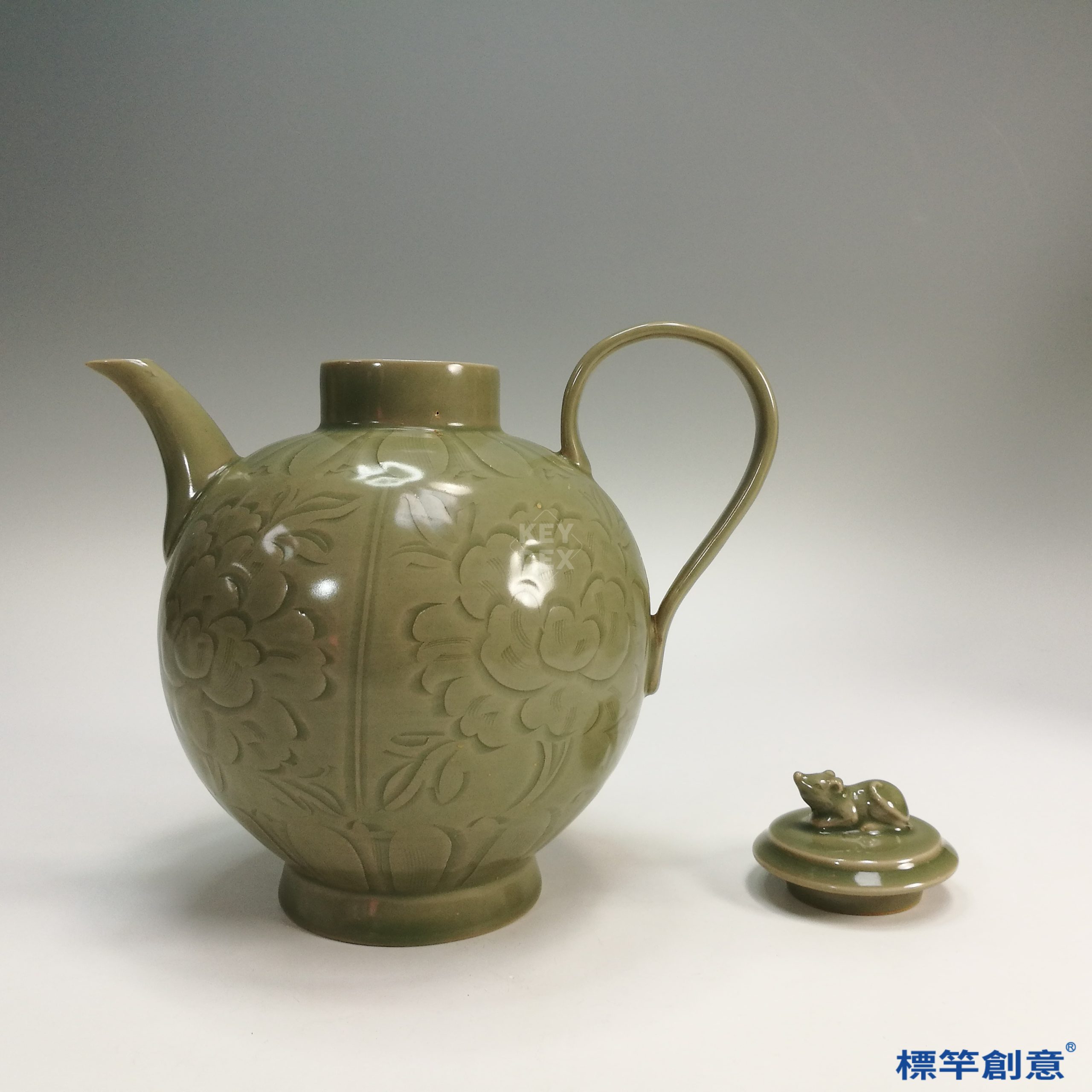 FC030 五代越窯祕色瓷刻纏枝花卉獸鈕執壺