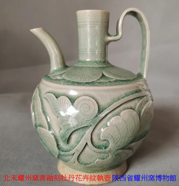 器表施淡青釉,釉層均勻細潤,泛微黃調,屬典型耀州青瓷特徵。壺身通體以清晰地技法刻飾,盛開牡丹紋,花瓣簇狀,線條流暢,葉脈波紋。