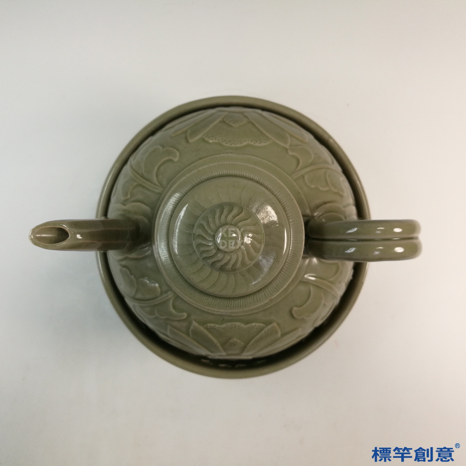 通體施青釉,釉色潤澤柔和,呈現淡綠偏灰之典型越窯色調。壺身與壺托皆飾刻蓮花紋,紋飾精緻繁複,線條流暢。壺托外壁鏤空鏤刻,呈放射式蓮瓣紋與連枝蓮葉,工藝難度高,兼具透氣與裝飾效果。蓋鈕造型為蓮實,與整體紋飾呼應,構圖統一。