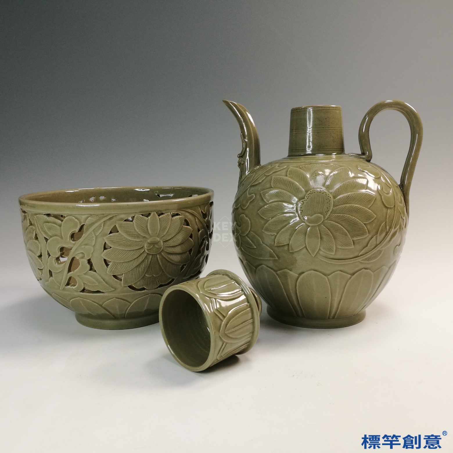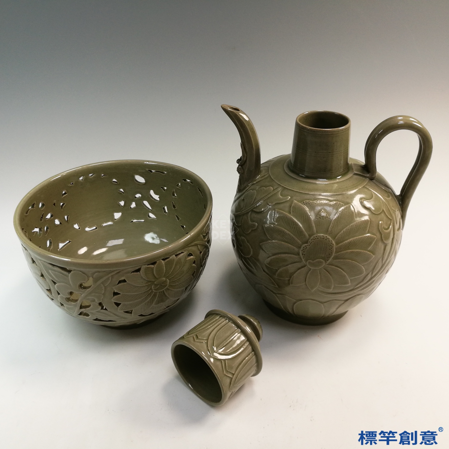 FC036 五代越窯青瓷鏤空刻蓮花酒壺壺托一套