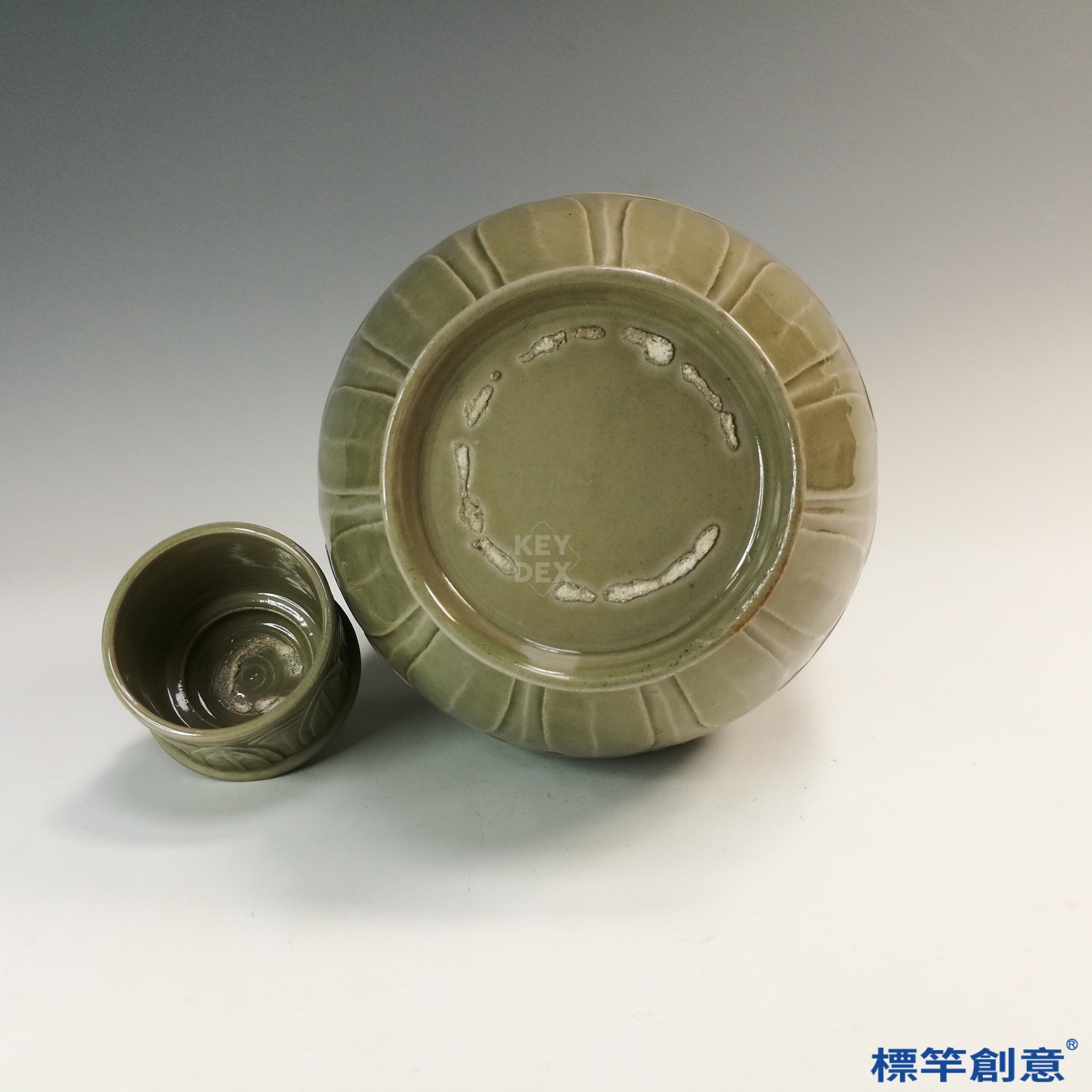 本器為五代時期越窯製品,產自浙江地區。越窯自東漢以降歷經六朝至五代,其青瓷燒製技術日臻成熟,五代為其發展高峰,常見供應宮廷與佛教用途之高級器具。本器套組即體現此一時期越窯複合器形的發展與應用。