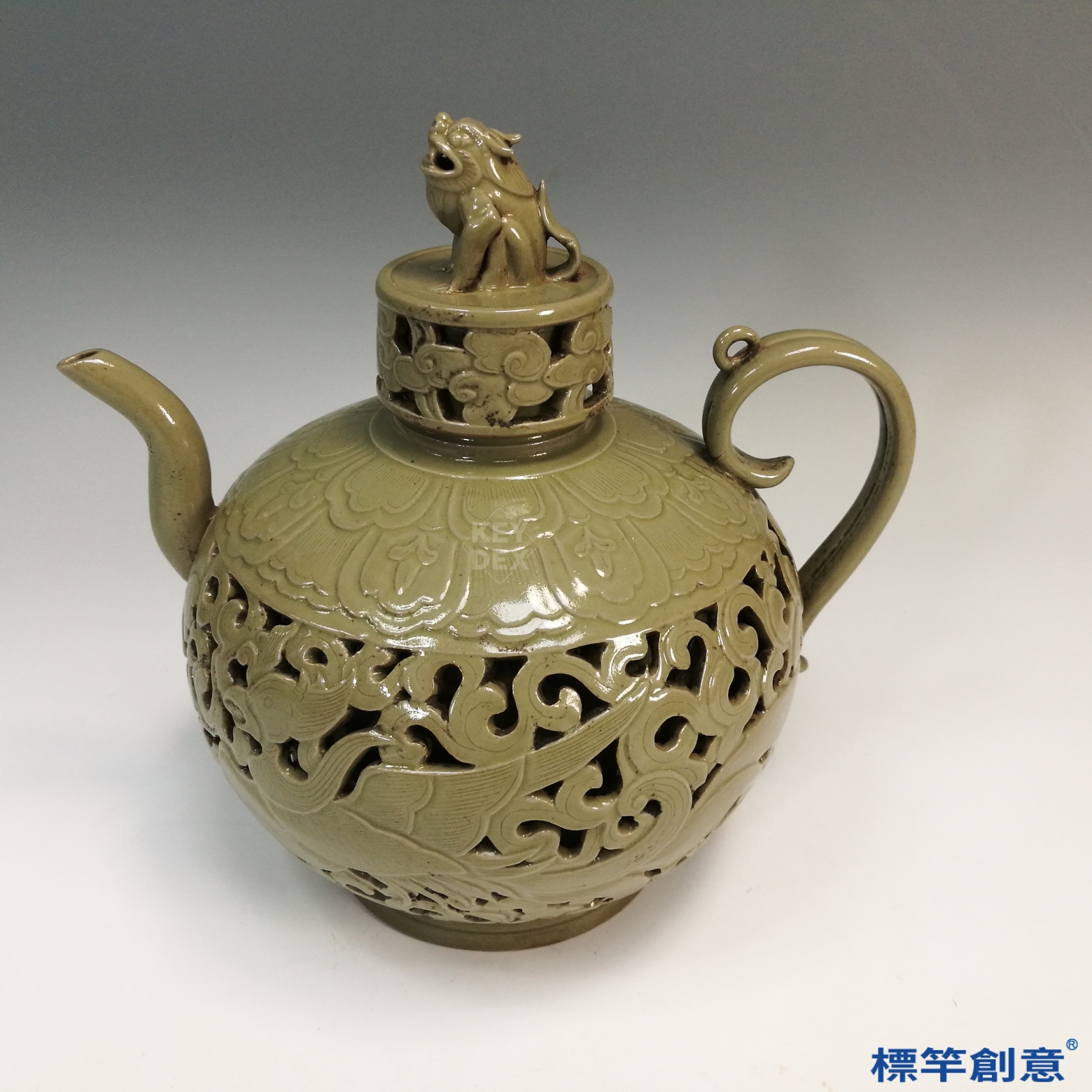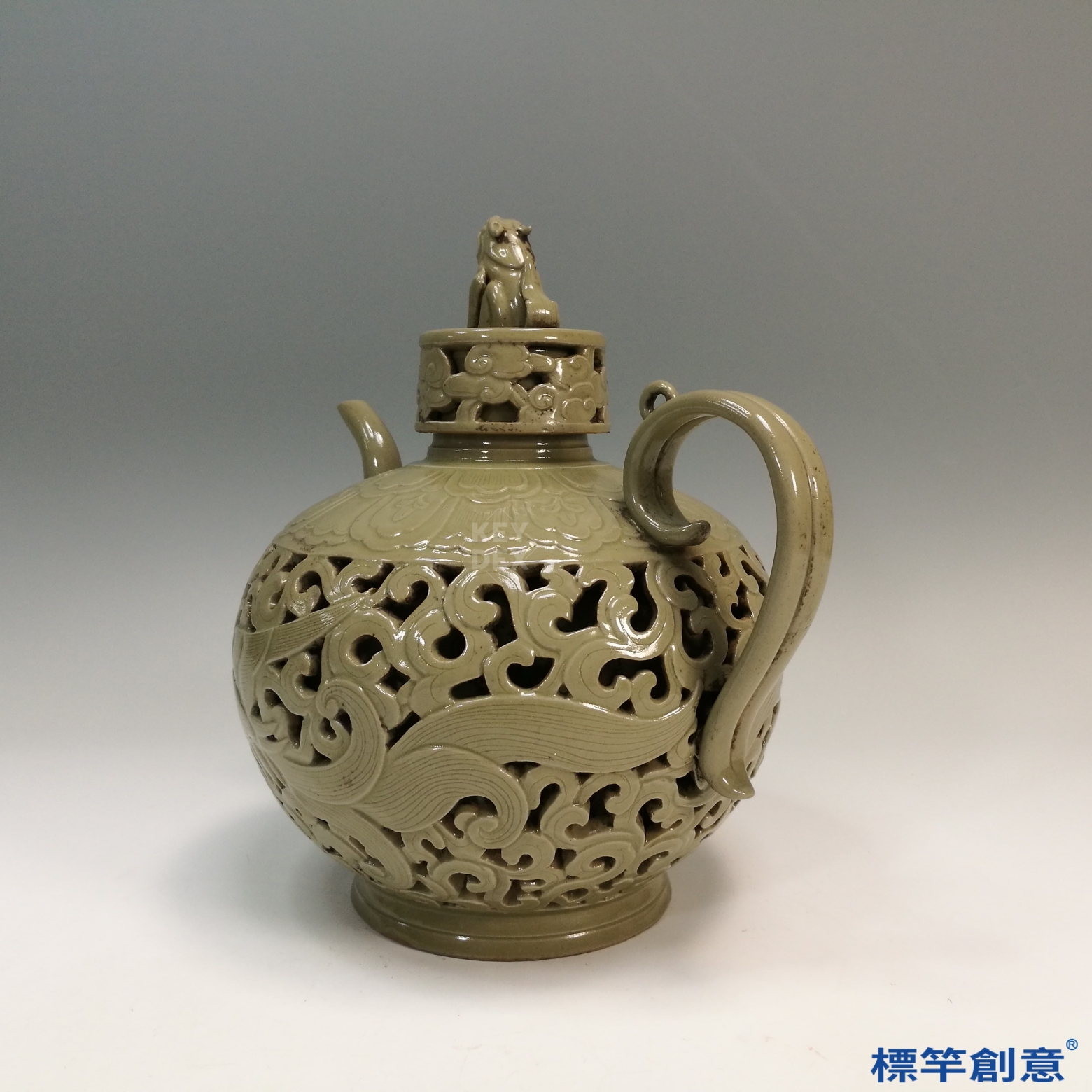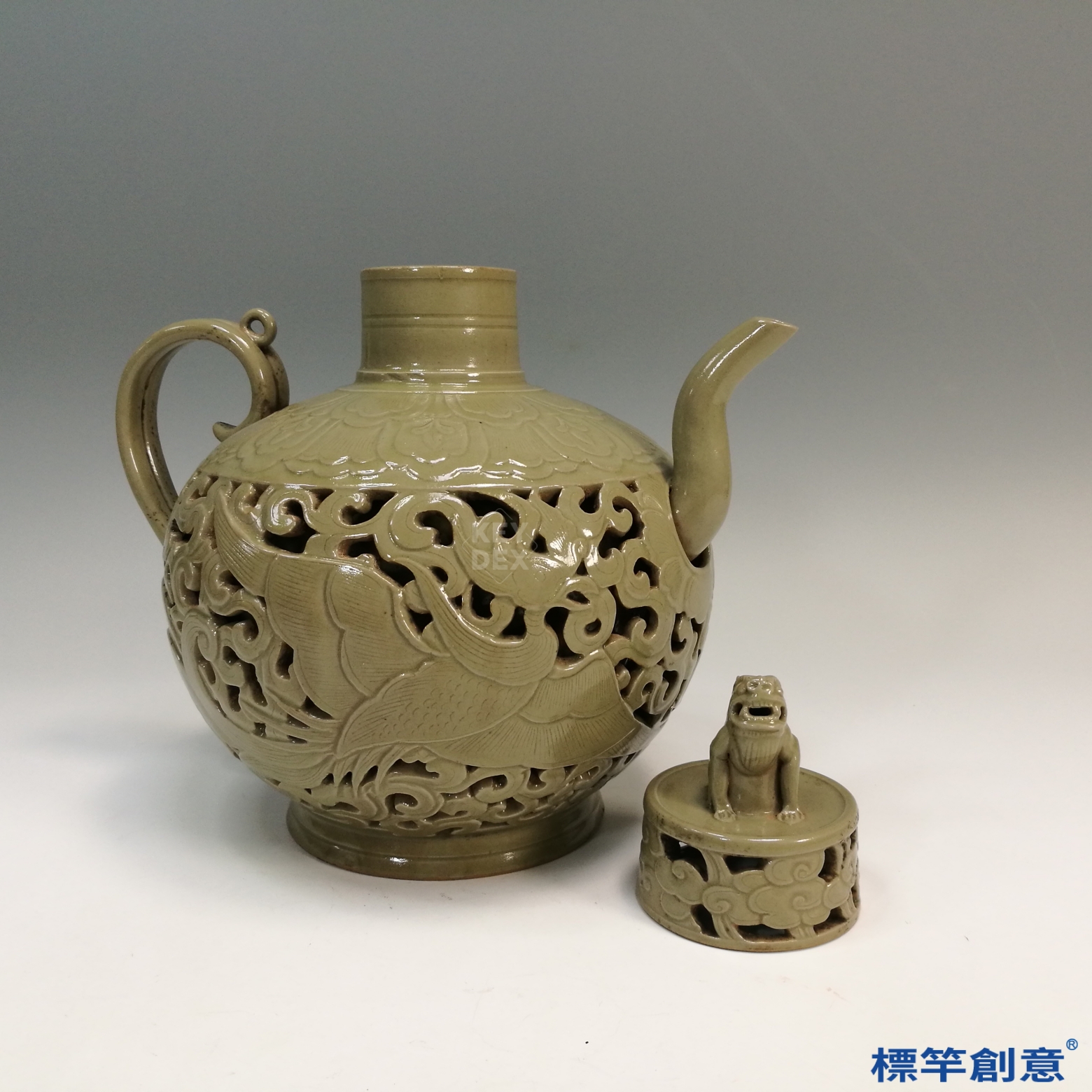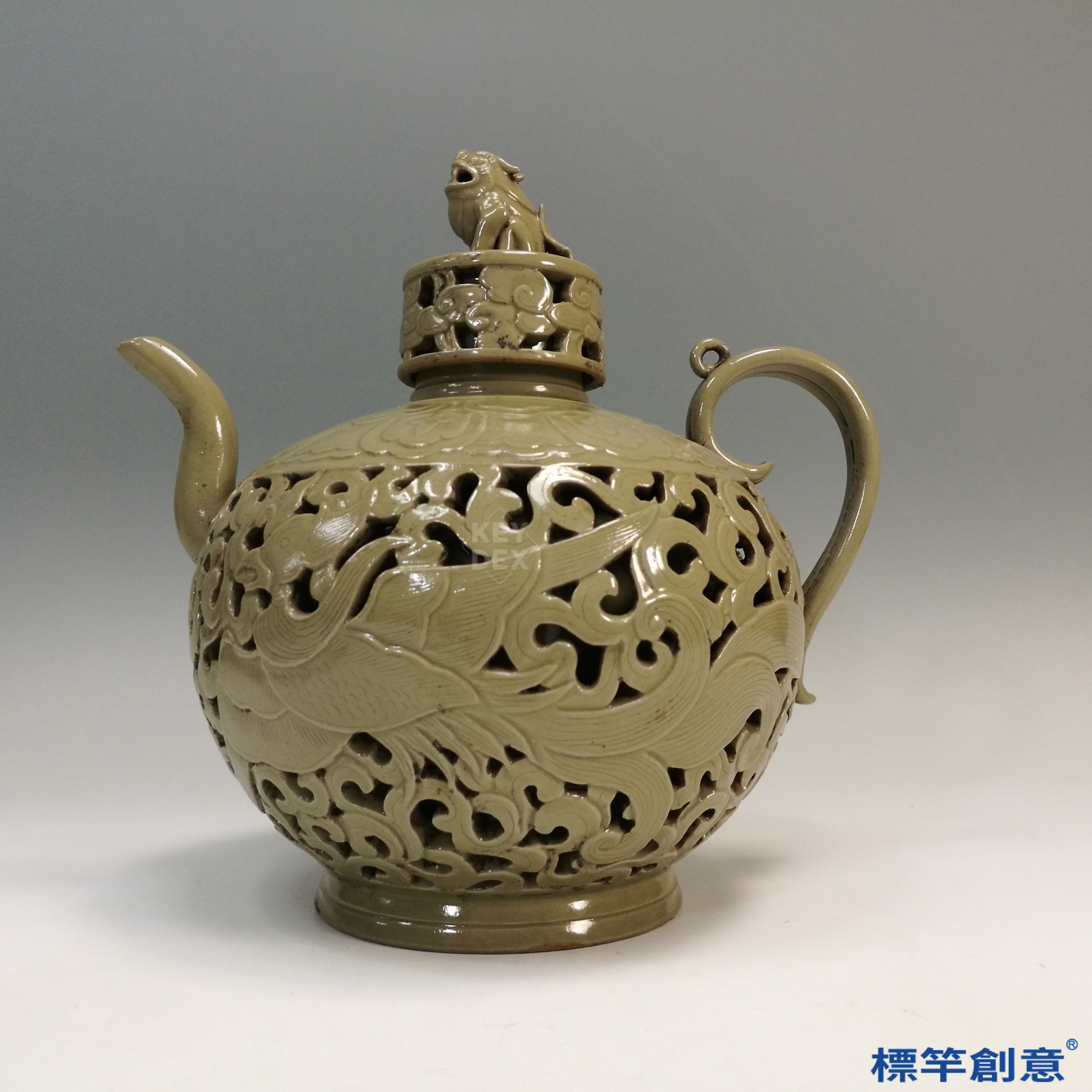 FC038 五代越窯青瓷鏤空刻鳳凰紋獸鈕執壺