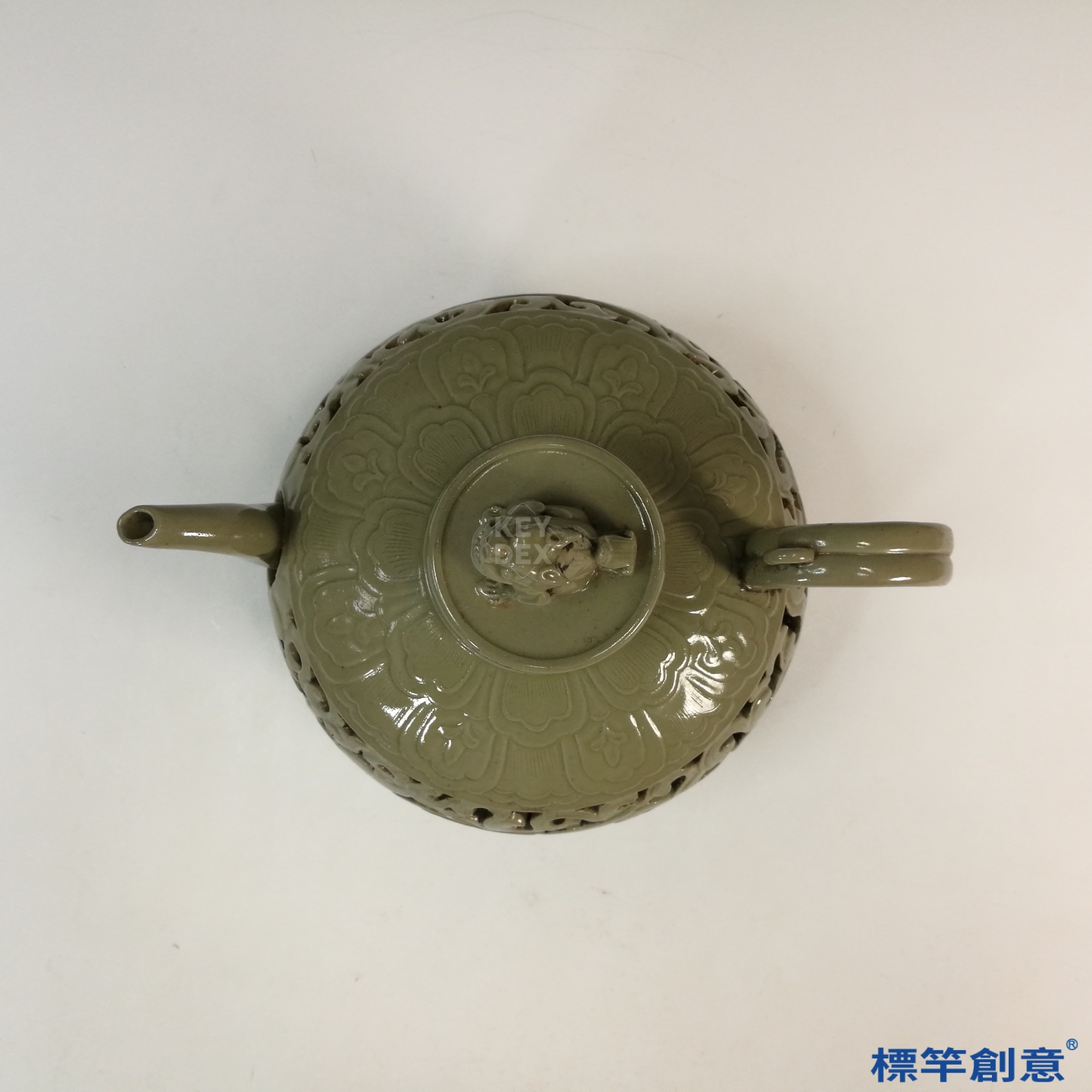 本器通高約25.5公分,腹徑約26公分,器形為壺式結構,壺身圓潤碩大,短頸外撇,肩部圓滑過渡至壺腹。雙側設有流嘴與圈柄,比例勻稱。壺身鏤空處為中空雙層結構,整體器形重心低穩。壺蓋中央置一浮雕獸形鈕,神態靈動,蓋緣亦飾有小型鏤空圖案。