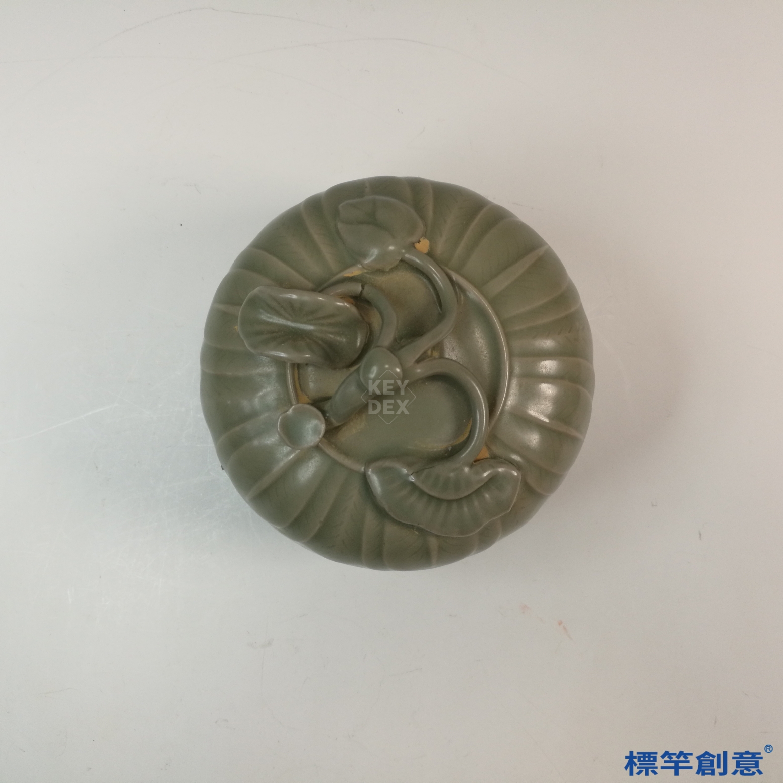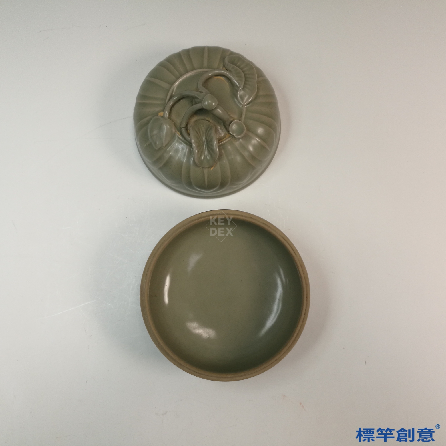 FC044 五代越窯青瓷貼塑蓮瓣藤枝紋蓋盒