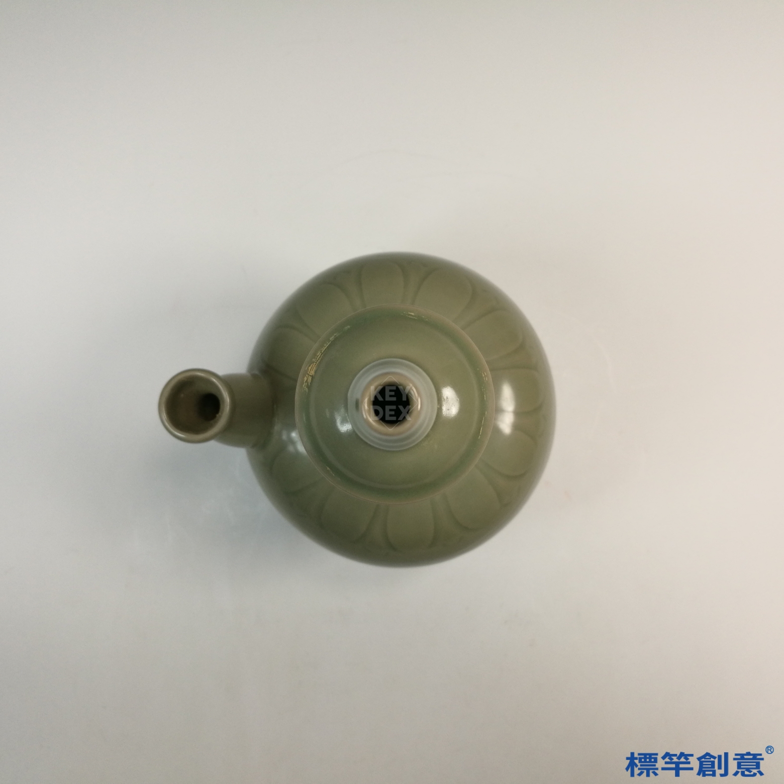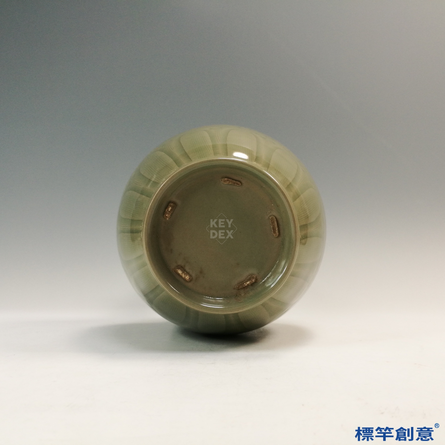 通體施青釉,釉色青中泛灰,澤潤如玉,光澤溫潤。器表刻飾蓮瓣紋,對稱排列於腹部與頸根,刀法俐落,脈絡分明。胎體細密,胎釉結合緊密,釉層流暢自然,無明顯瑕疵。整體器形結構嚴謹,設計考究。
