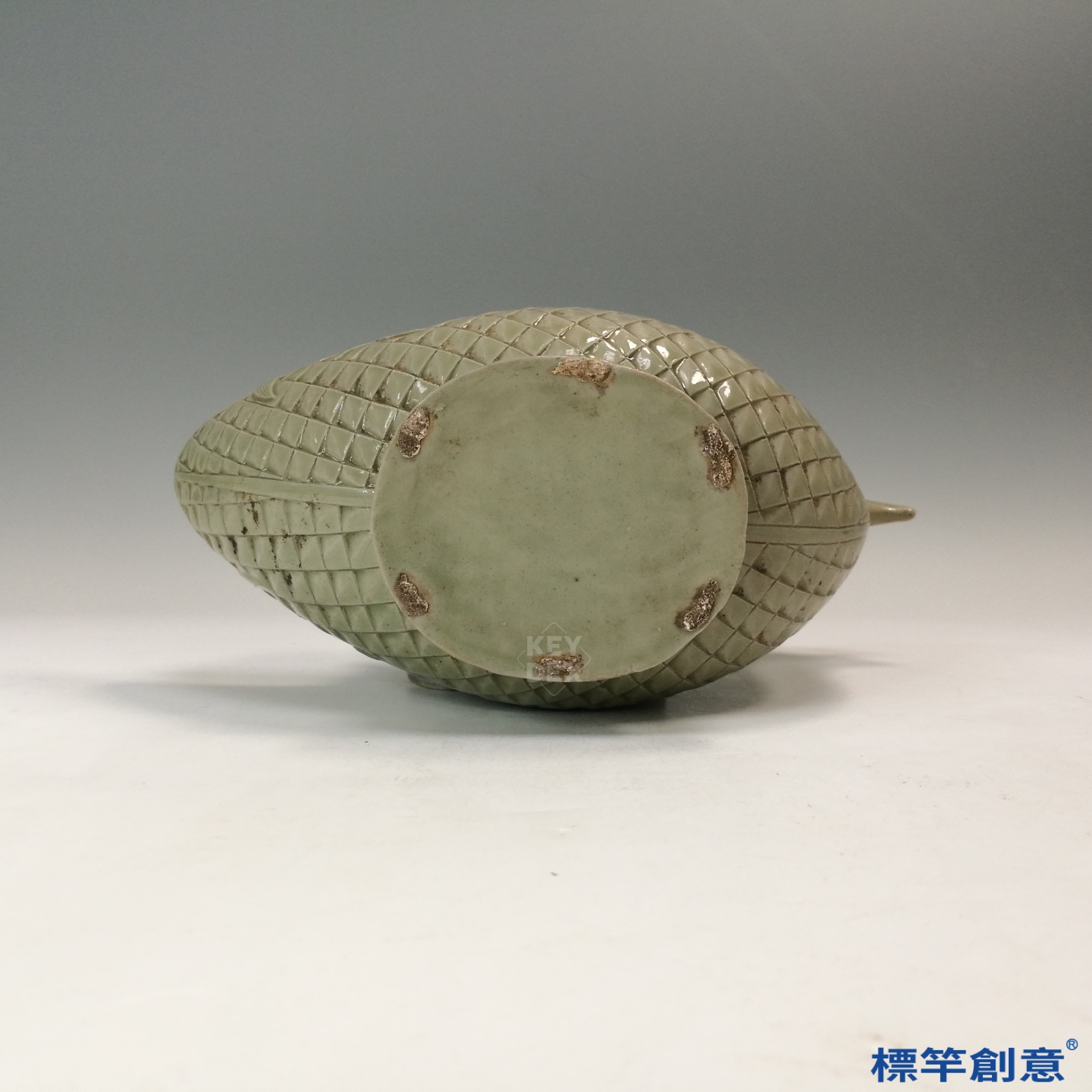 器體採模印與手工結合製作,成形後進行魚鱗與細部刻劃,再施青釉後高溫還原燒成。此類異形壺在燒成過程中易變形,顯示越窯已具備高難度結構控制與成品穩定能力。