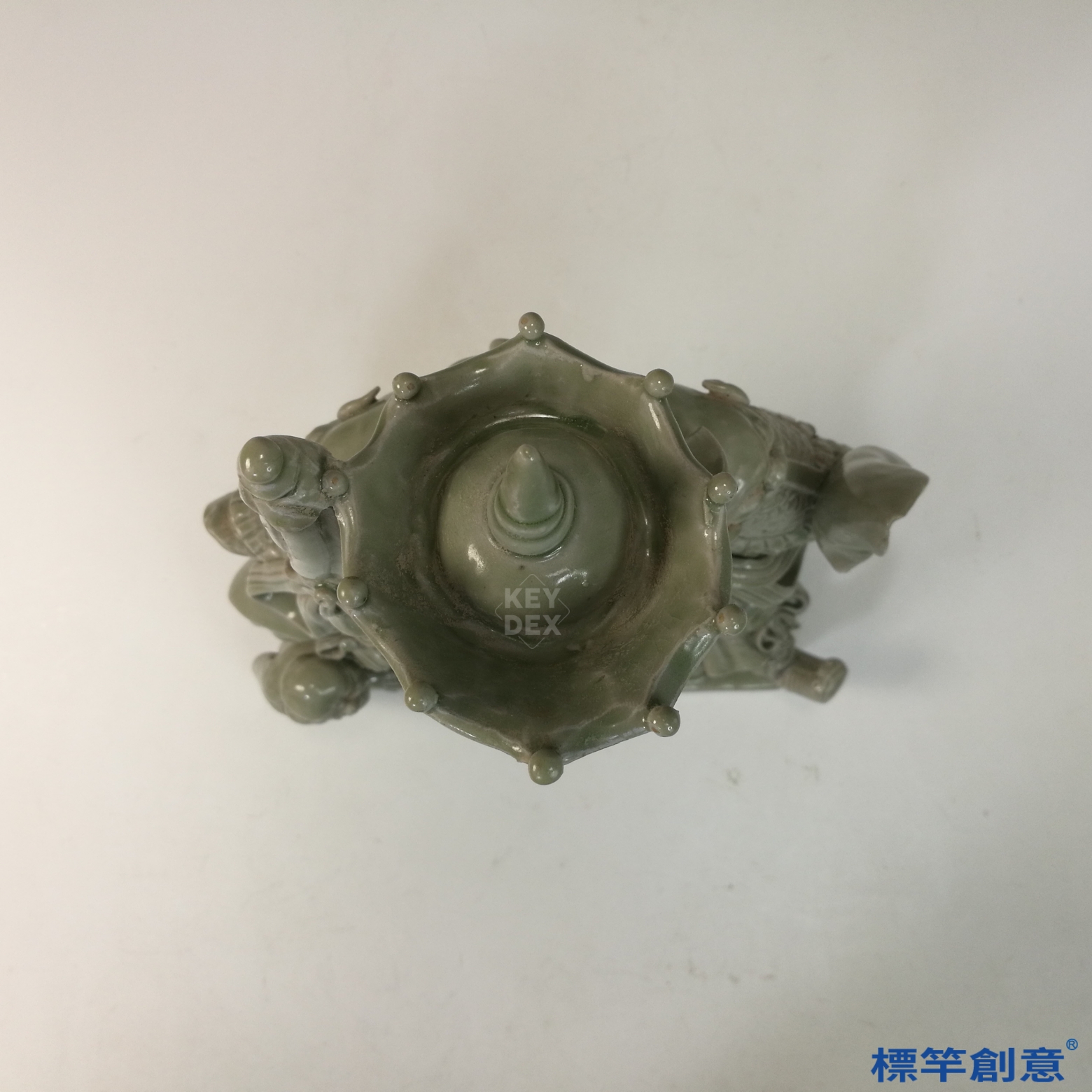 全器施典型越窯青釉,呈溫潤豆青至淡灰青色澤,釉層均勻透明。表面局部因複雜造形產生自然流釉現象,增添層次美感。人物神情雕刻入微,甲胄細節、蓮座衣褶與寶傘均精細刻劃,技法綜合捏塑與模印,表現出高度寫實與裝飾性兼具的藝術語言。