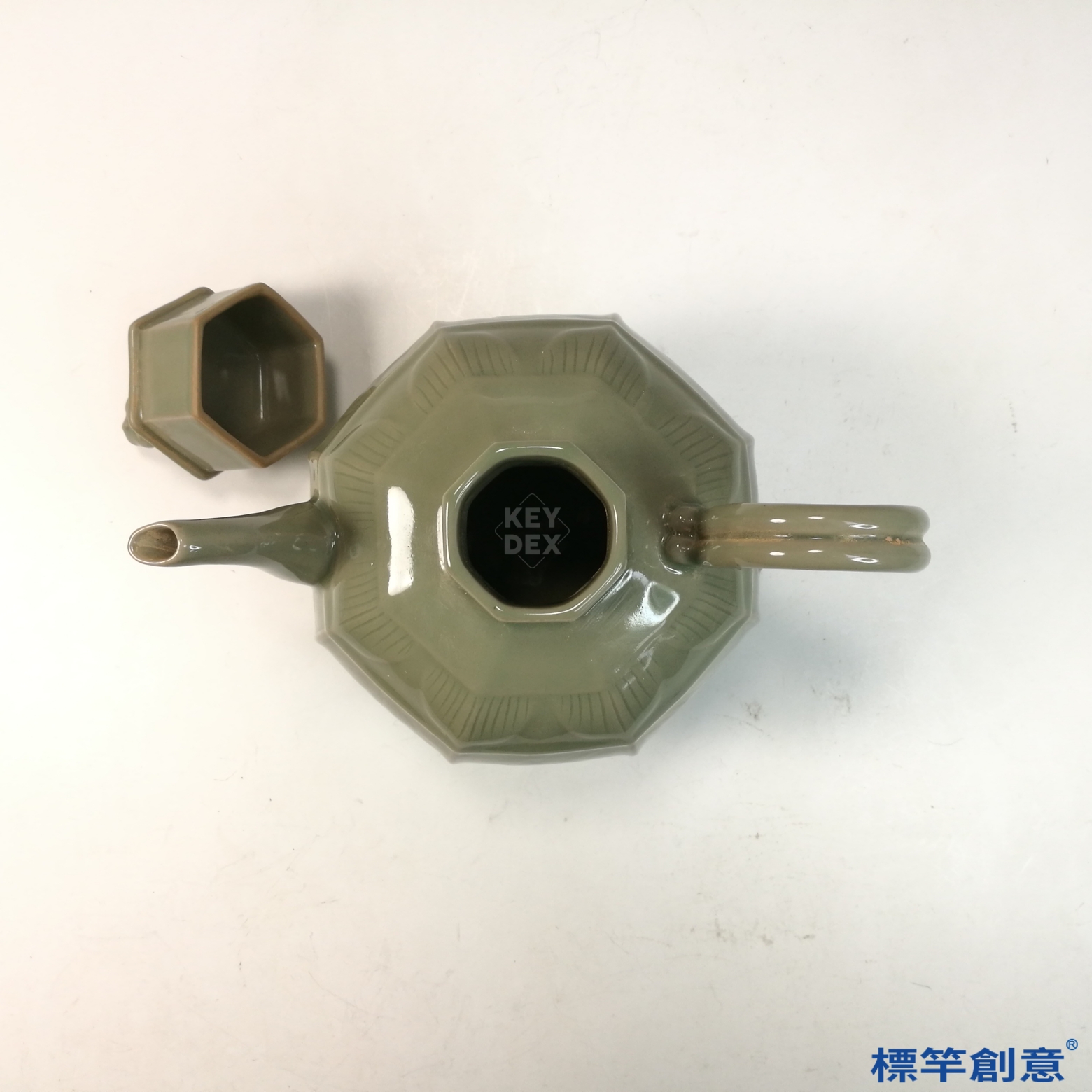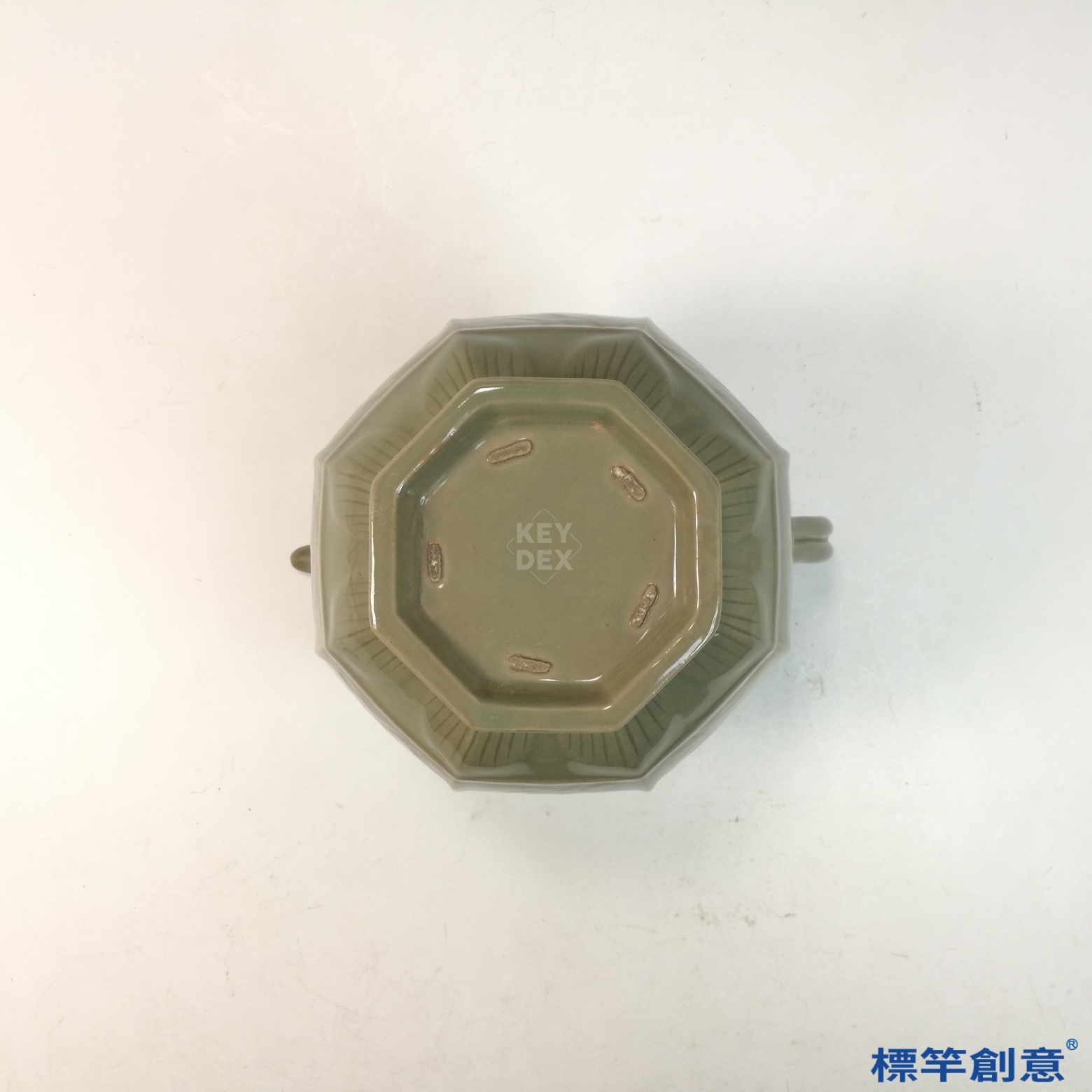 本器通高約21.5公分,腹寬約20.5公分,屬中型壺類。整體呈八稜形瓜棱式造型,口沿平直,壺蓋上飾象形鈕,短直頸承蓋,雙弧形流與柄對稱設置於兩側。圈足外撇,比例勻稱穩重。器表勻施青釉,釉色溫潤,略泛橄欖綠調,具越窯典型風格。