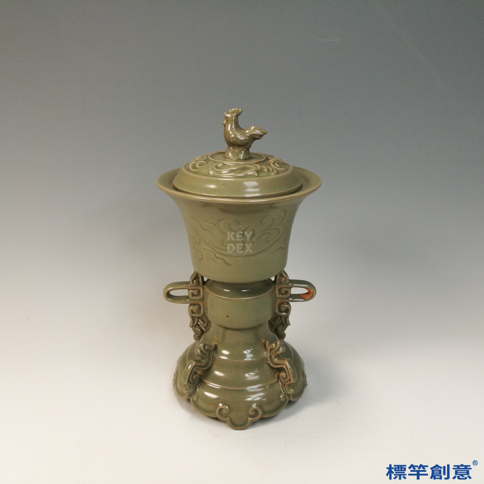 FC076 五代越窯青瓷刻花卉公雞鈕蓋雙層薰香爐
