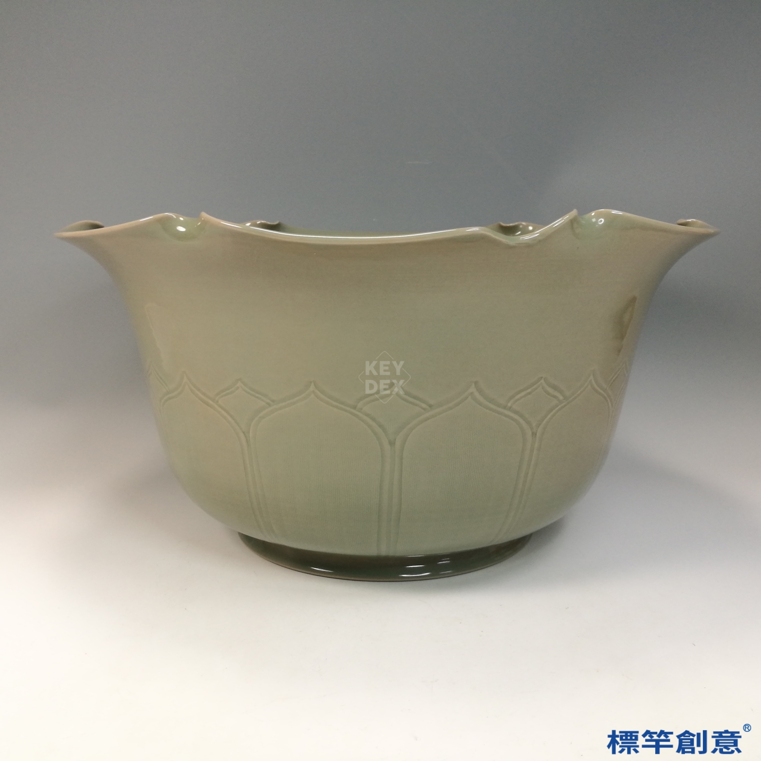 本器花口輪廓與蓮瓣紋結合,具有極高裝飾性,適合應用於現代花器、庭園水缸、空間陳設容器的造型設計參考。其穩重對稱的結構與柔和青釉,亦為室內藝術擺設提供優雅靈感。