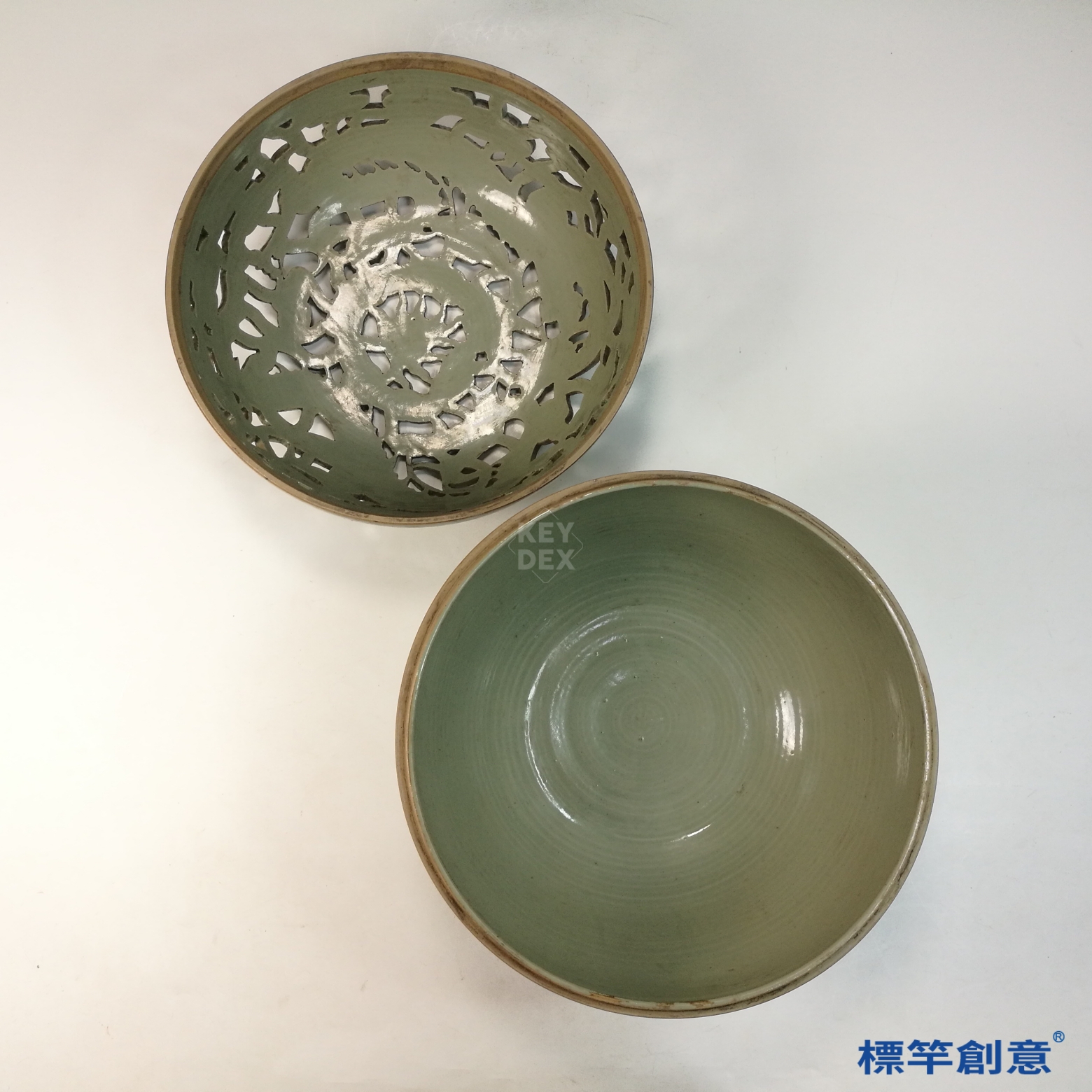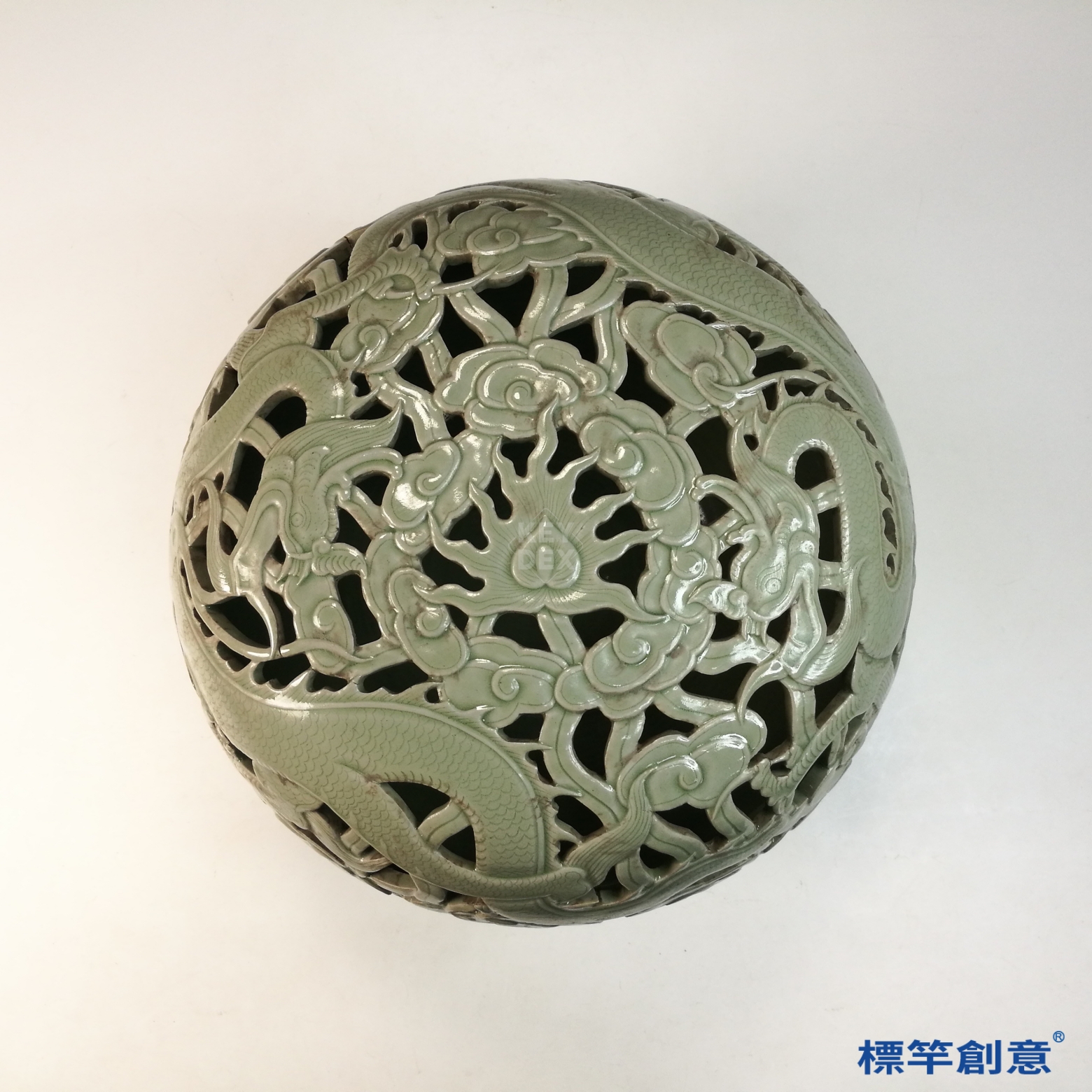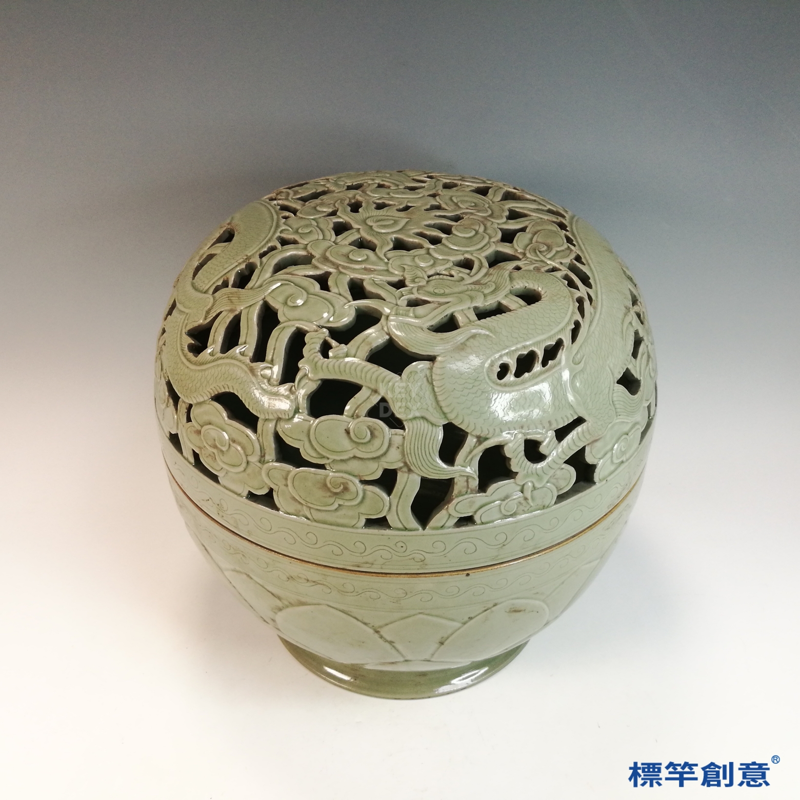 FC084 五代越窯淺青釉秘色瓷鏤空雲龍紋蓮瓣大薰爐