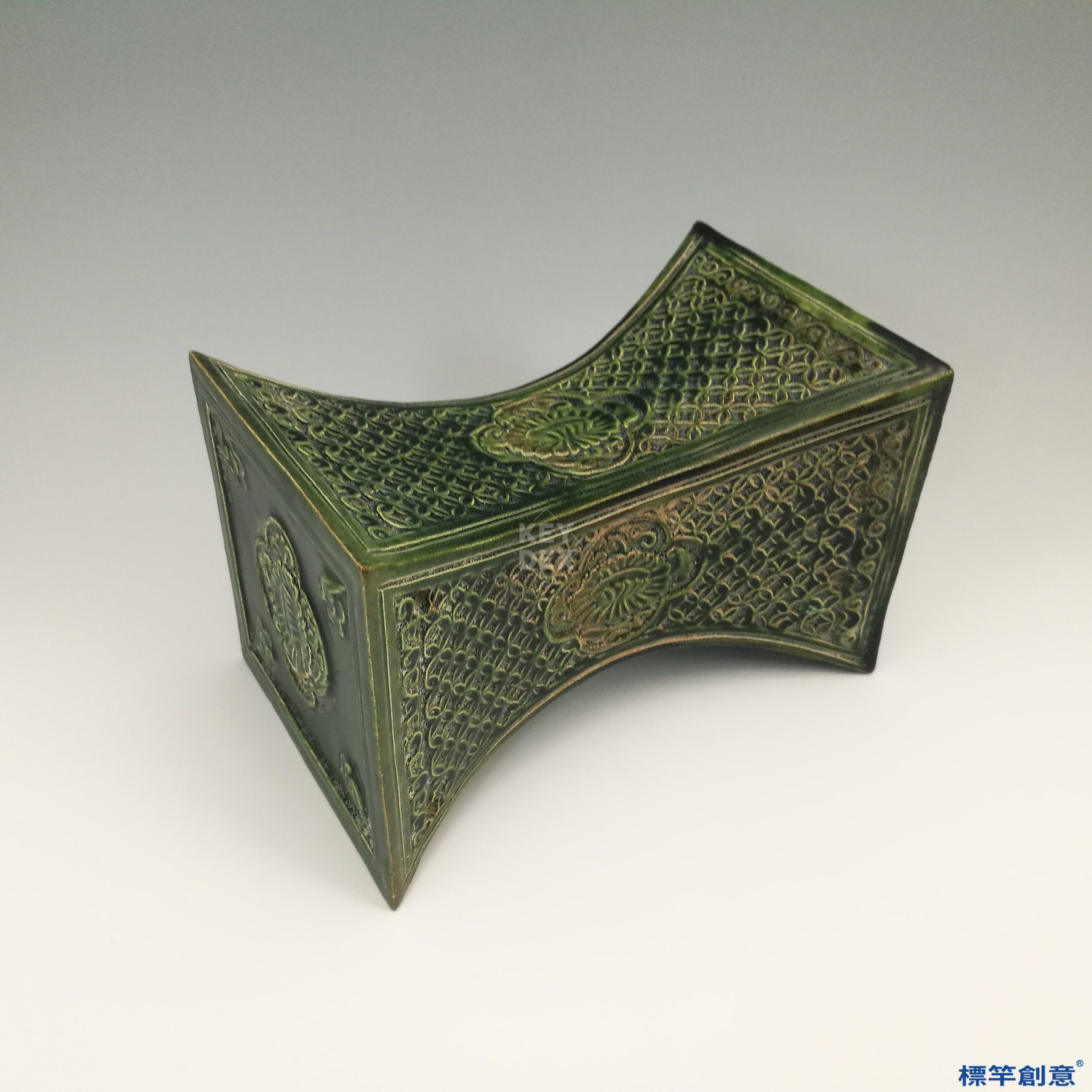 本件瓷枕高10.8公分、長16.5公分,整體為長方弧面造型,兩側略微上翹,構成適合承托頭部的弧形結構。器身四面平整挺拔,線條銳利清晰,比例均衡穩重。