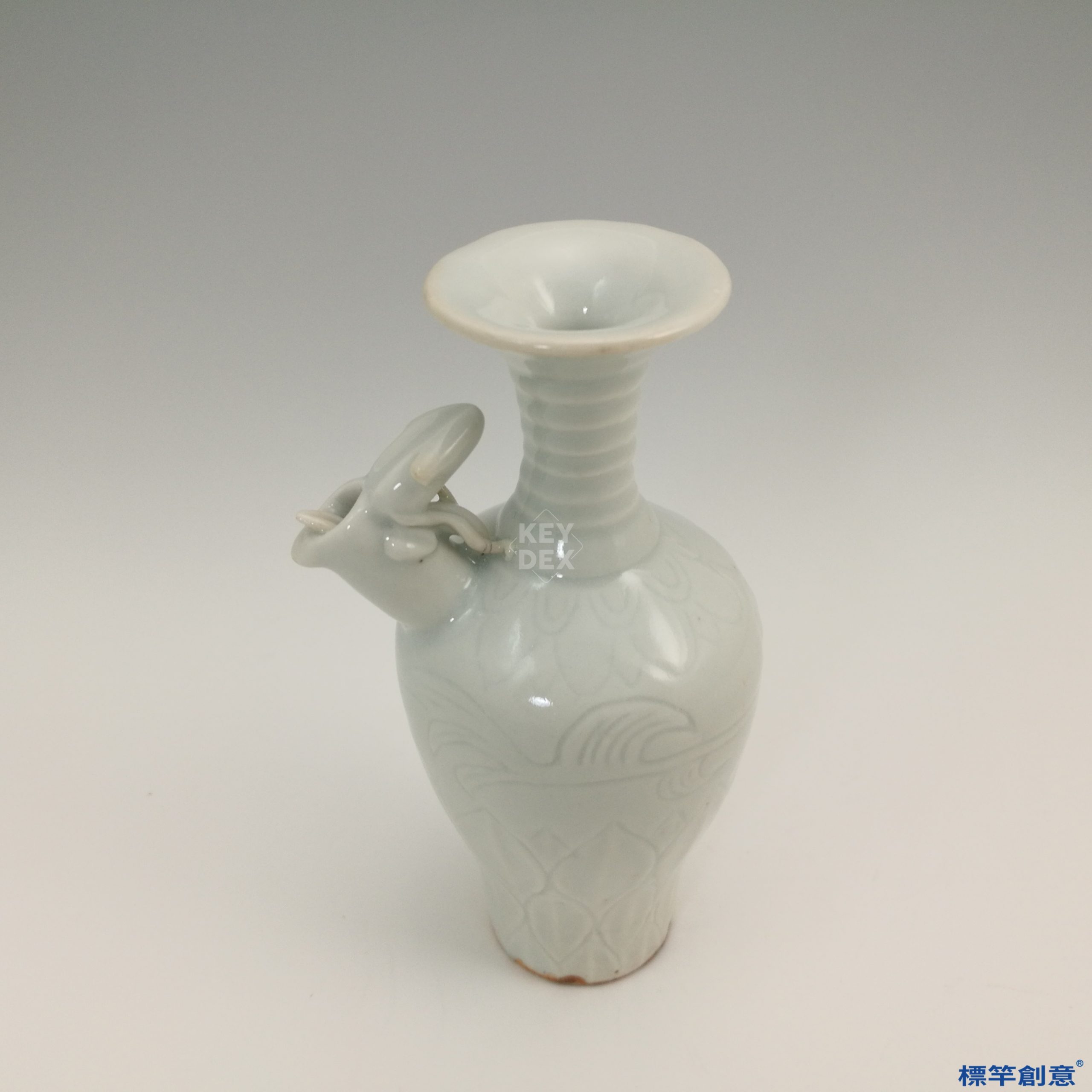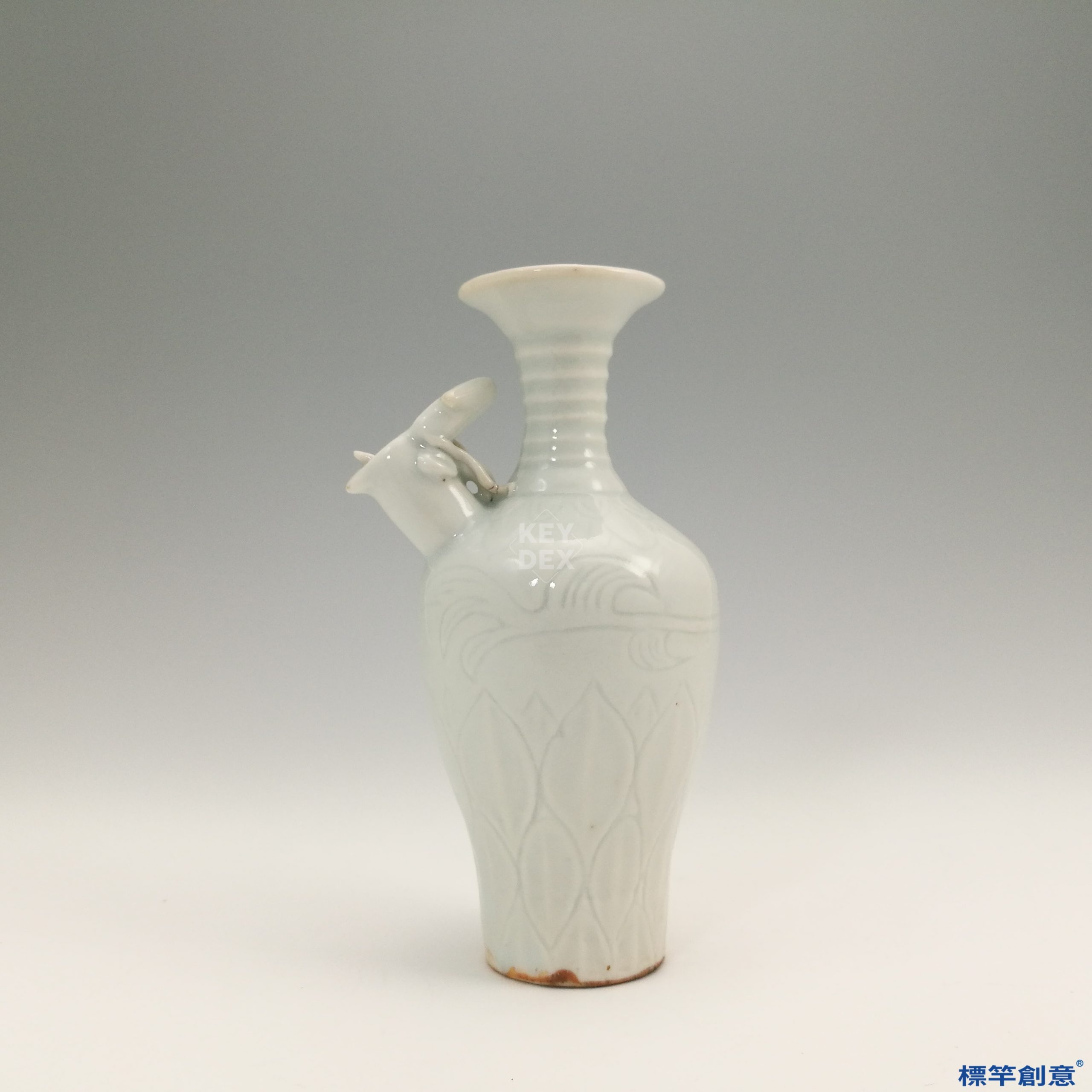 通體施青白釉,光潤柔和,釉下刻有蓮瓣紋,線條流暢,具宋代工藝特徵。象首流為模印粘貼,與瓶身自然銜接,富浮雕感。
