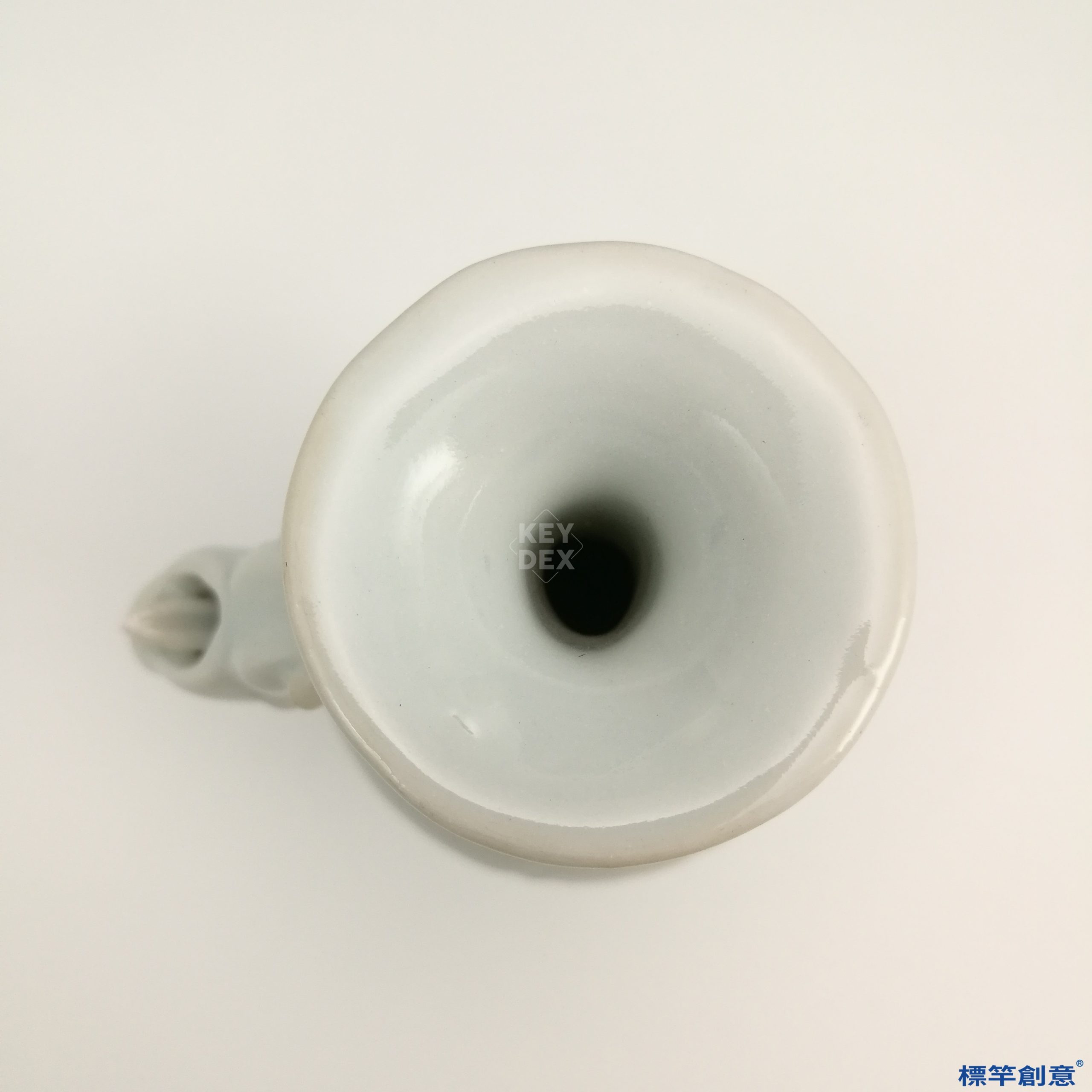 本器高11公分,腹徑約6公分,小型瓶式結構,喇叭口、長頸、斂肩、鼓腹、小圈足。肩部一側附象首形流,對側有小系,比例勻稱,造型挺秀,屬典型淨瓶器形。