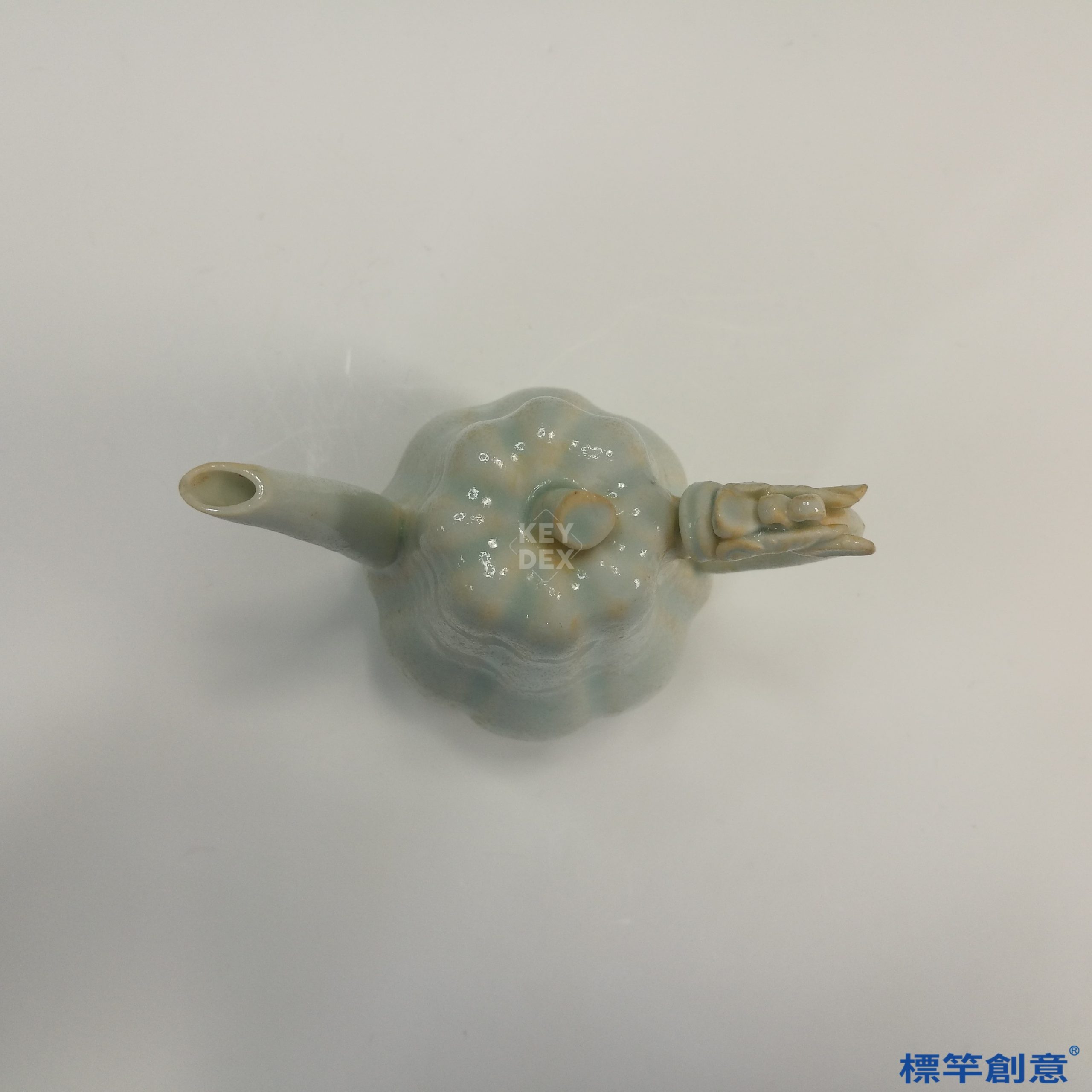 通體施淡青白釉,釉色青中帶白,柔和潤澤。胎體細密,施釉均勻,流與柄貼合精準。蓋上獸鈕為模印塑貼,栩栩如生。底部釉薄,圈足火石紅明顯,為匣缽燒造痕跡。