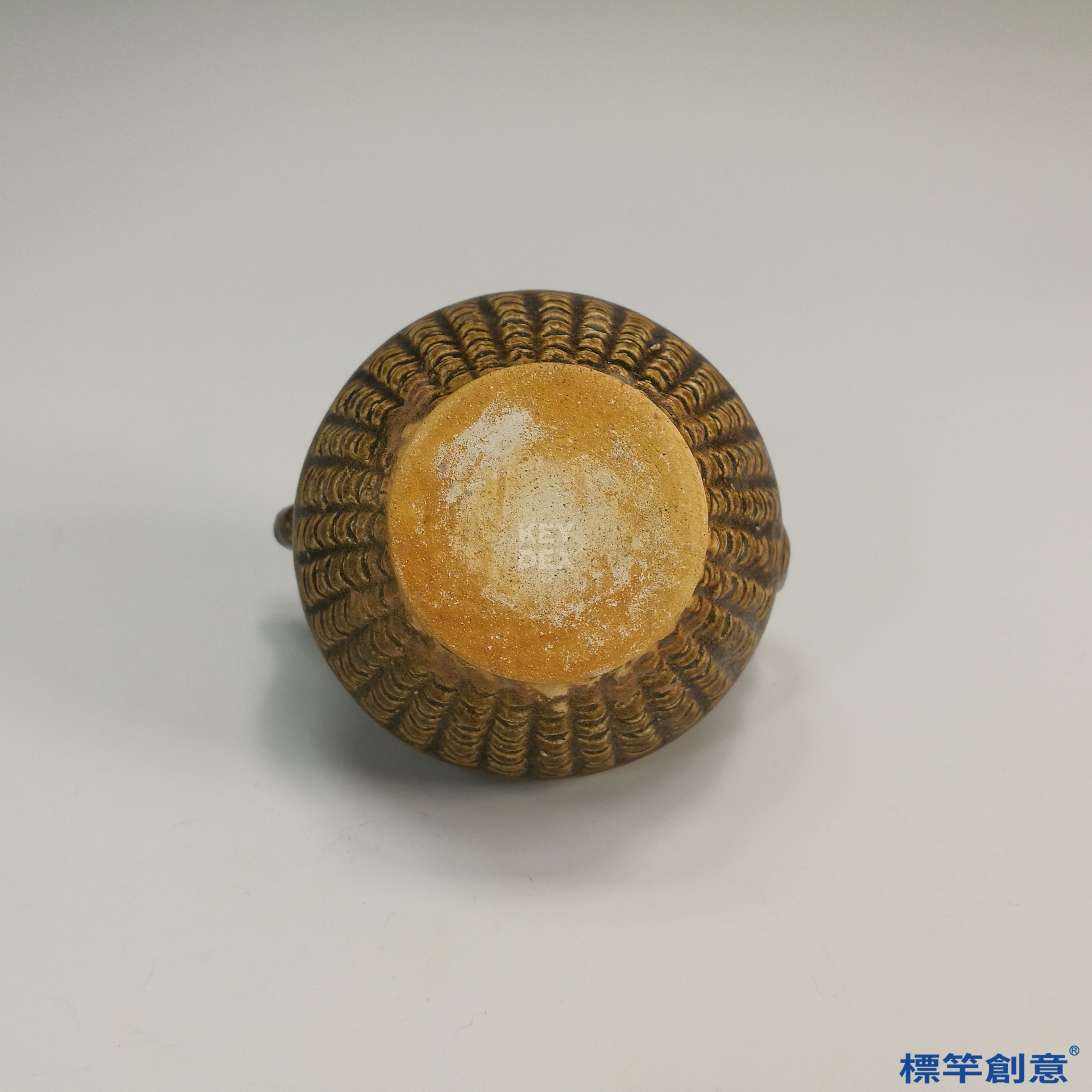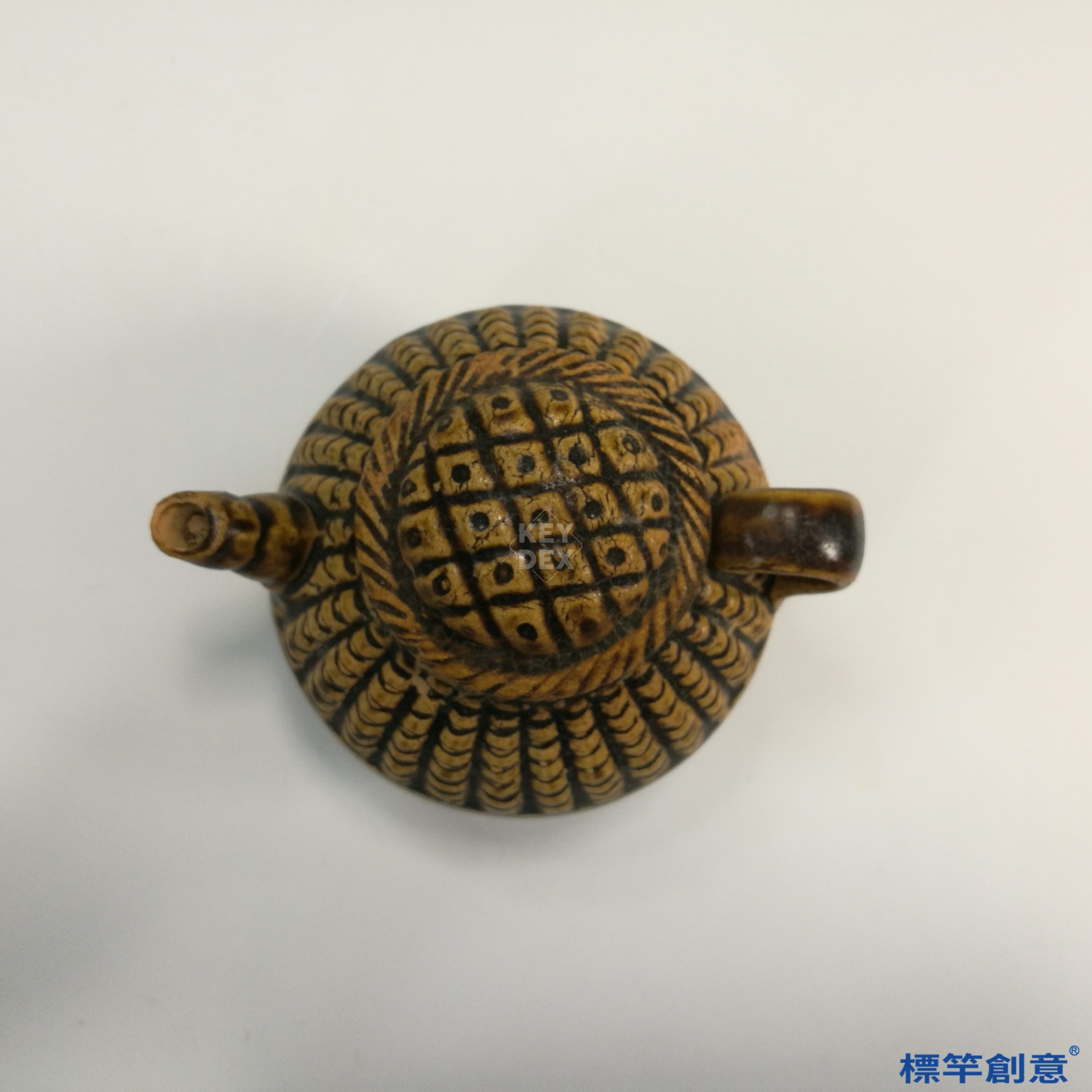 通體施醬釉,釉色深褐泛赭,局部流釉露胎,與粗織紋理構成強烈對比。壺體上下各施不同模印紋飾:上部為魚鱗簍狀,下部似竹編籃紋,蓋面則為圓放射網狀。器表肌理細密,強調實用與裝飾合一。