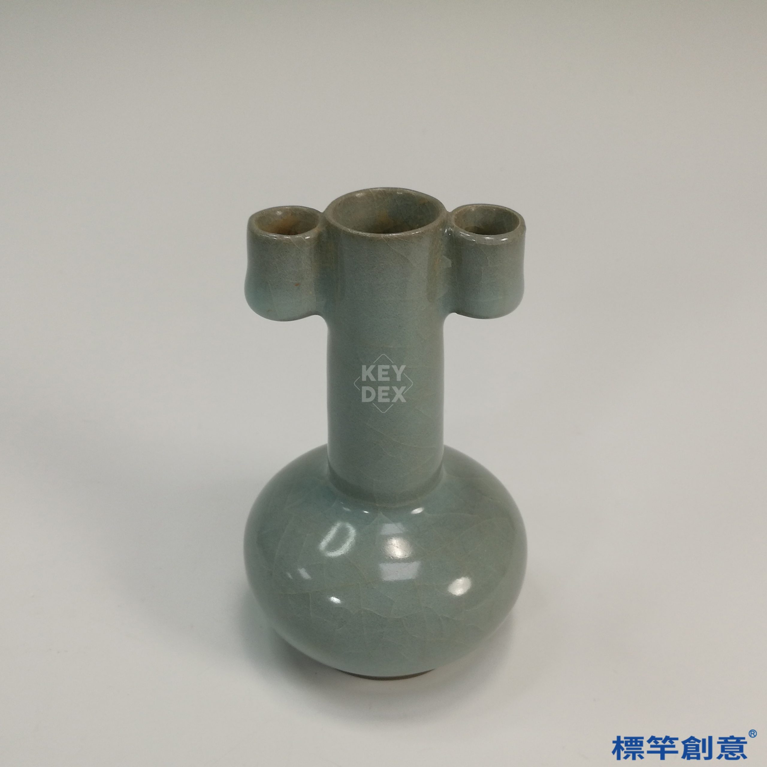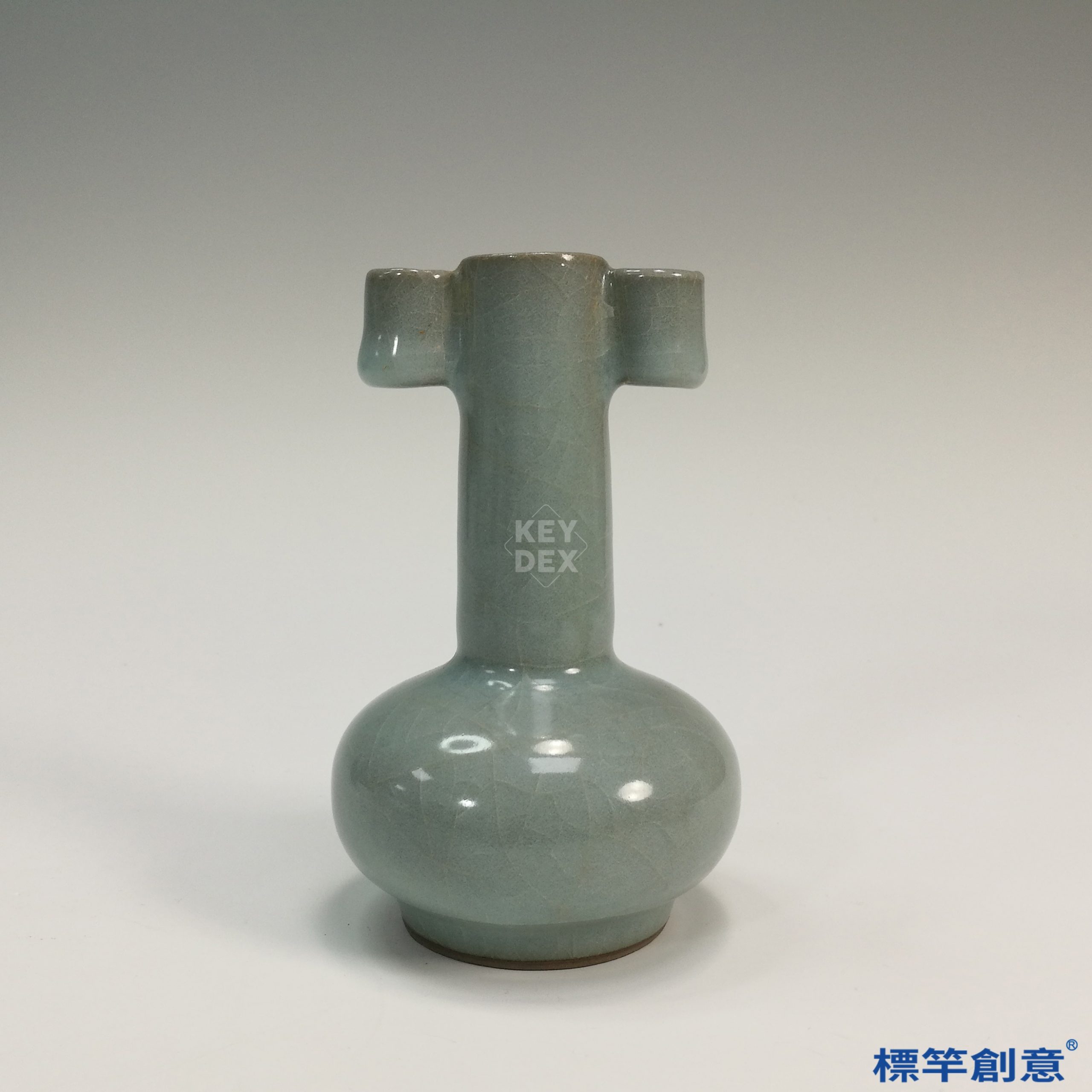 通體施青釉,釉層肥厚滋潤,色澤均勻,泛淡灰綠青色,具細密開片。全器素面無紋,僅以比例與結構呈現宋瓷之簡約美學。